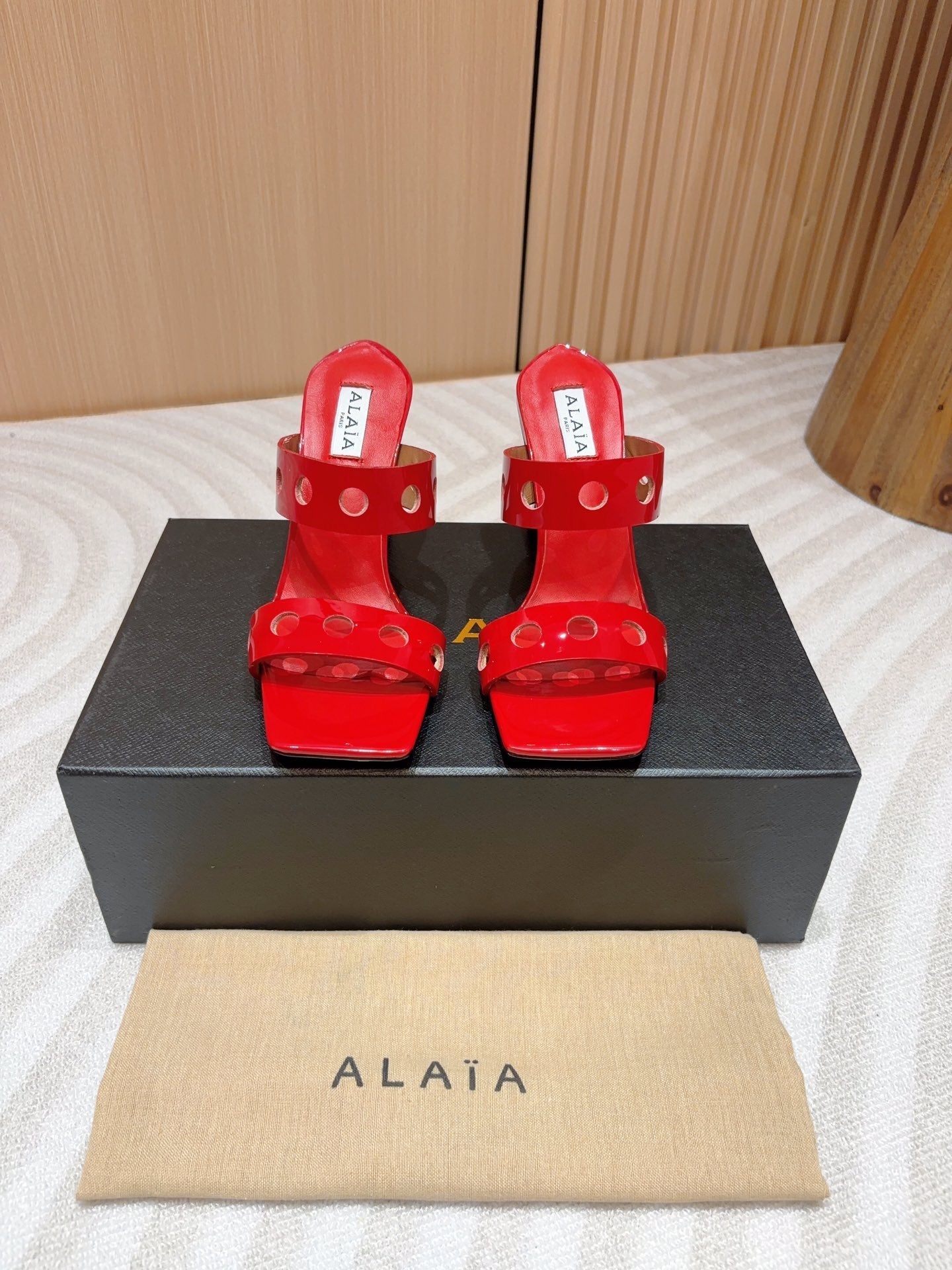 ALAIA TWO-STRAPS HIGH HEEL SANDALS IN CHERRY RED PATENT LAMBSKIN