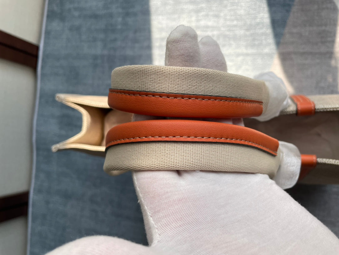 LAGRE WOODY TOTE BAG 45 IN BEIGE LINEN CANVAS BLACK WEBBING LOGO EMBROIDER ORANGE CALFSKIN