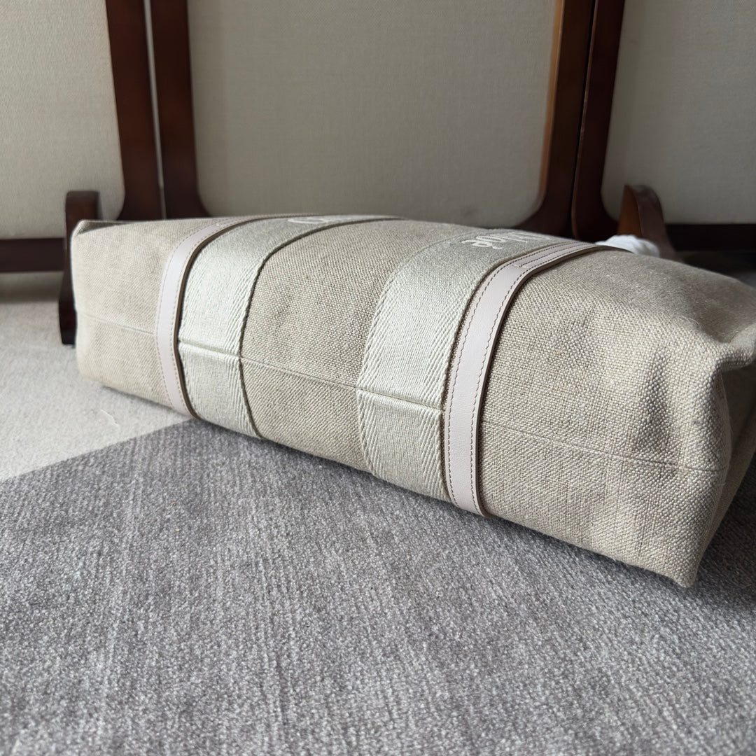 LAGRE WOODY TOTE BAG 45 IN BEIGE LINEN CANVAS WEBBING LOGO EMBROIDER COTTON WHITE CALFSKIN