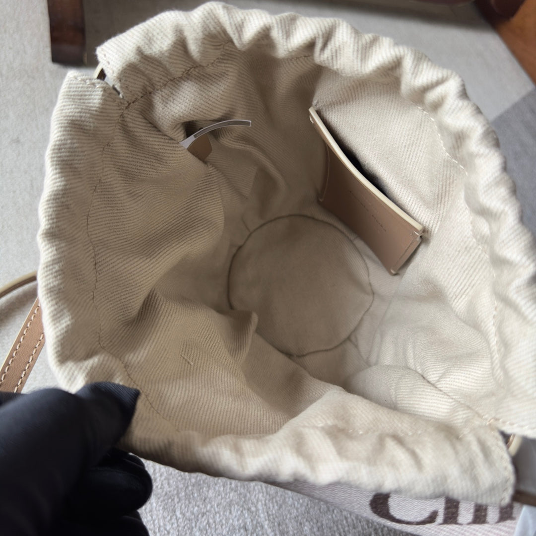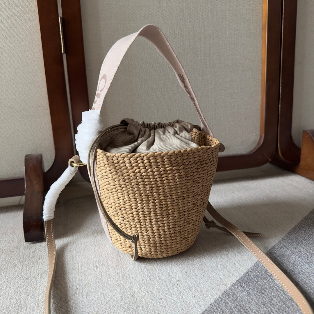 SMALL WOODY BASKET 17 IN NATURAL FIBERS BLUSHY BEIGE WEBBING BROWN CALFSKIN