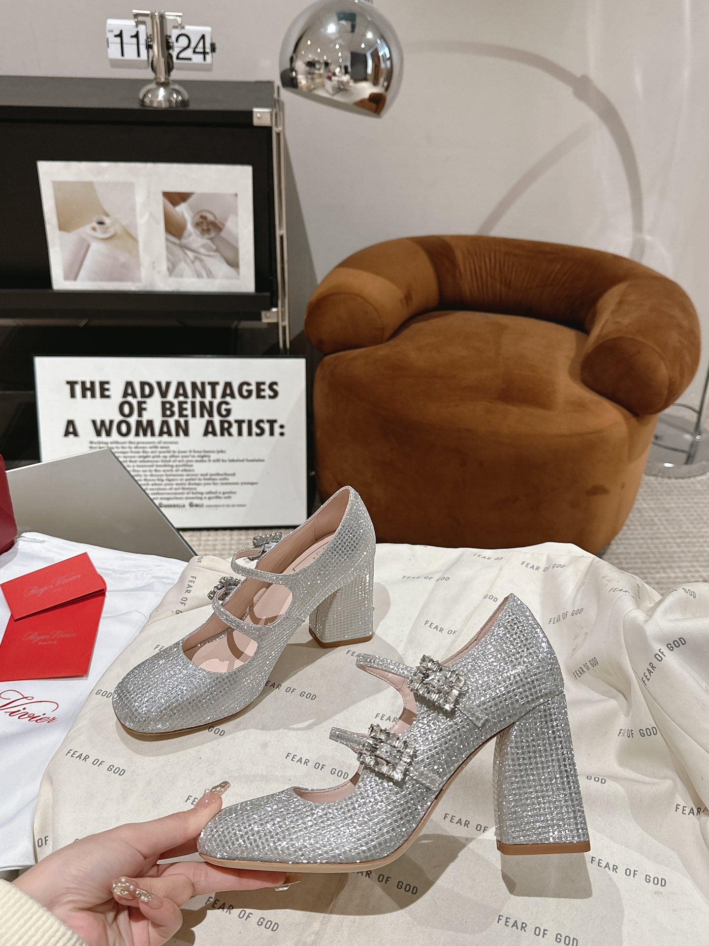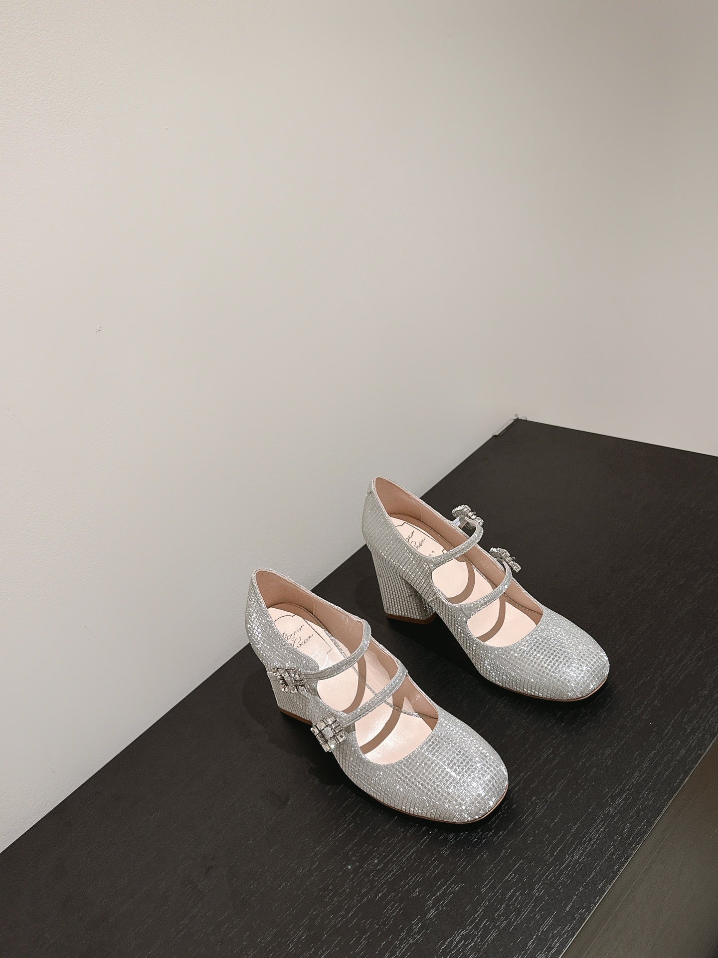 TRÈS VIVIER MARY JANE DOUBLE-STRAP PUMPS IN SILVER CALFSKIN FULLY EMBELLISHED CRYSTALS