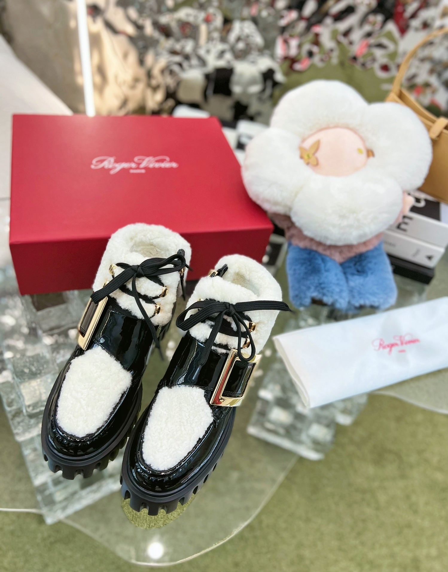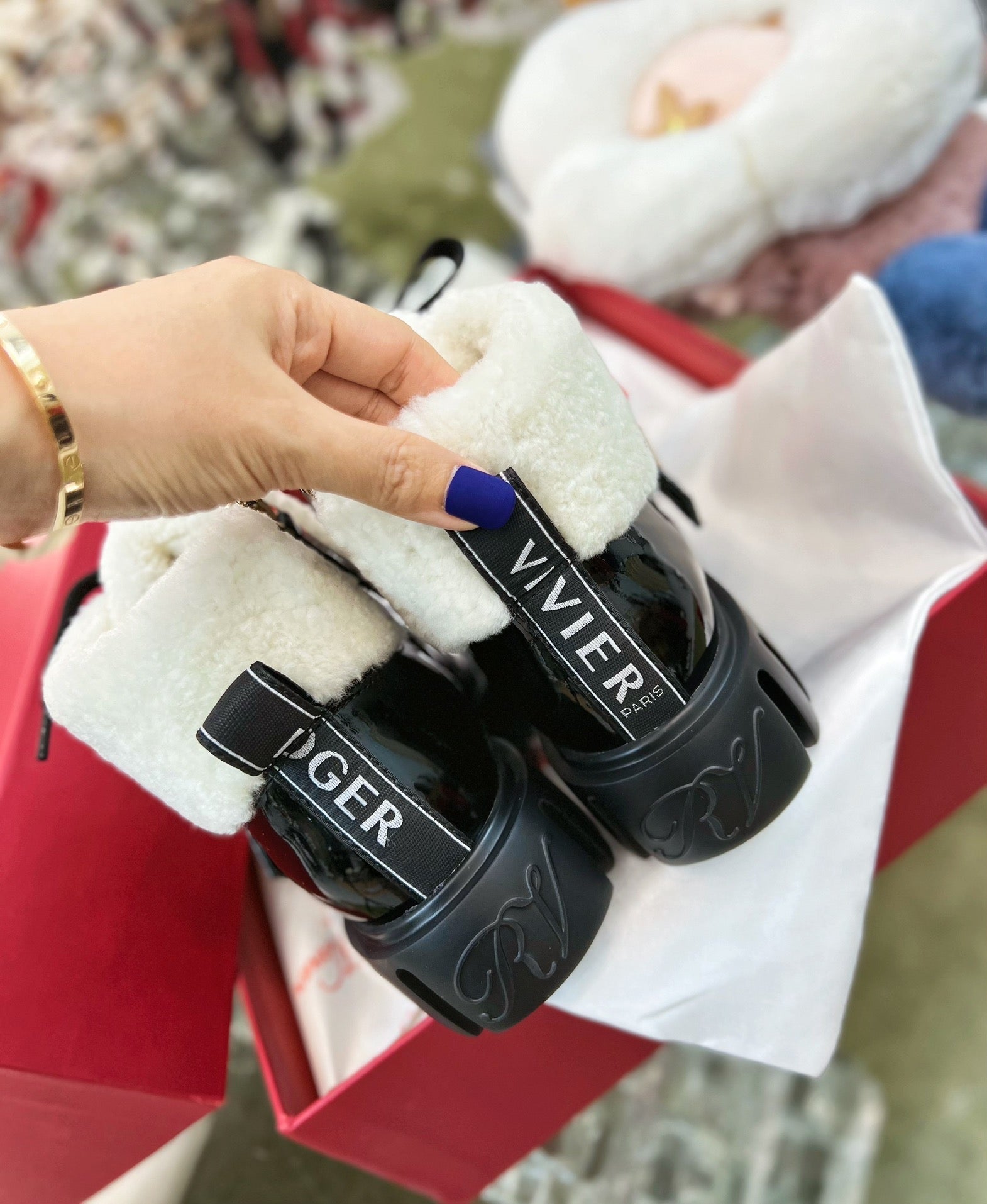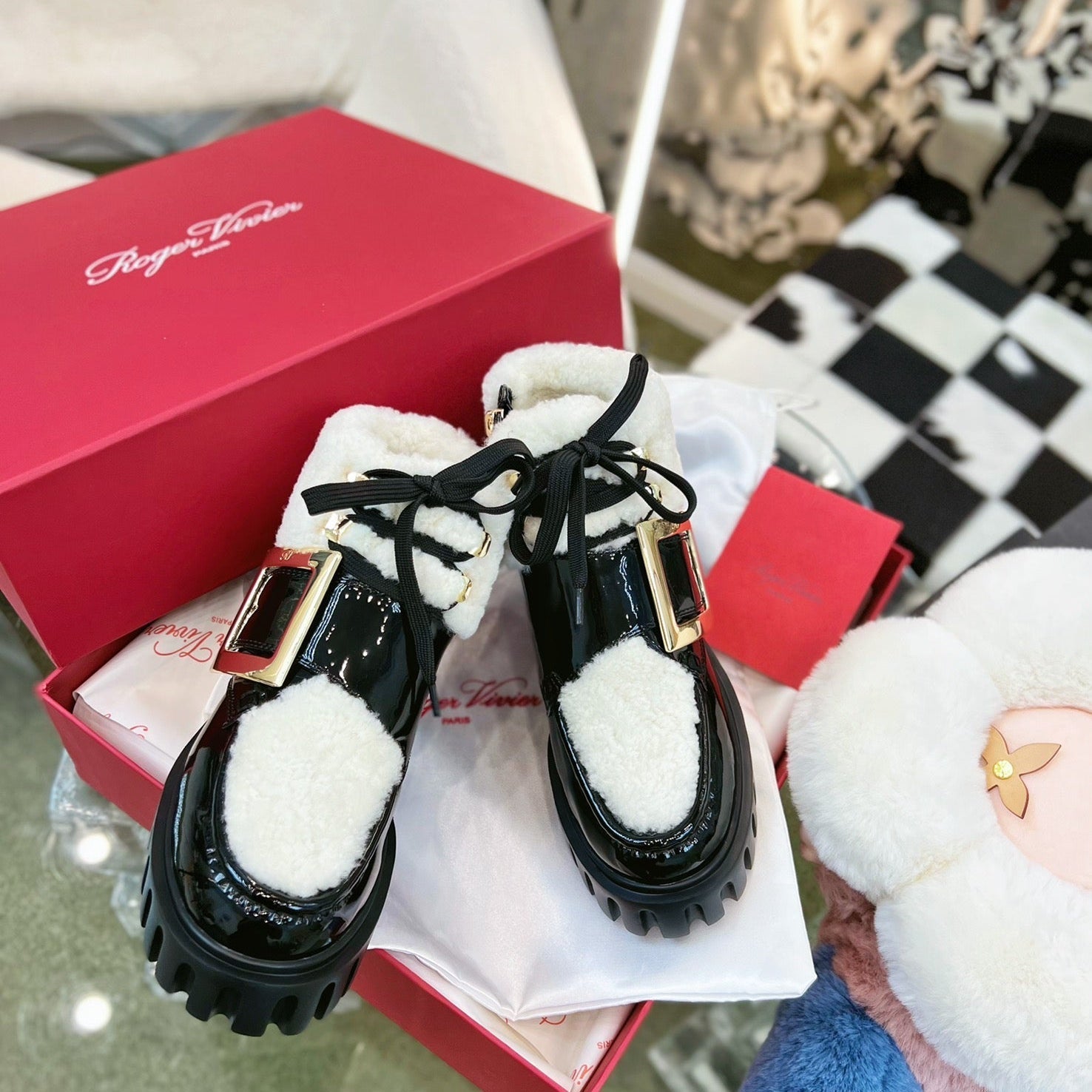 VIV' GO THICK ANKLE BOOTS IN BLACK CALFSKIN AND SHEARLING WITH GOLD BUCKLE