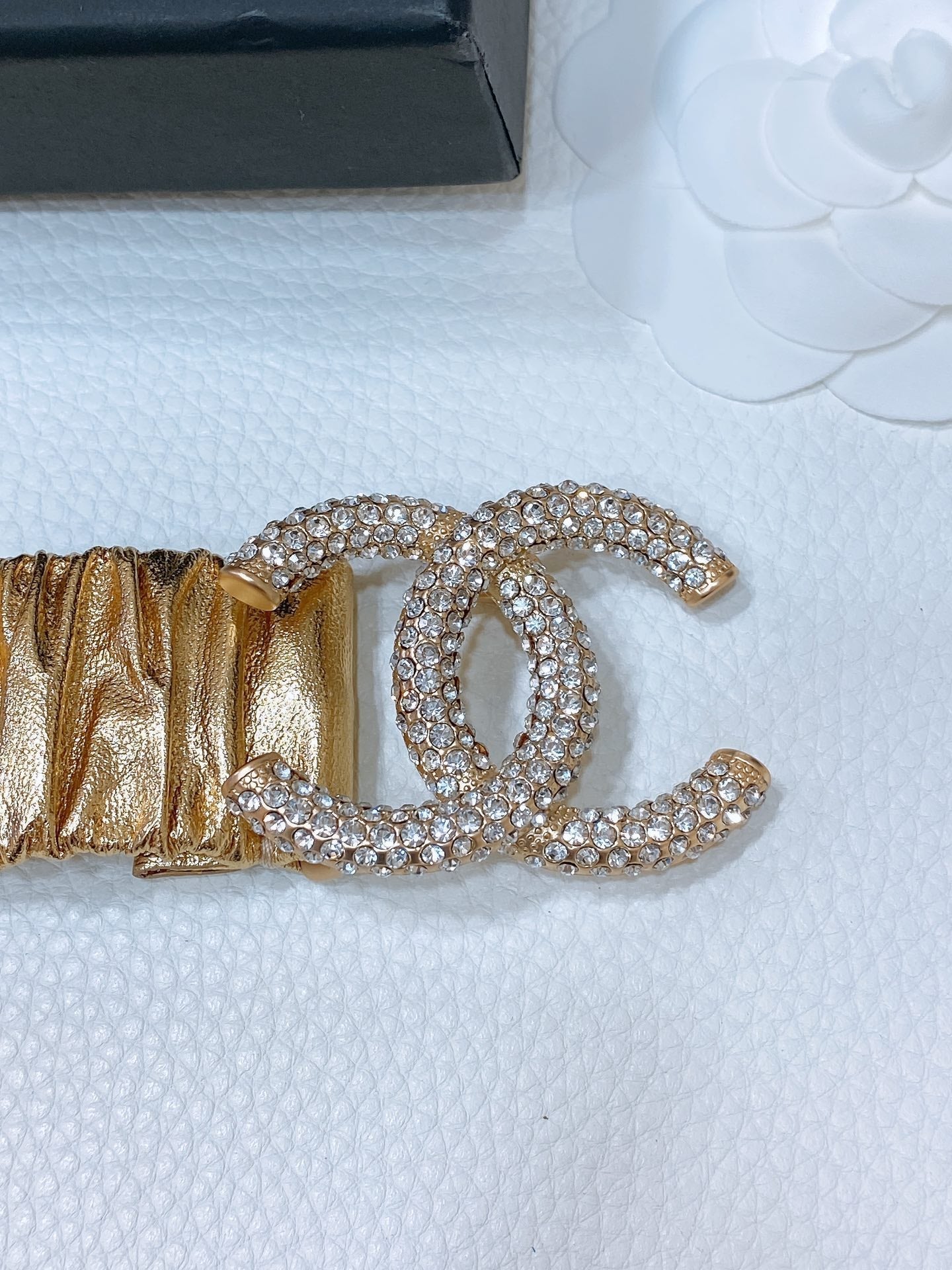 CC ELASTIC BELT 30MM IN GOLD CALFSKIN GOLD HARDWARE WITH RHINSTONES