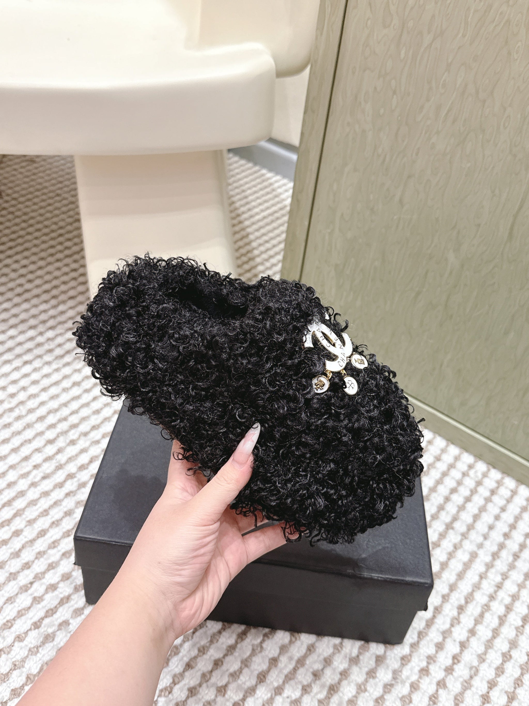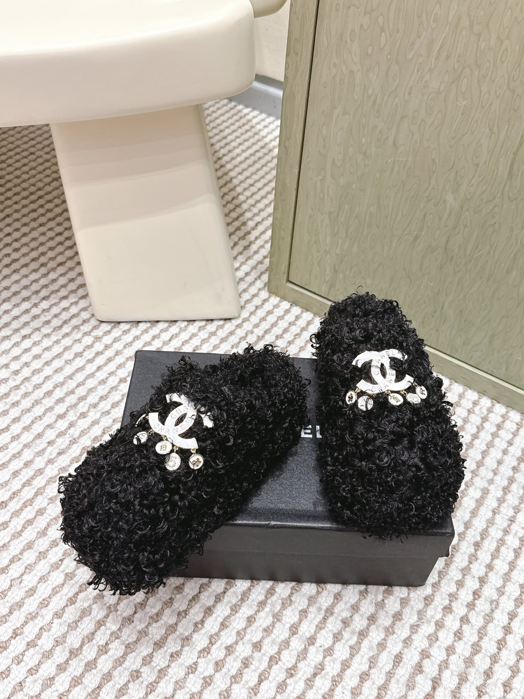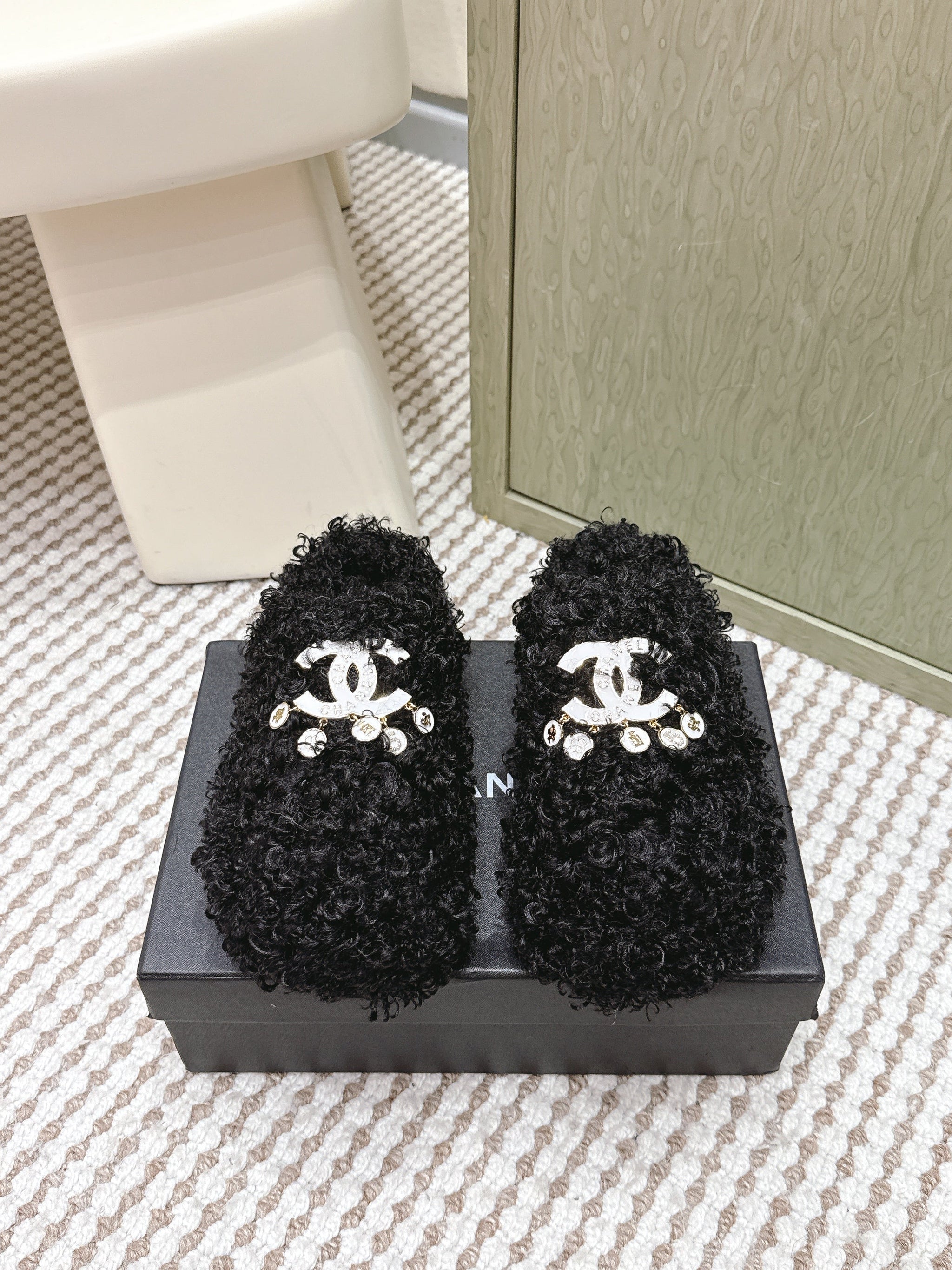 CHANEL 25S CLASSIC FURRY SLIDES IN BLACK WITH DOUBLE C LOGO