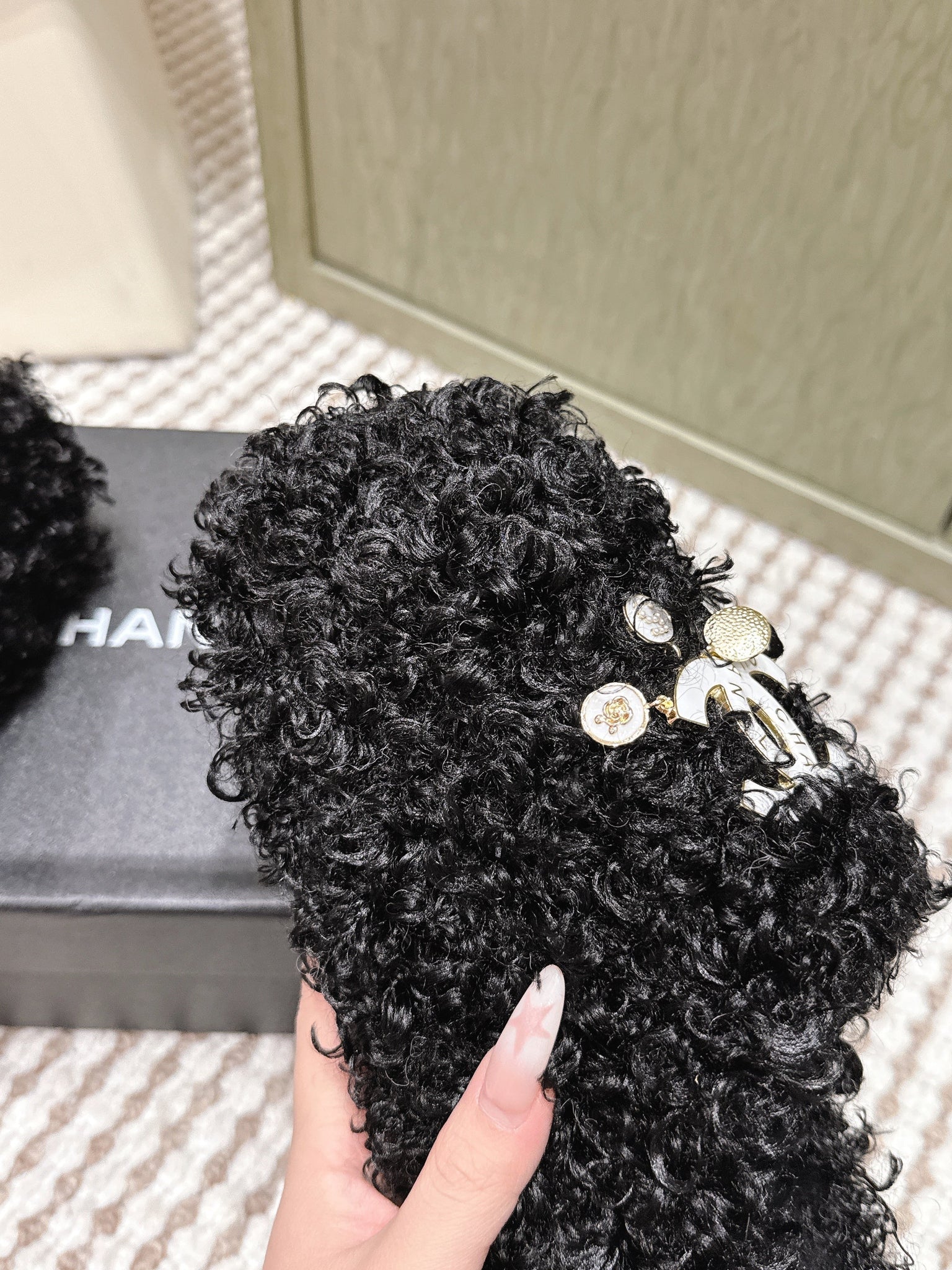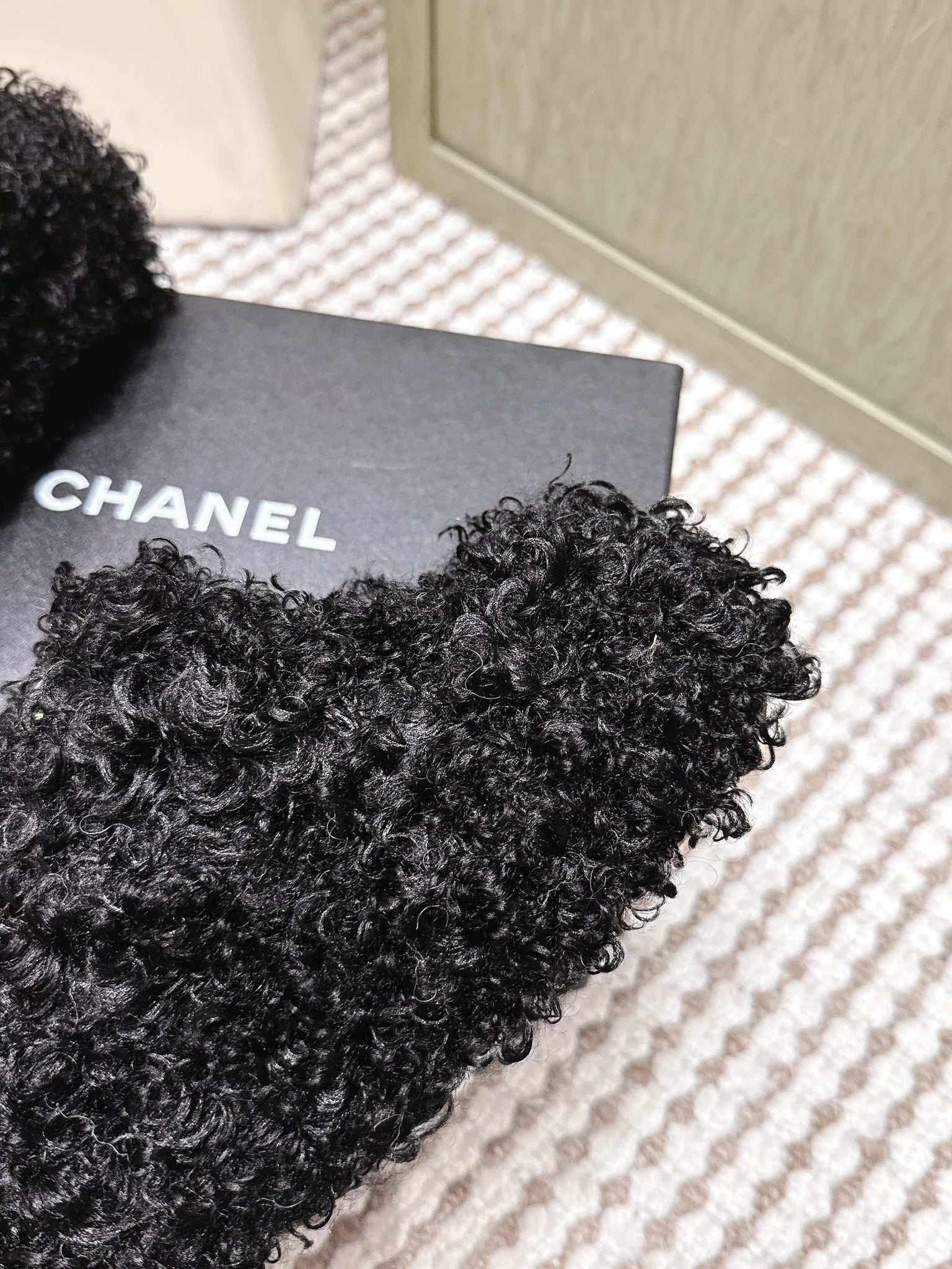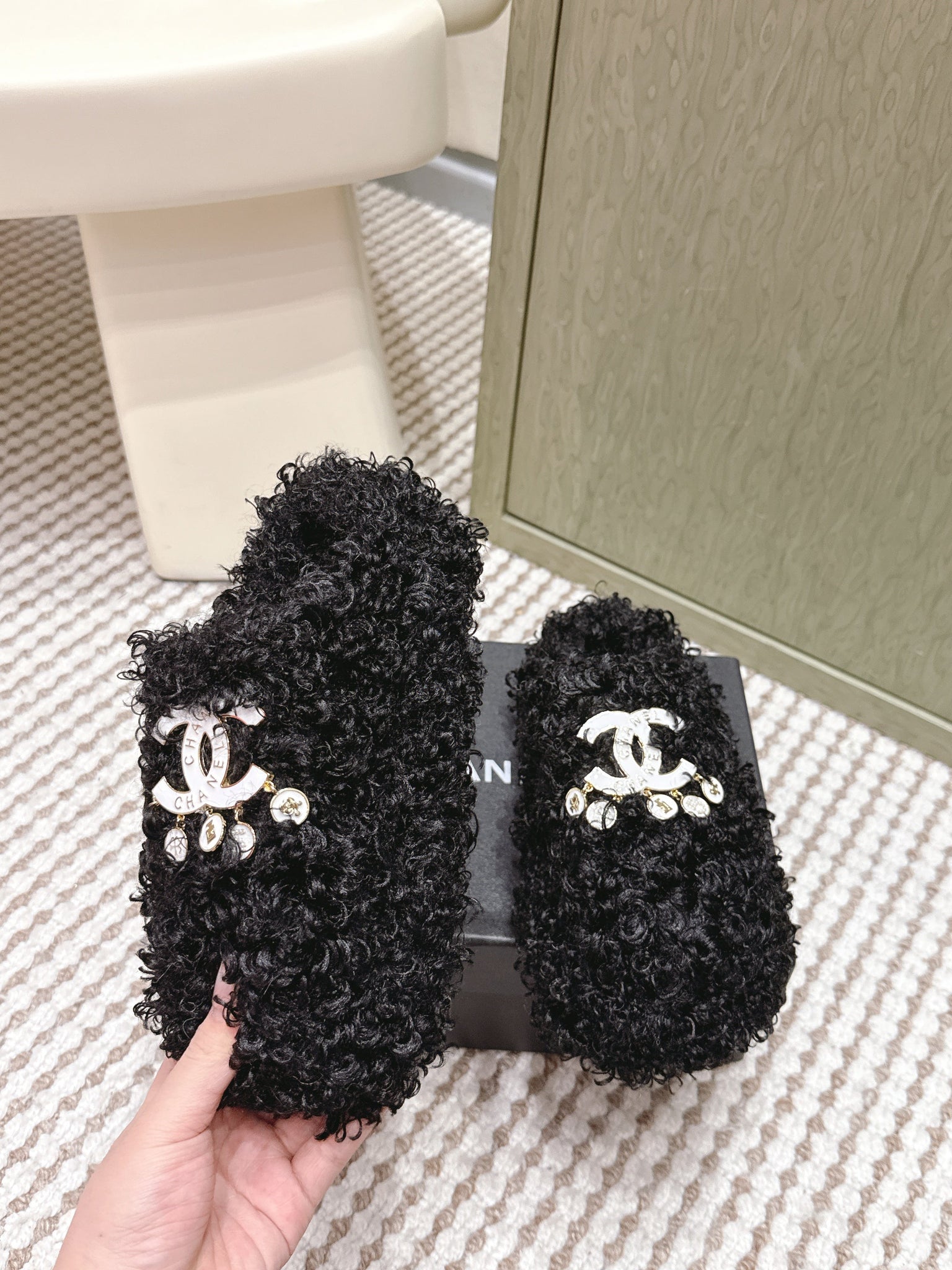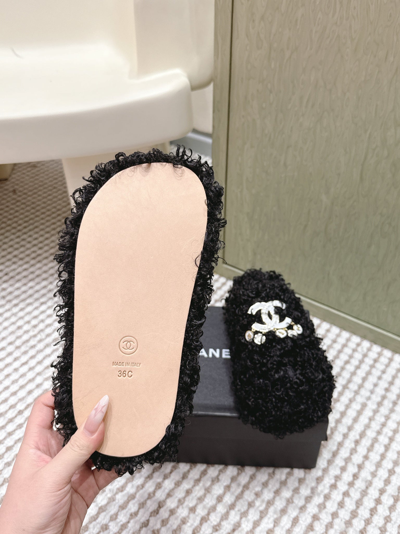 CHANEL 25S CLASSIC FURRY SLIDES IN BLACK WITH DOUBLE C LOGO