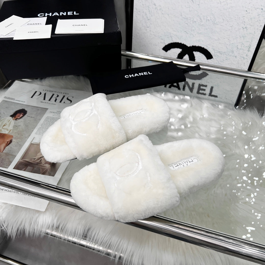 CHANEL 25S FUR SLIPPERS IN WHITE