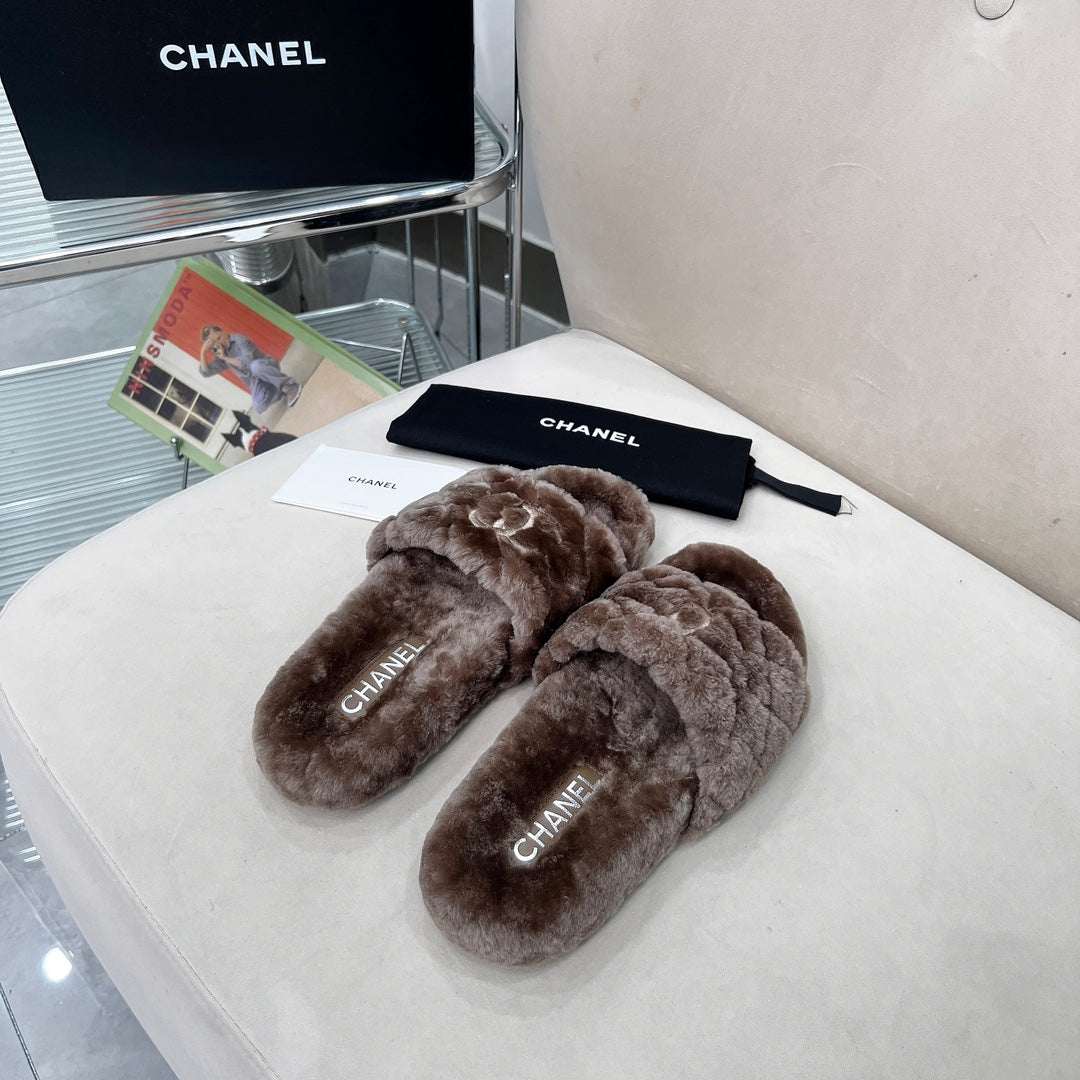 CHANEL 25S FUR SLIPPERS WITH EXPOSED-STITCH STRAPS IN DARK BROWN