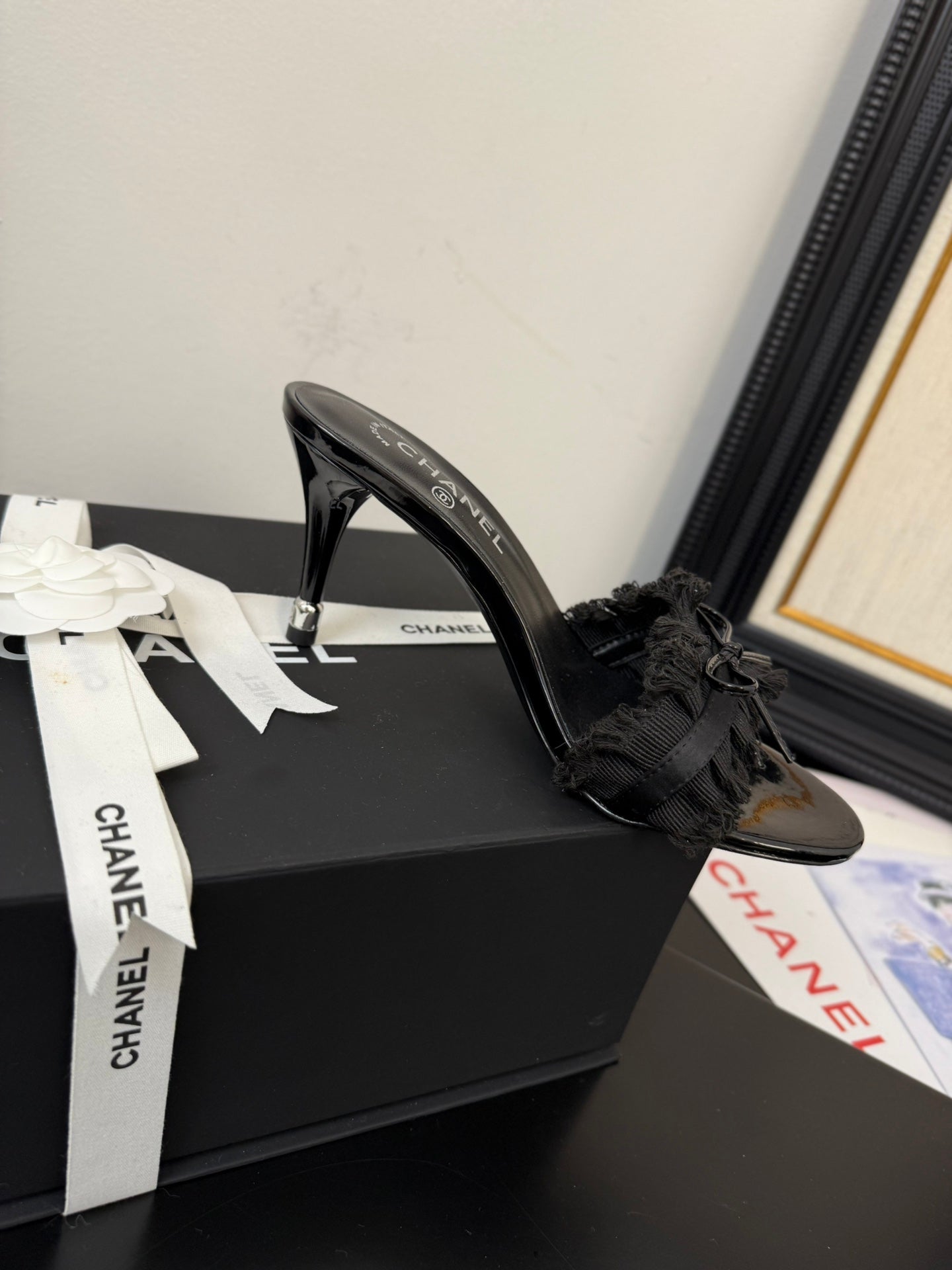 BLACK GROSGRAIN CANVAS BOW MULE SANDALS 90 MM