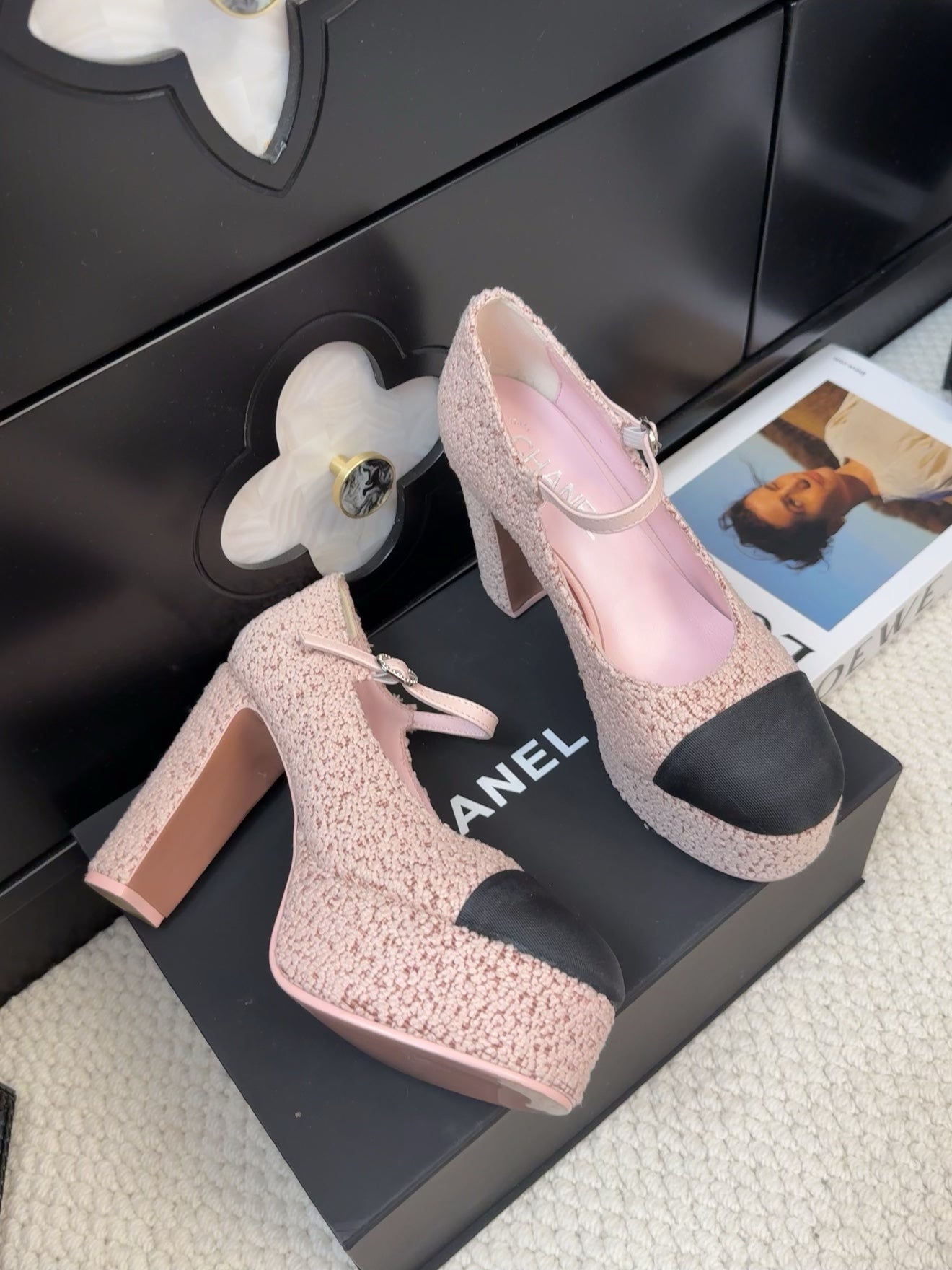 FLATFORM SANDAL IN LIGHT PINK TWEED AND BLACK FABRIC