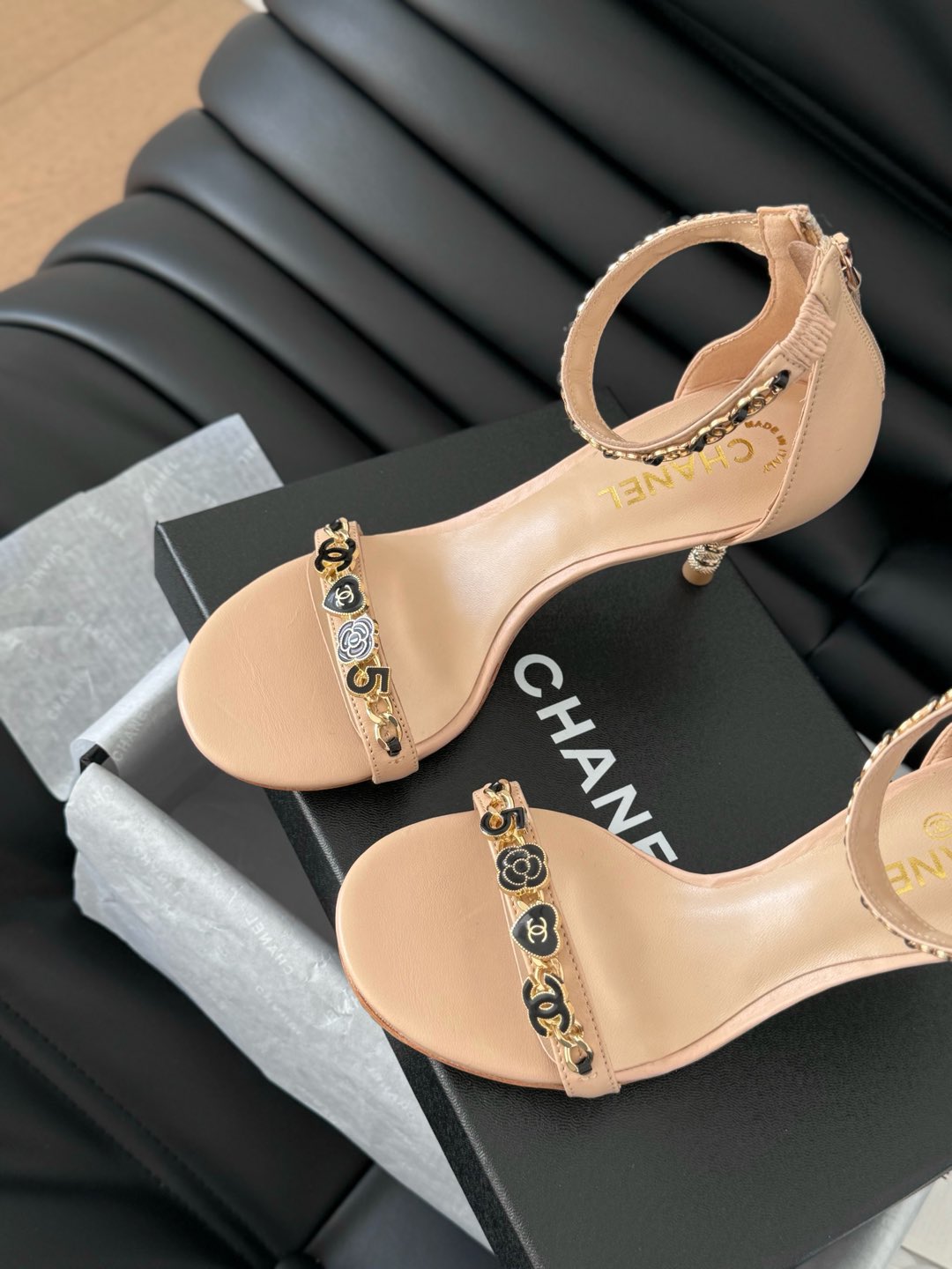 HIGH HEEL 7.5 MM SANDAL IN TAN BEIGE SHEEPSKIN WITH STICKERS