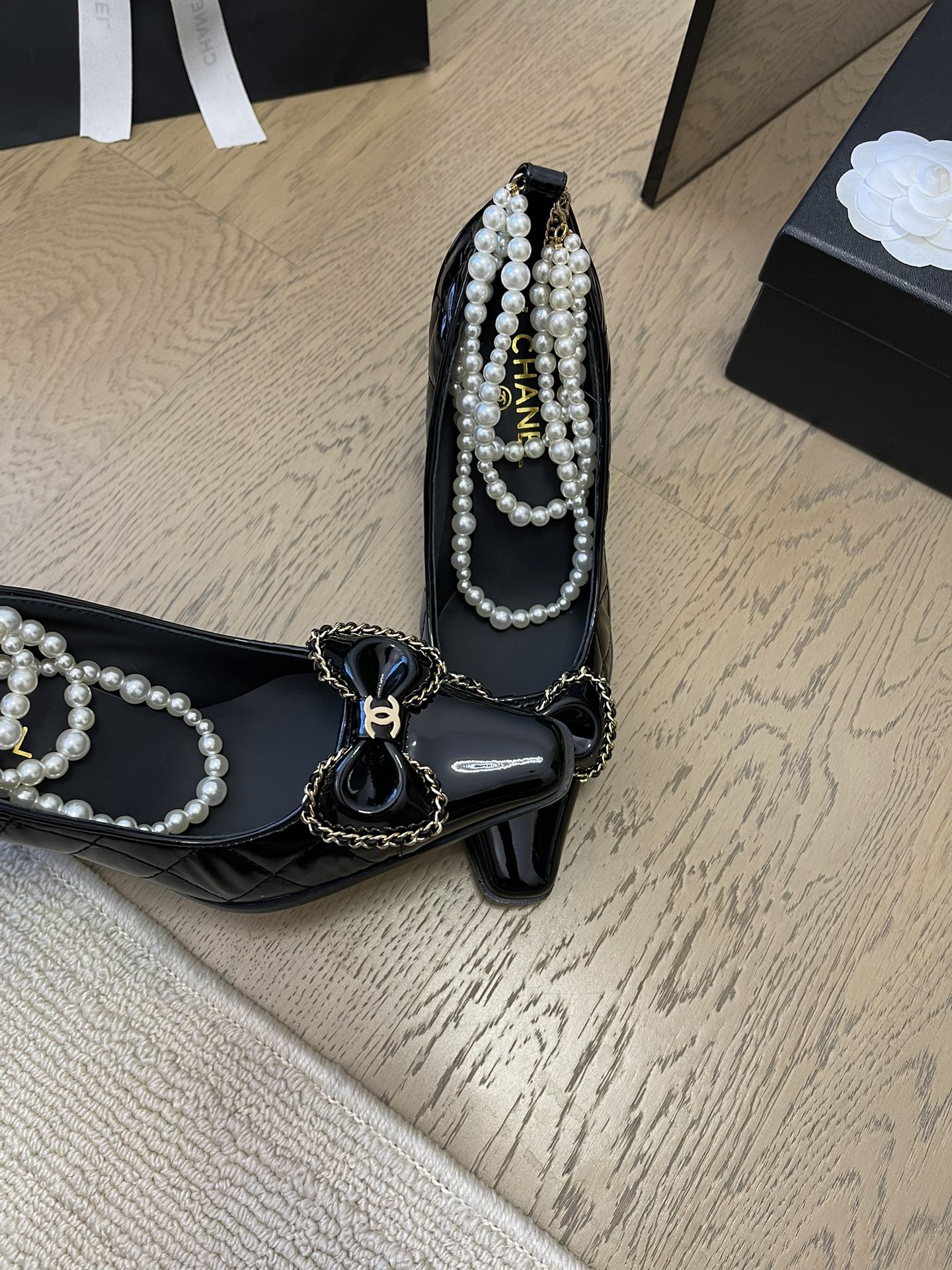 HIGH HEEL 8 CM IN BLACK CALFSKIN WITH PEARL CHAIN