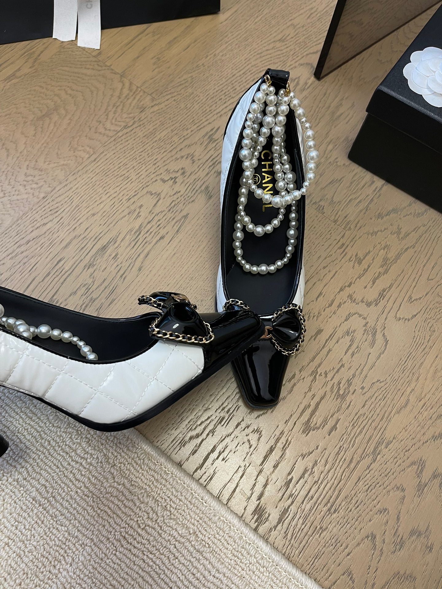 HIGH HEEL 8 CM IN WHITE MIX BLACK CALFSKIN WITH PEARL CHAIN