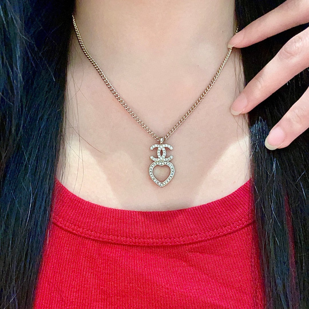 DOUBLE C HEART NECKLACE WITH CRYSTALS WHITE PEARLS AND SILVER METAL