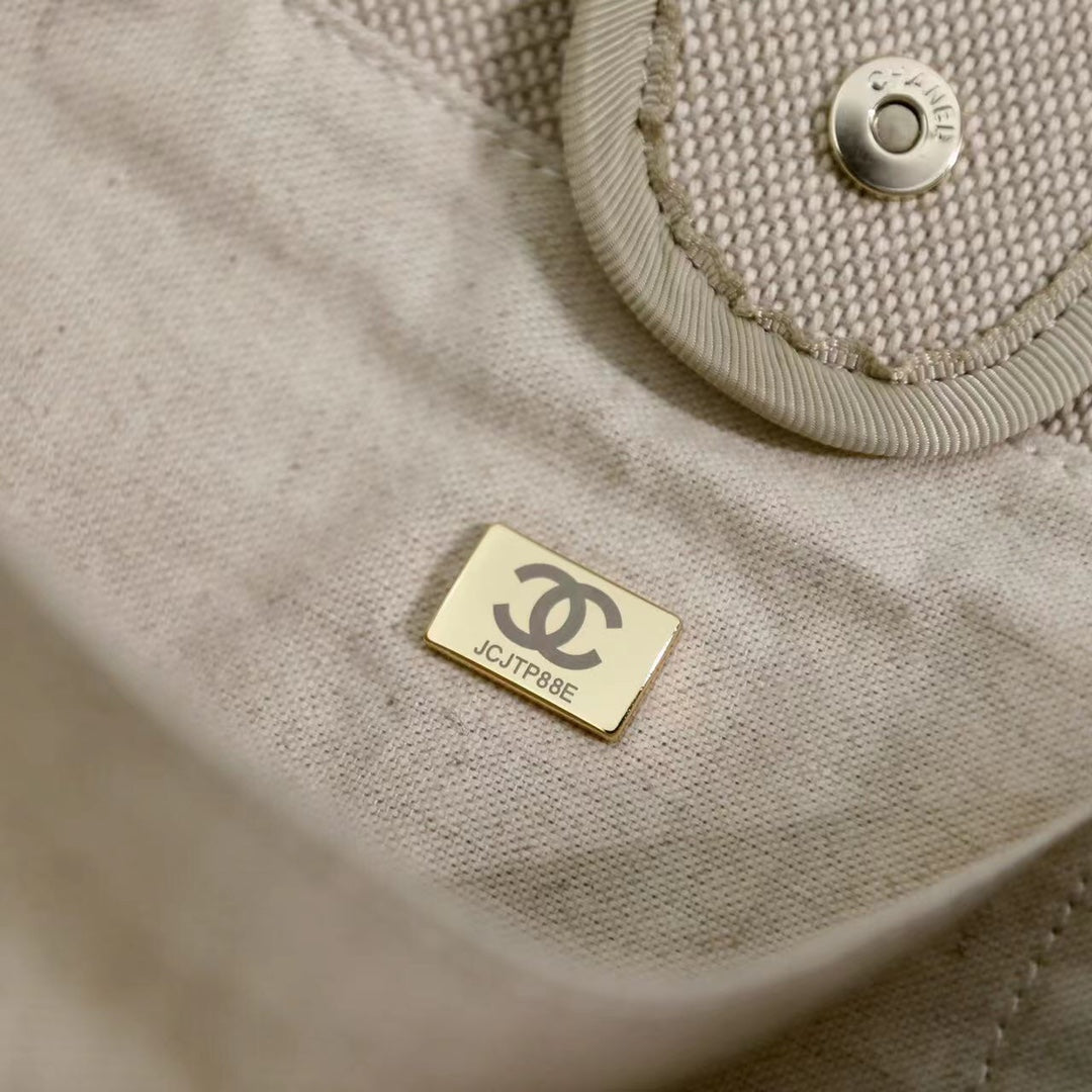 CC DEAUVILLE LARGE 39 TOTE BAG IN BEIGE CANVAS WITH LIGHT BLUE CHAIN