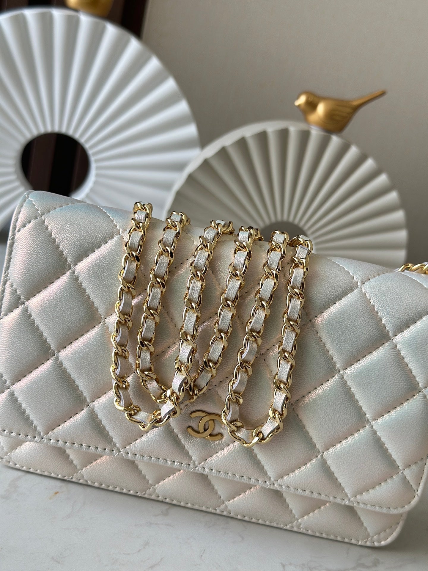 CHANEL 25S WALLET ON CHAIN 19 IN PEARL WHITE LAMBSKIN