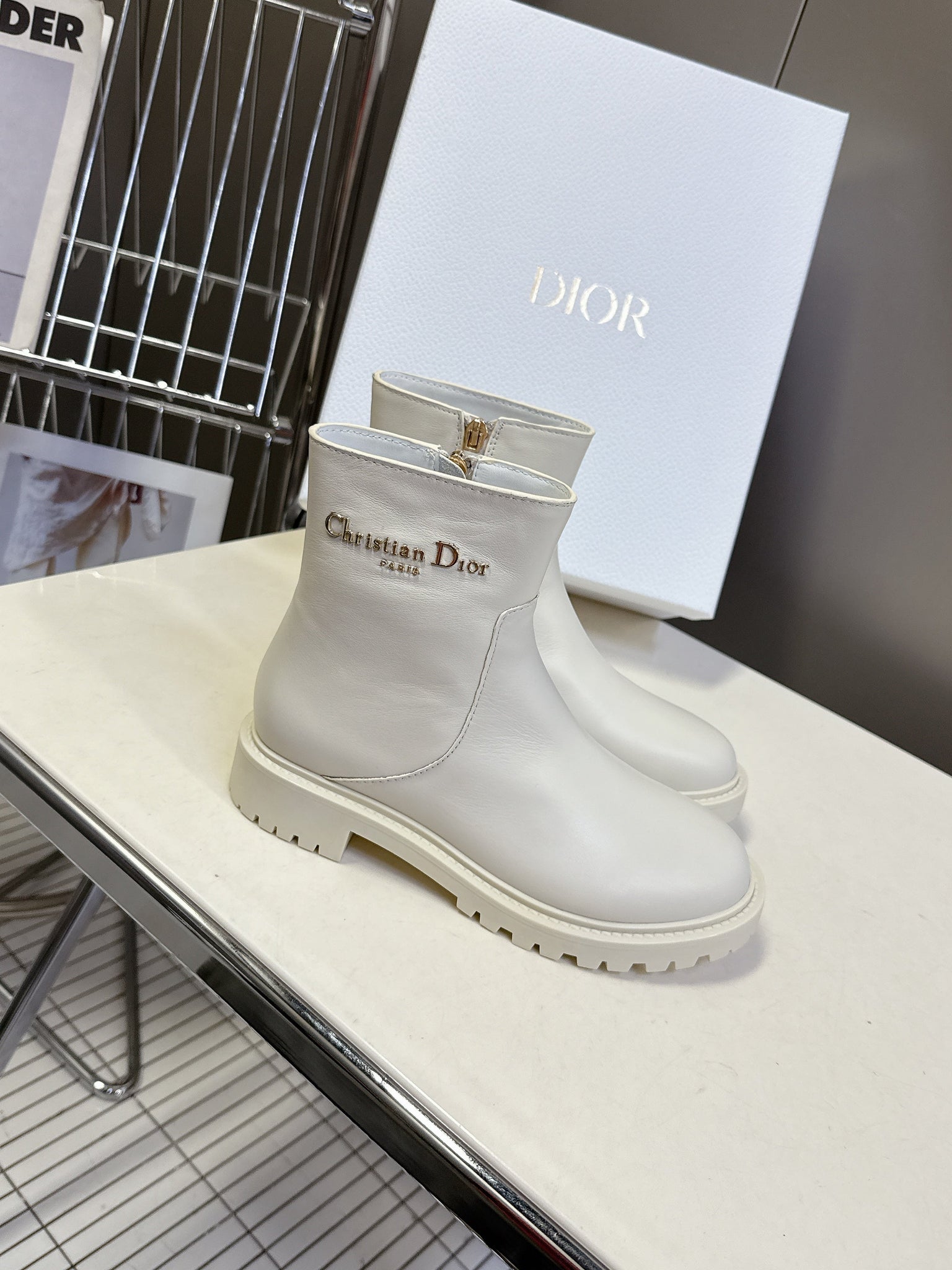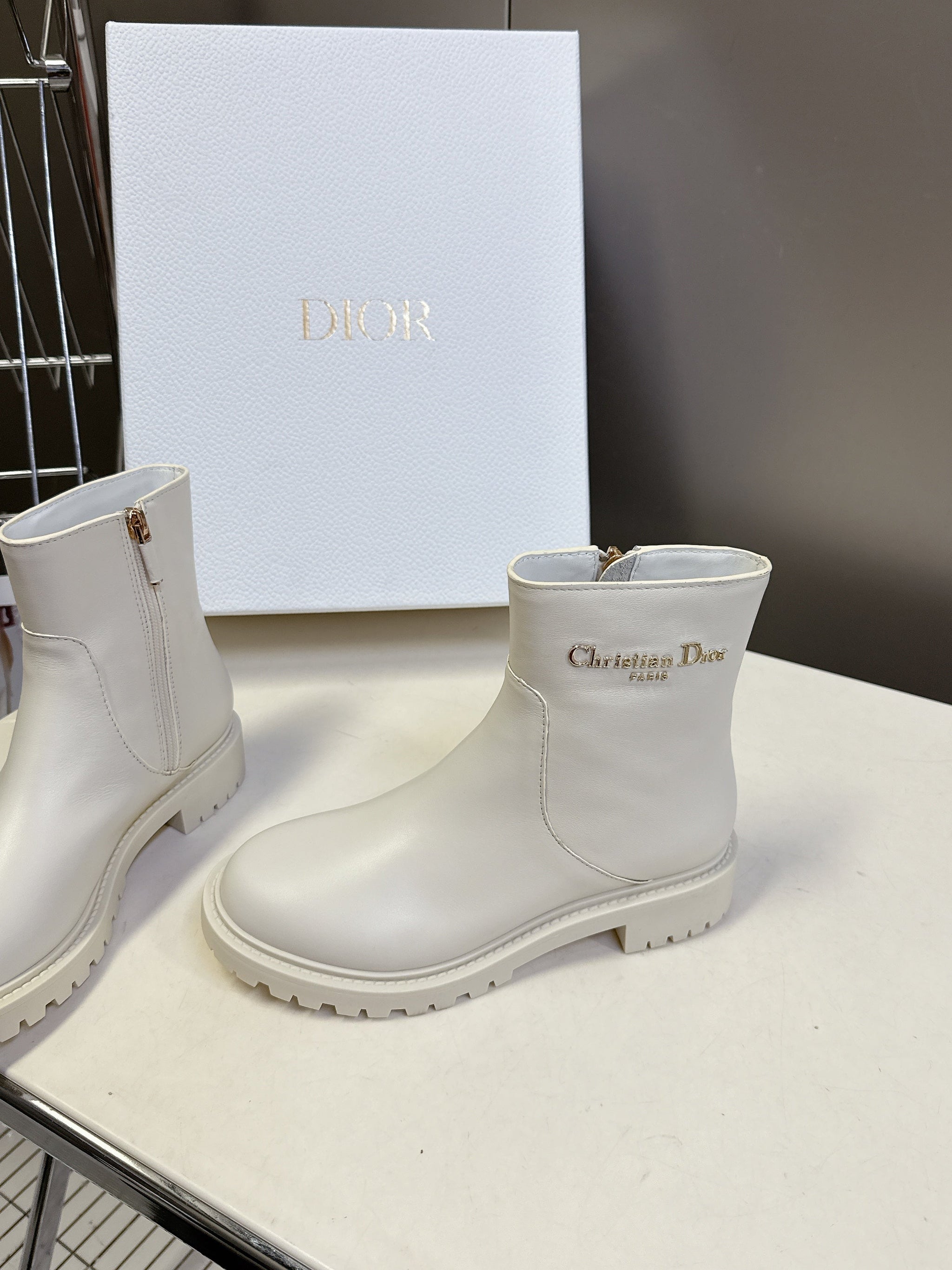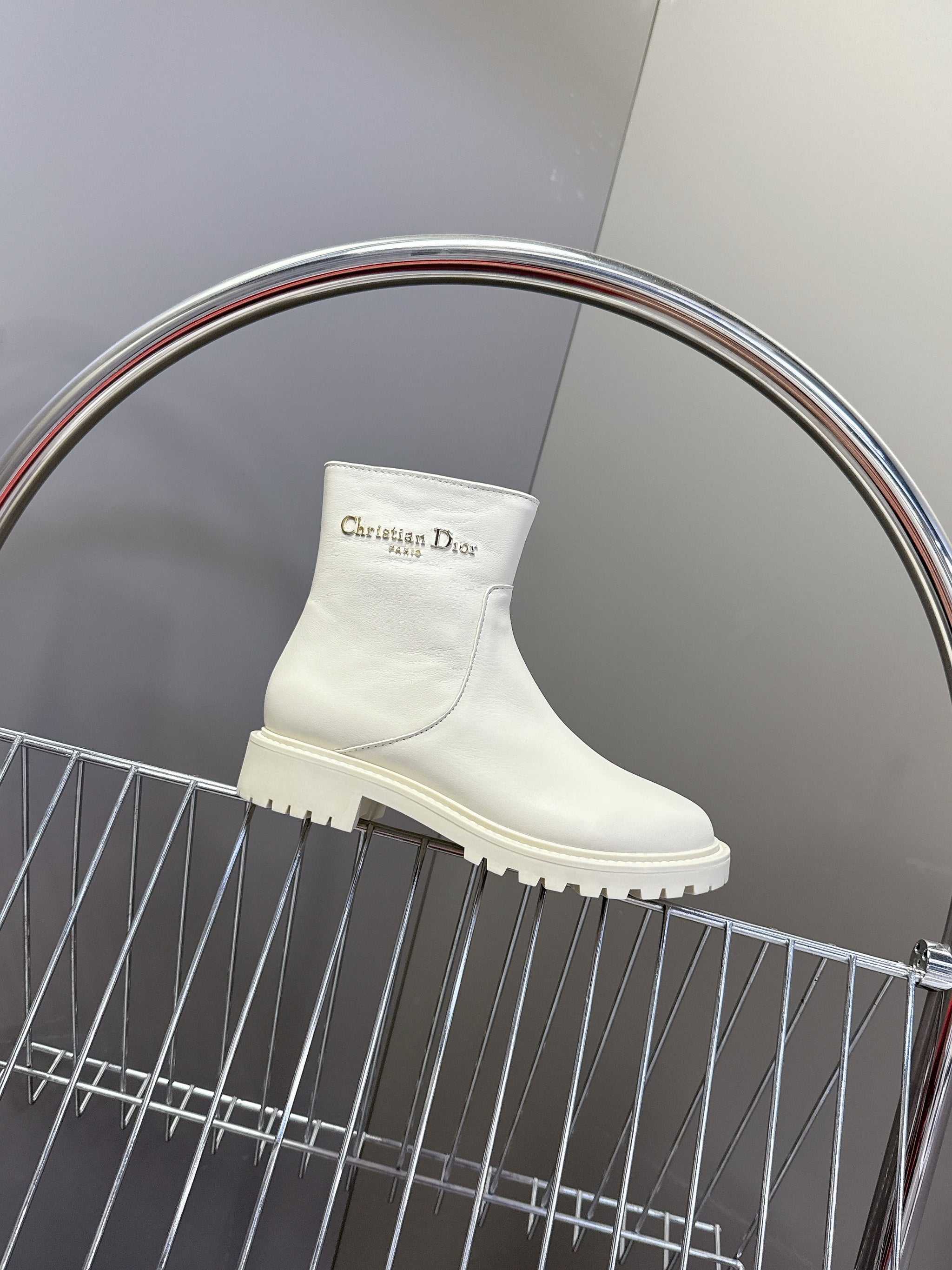 DIOR 25S D-MAJOR ANKLE BOOTS IN WHITE LAMBSKIN WITH GOLD HARDWARE