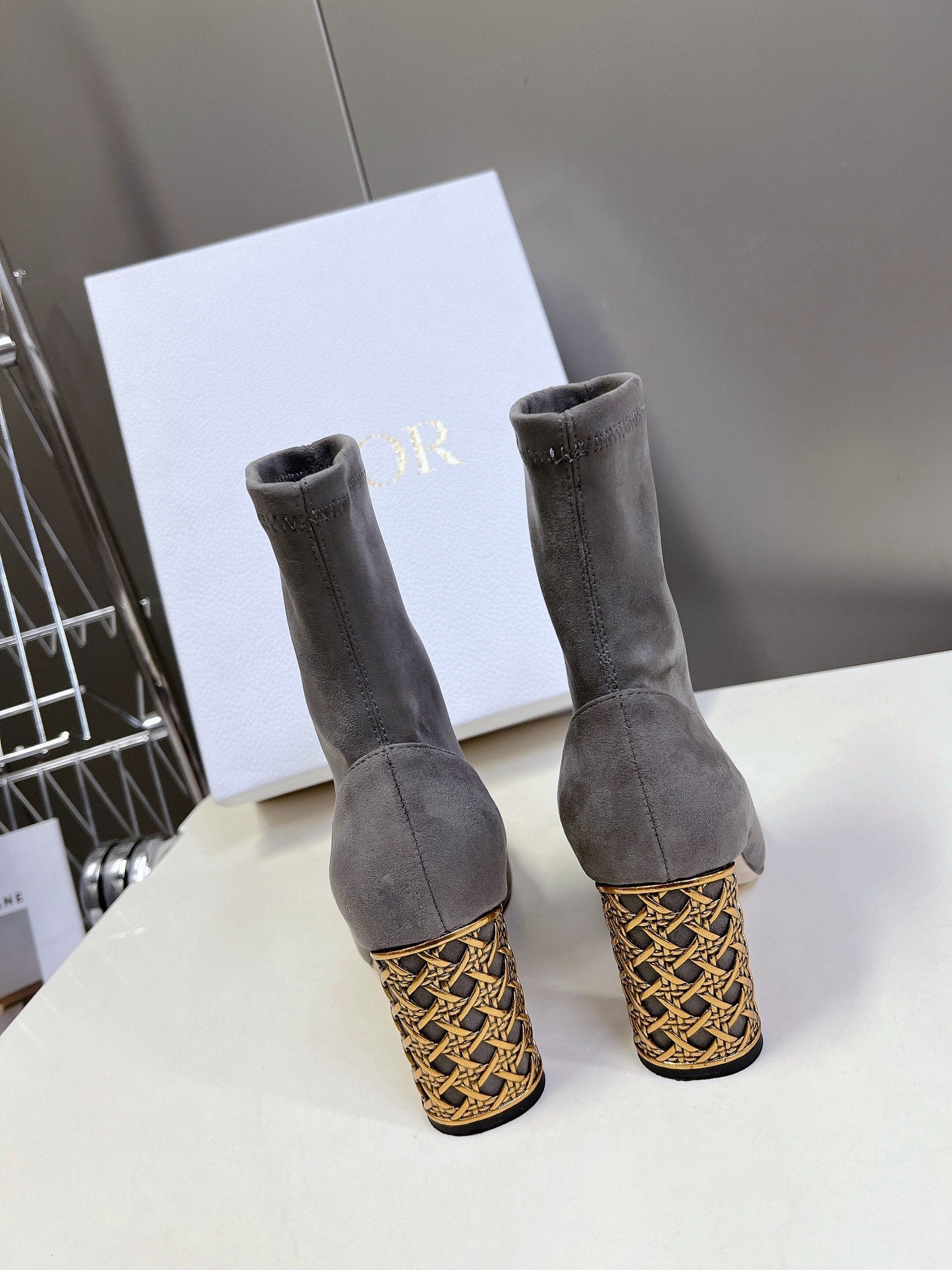 ICON HEELED ANKLE BOOT DOVE GRAY SUEDE 8 CM WITH GOLD LOGO