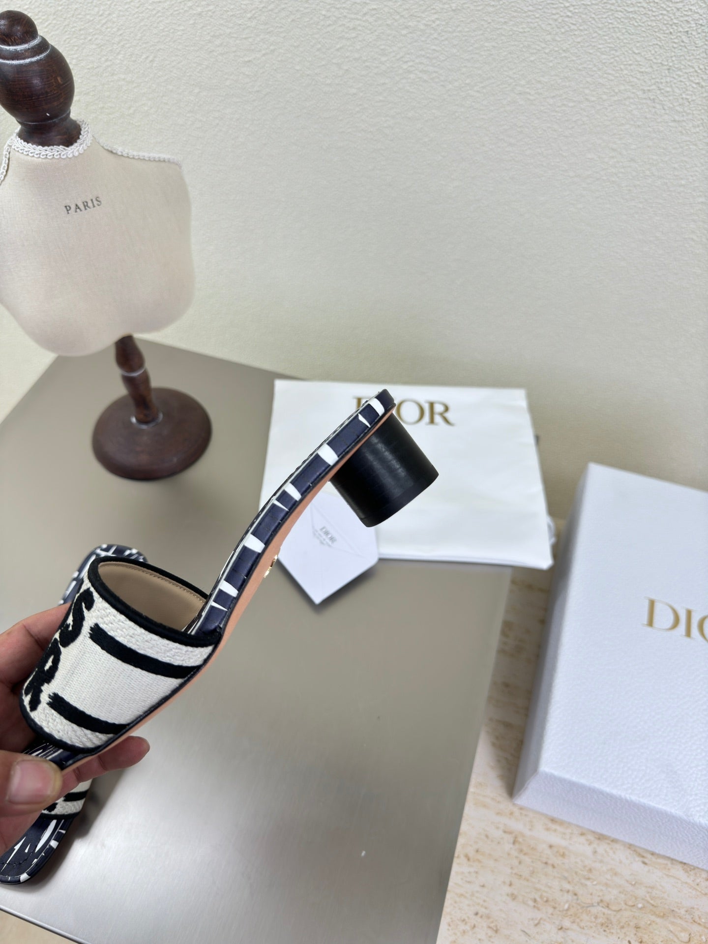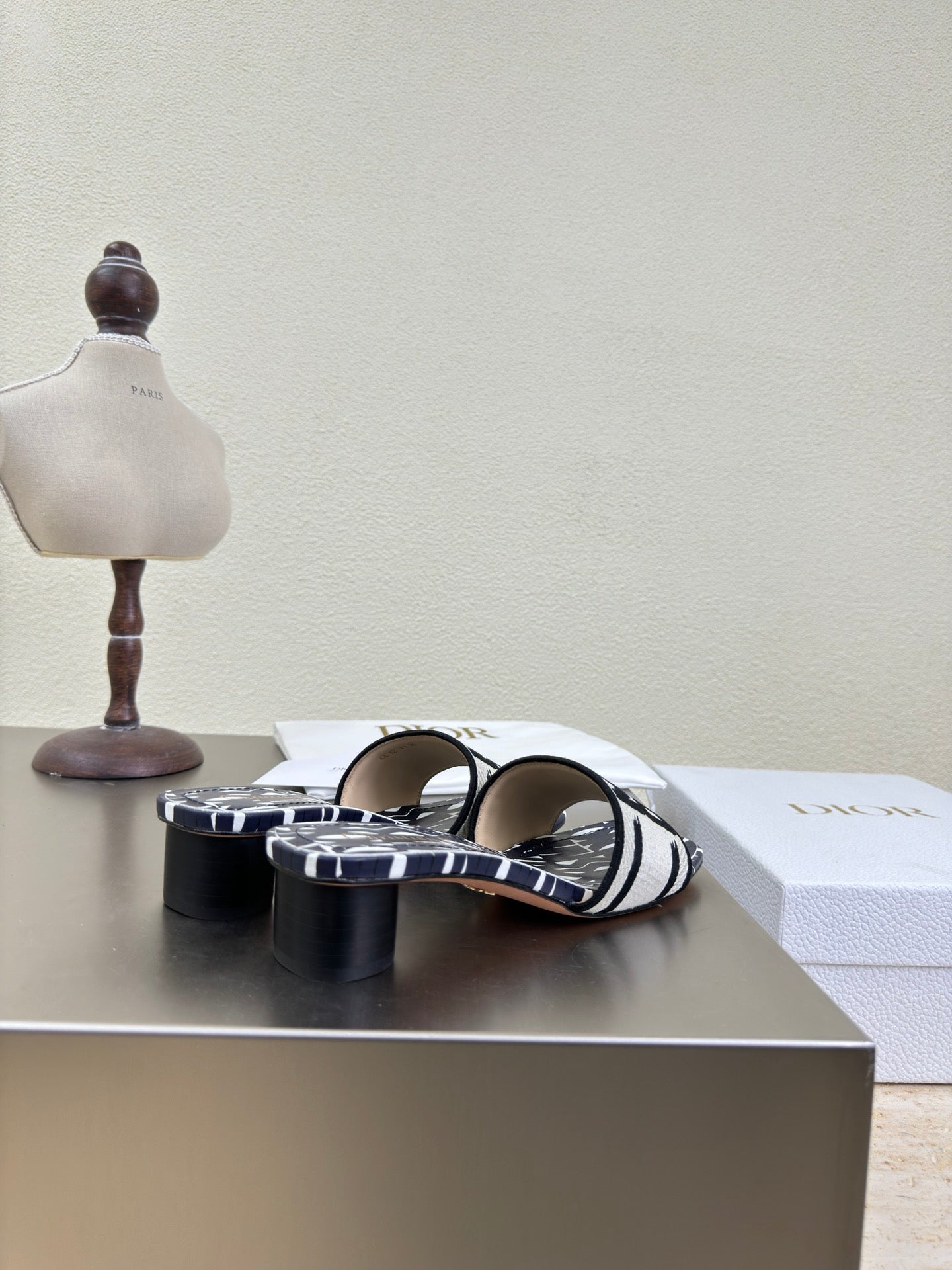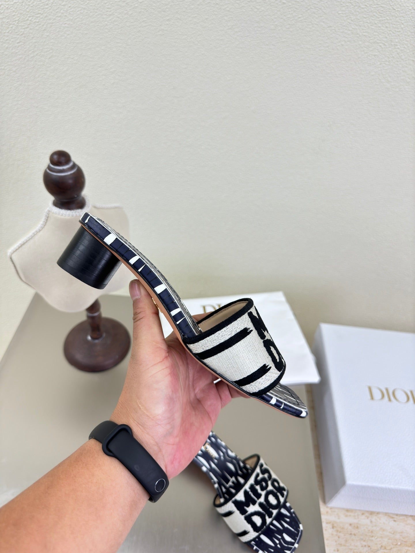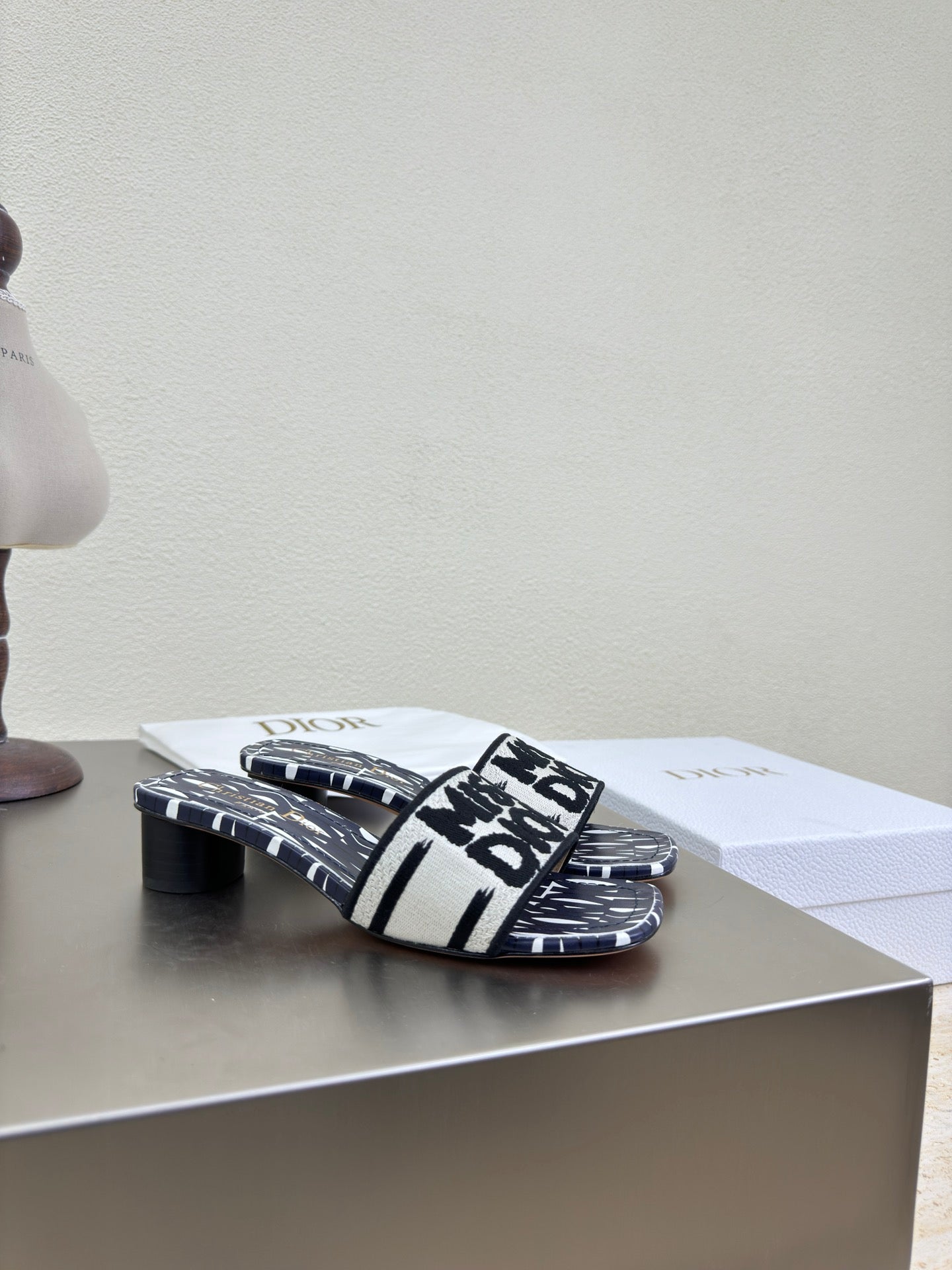 DWAY HEELED SLIDE EMBROIDERED COTTON AND NAVY BLUE MISS DIOR ALLOVER MOTIF 35 MM