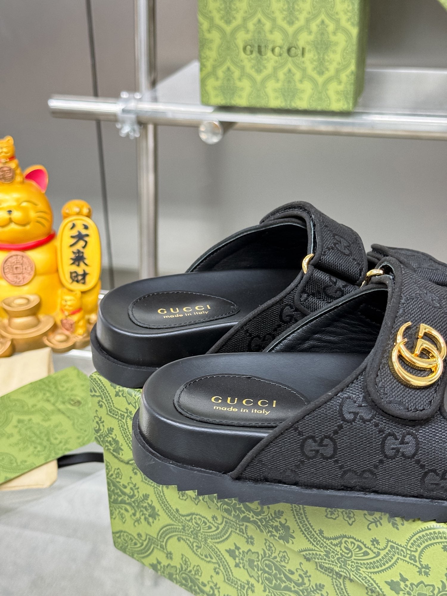 GG SANDALS IN BLACK FABRIC AND CALFSKIN WITH GOLD HARDWARE