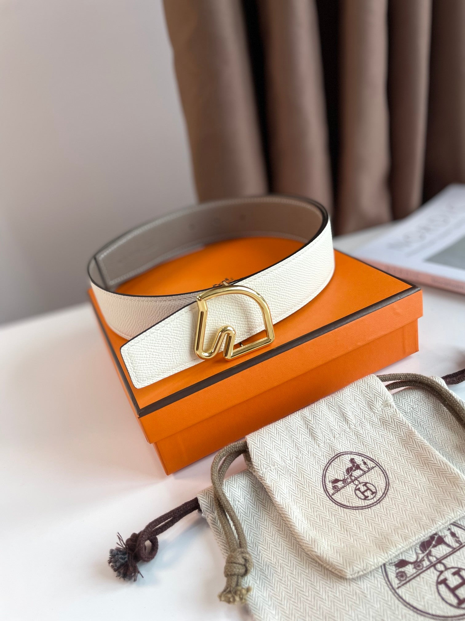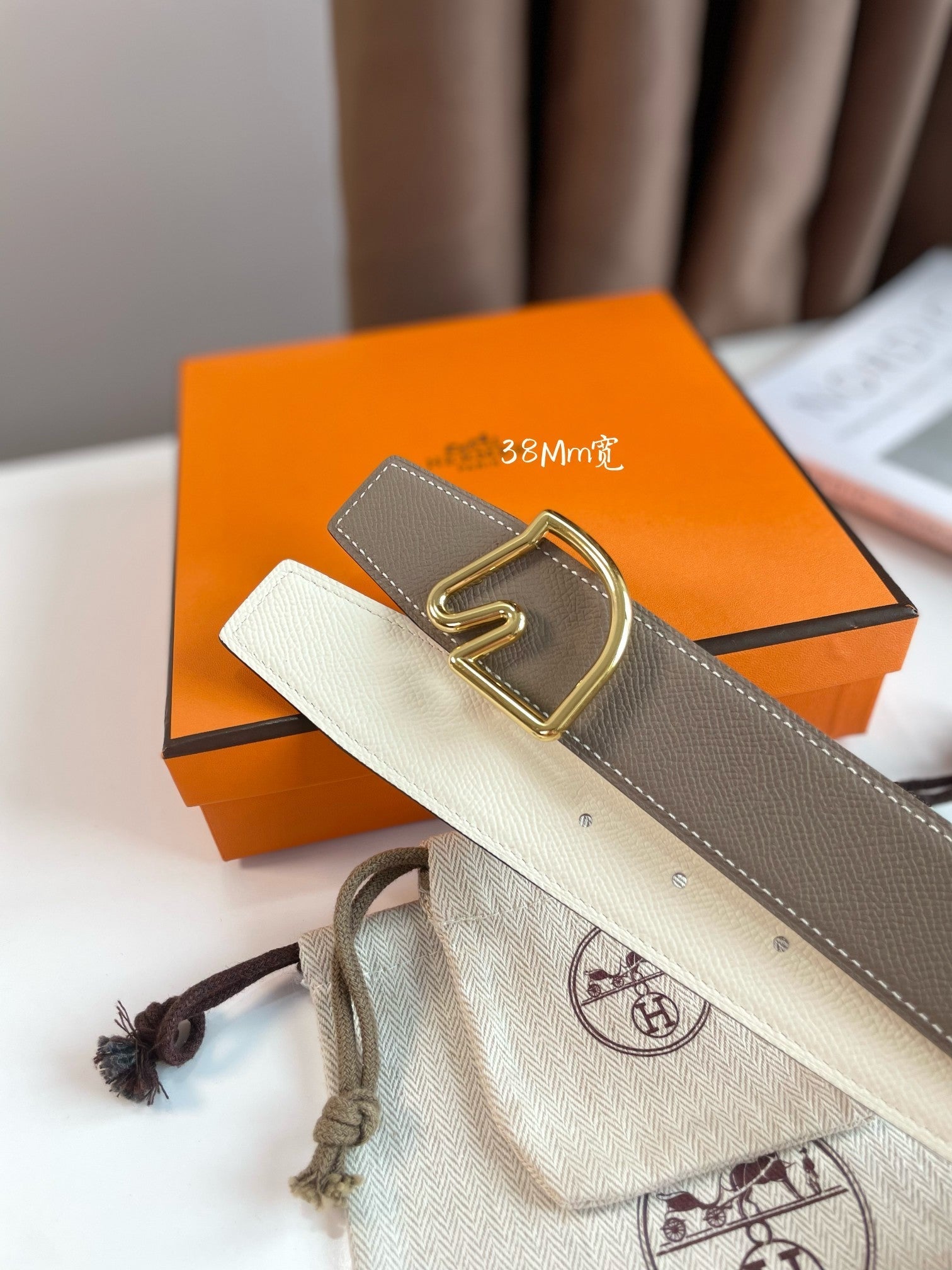 BOUCLE BELT BUCKLE & REVERSIBLE KHAKI BROWN AND WHITE LEATHER STRAP 38MM GOLD HARDWARE