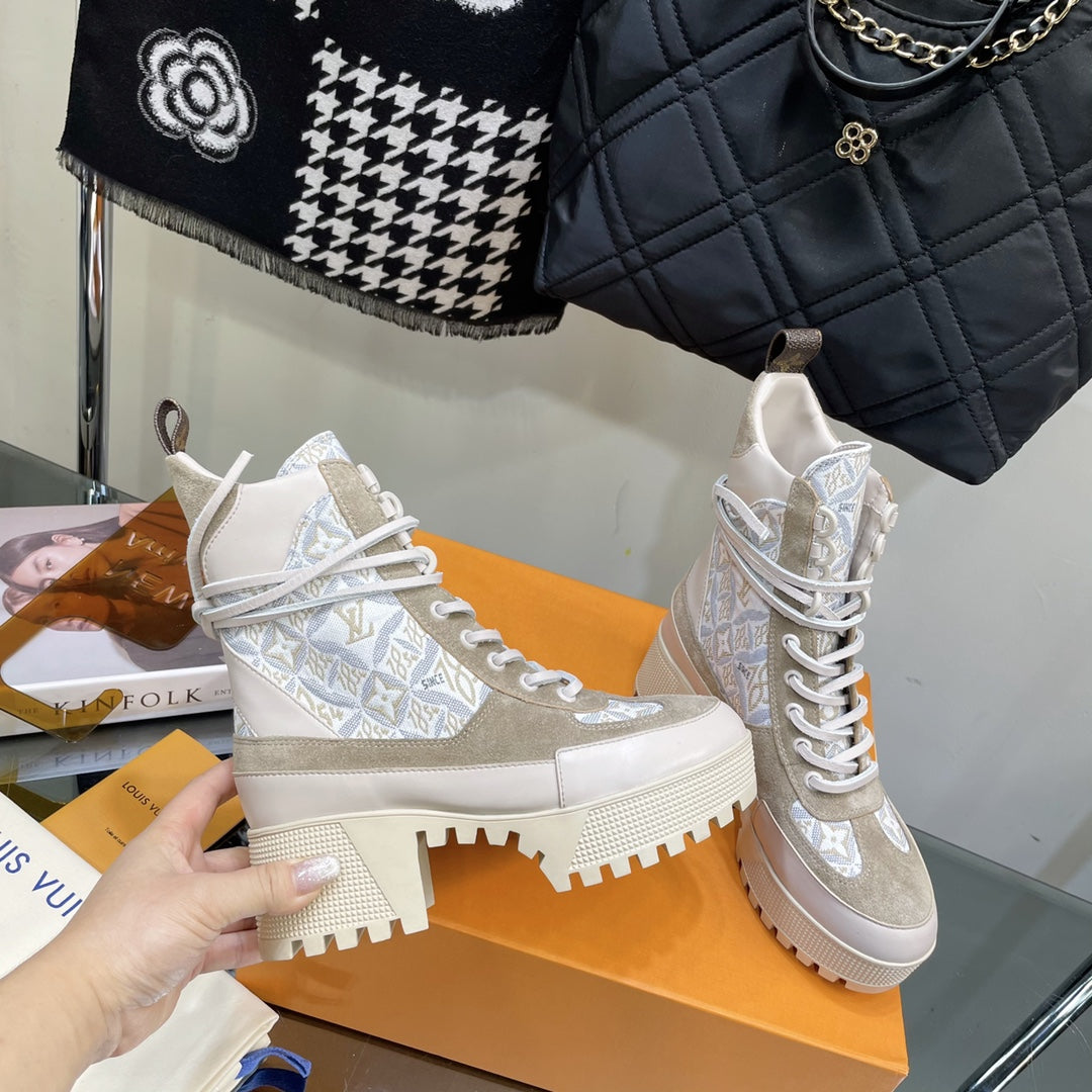 LAUREATE PLATFORM BOOTS IN OAT TAN SUEDE AND MONOGRAM JACQUARD PATTERN