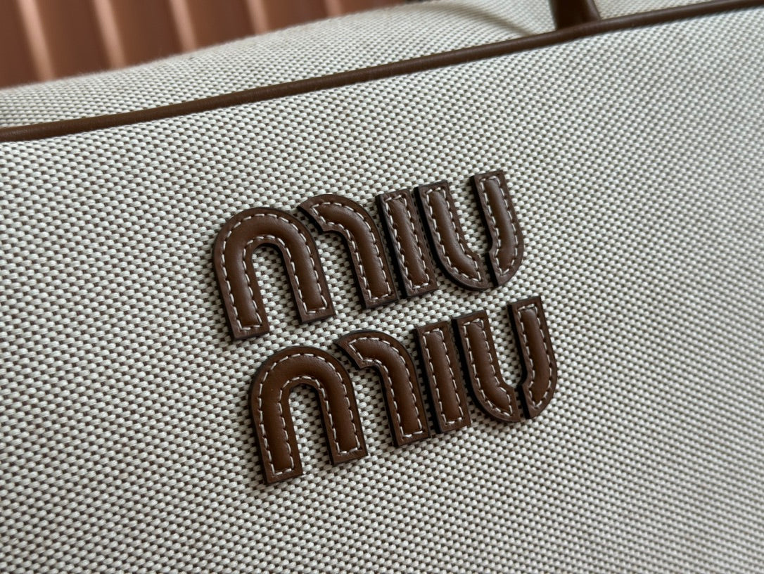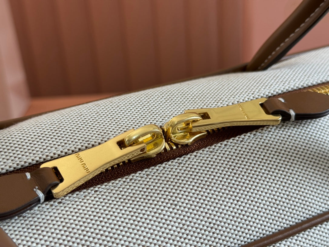 BEAU TOP HANDLE BAG 34 IN WHITE CANVAS AND WALNUT BROWN CALFSKIN TRIM