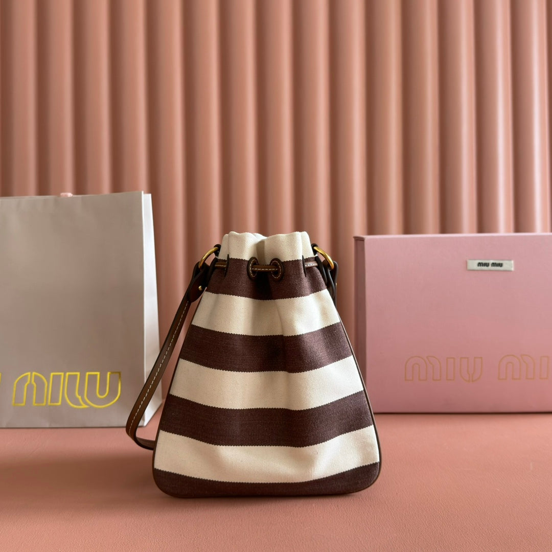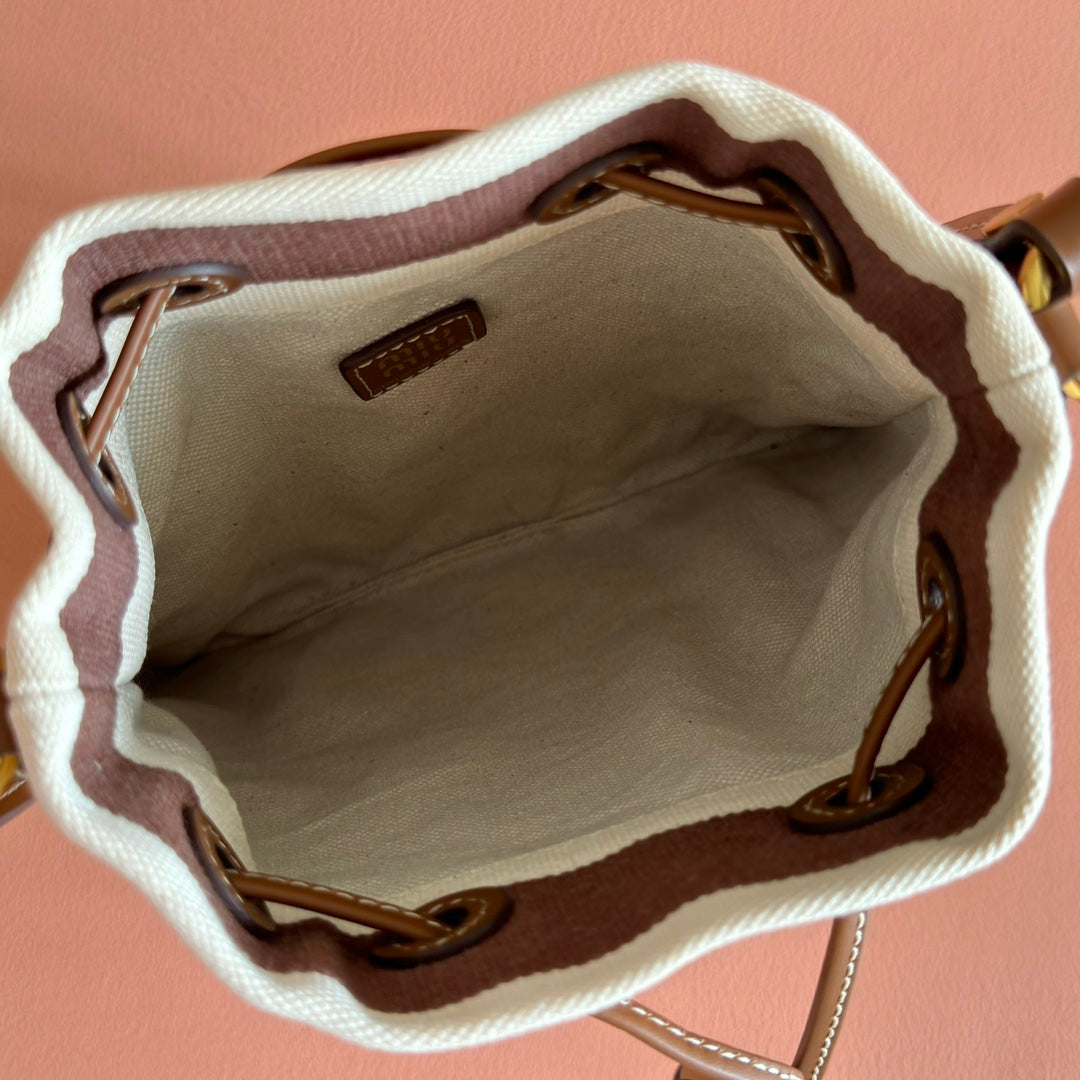 MIUMIU 26S BUCKET BAG 23 IN CREAM AND BROWN CANVAS GOLD HARDWARE