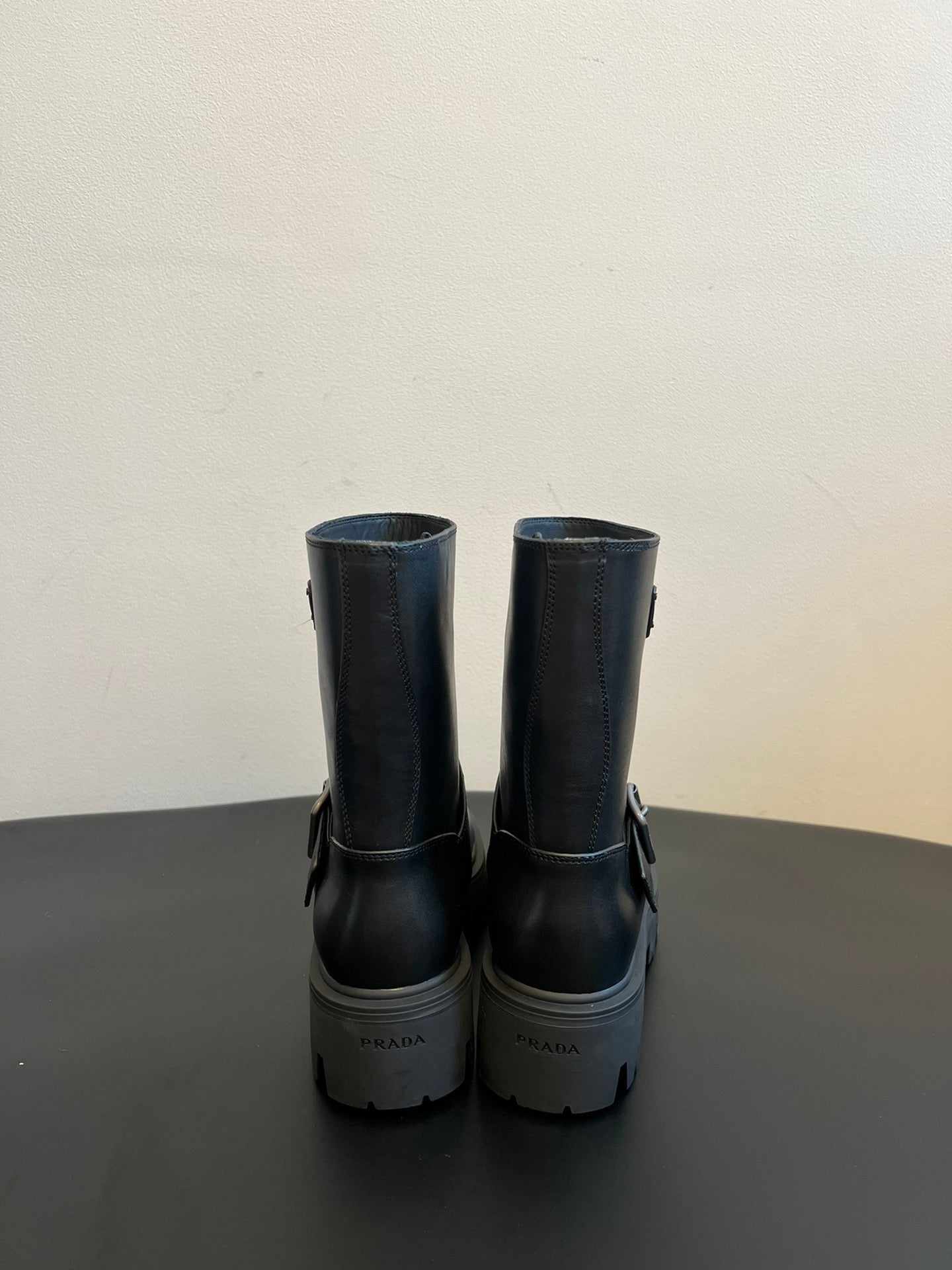 PRADA 25S PLATFORM ANKLE BOOTS IN BLACK CALFSKIN WITH SILVER HARDWARE