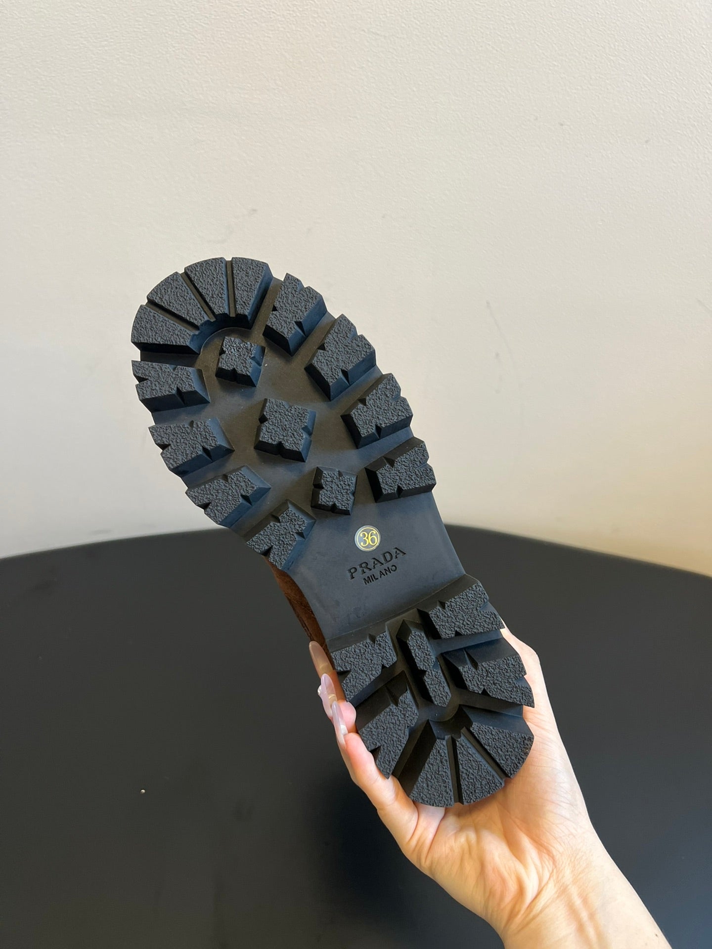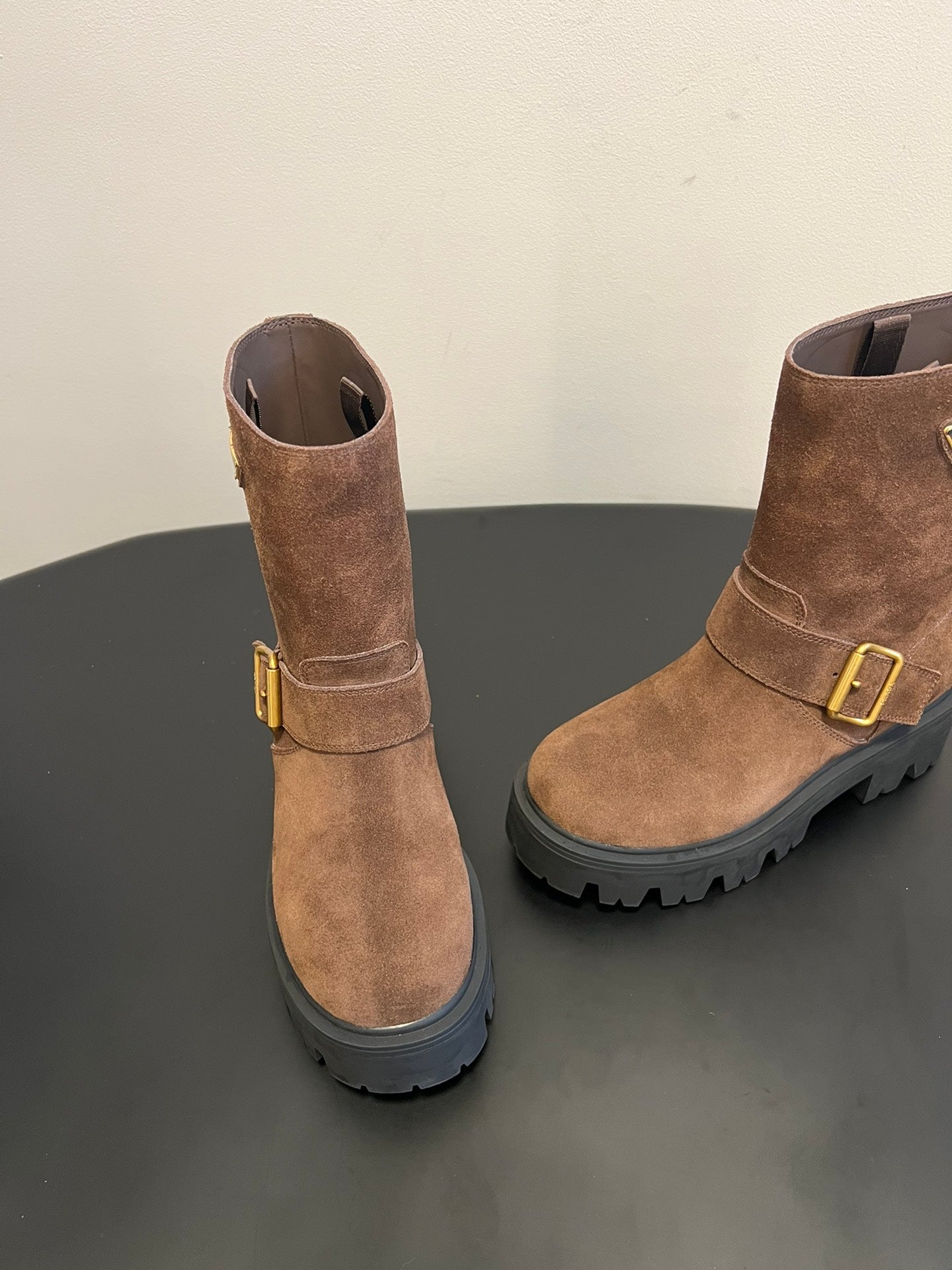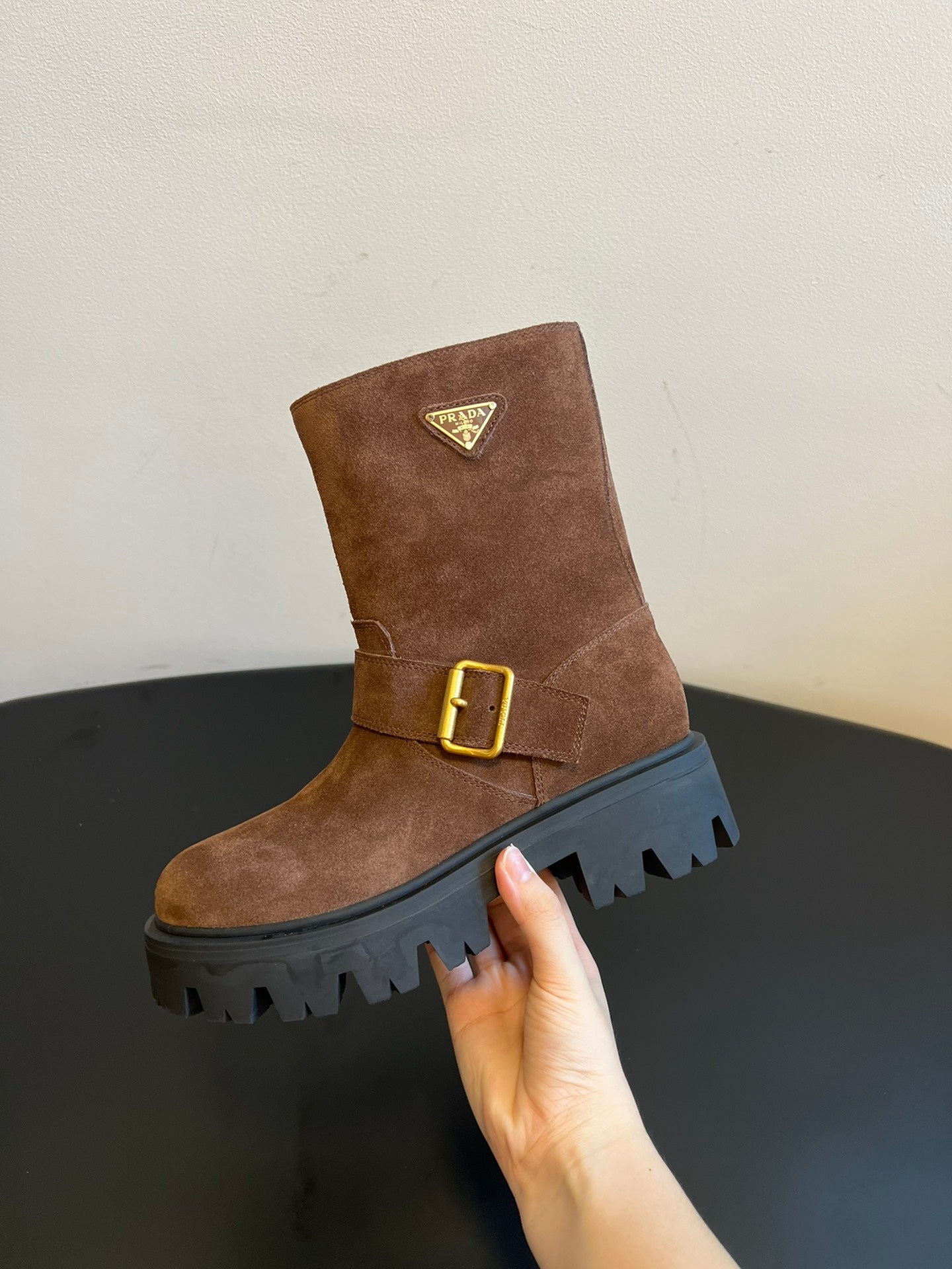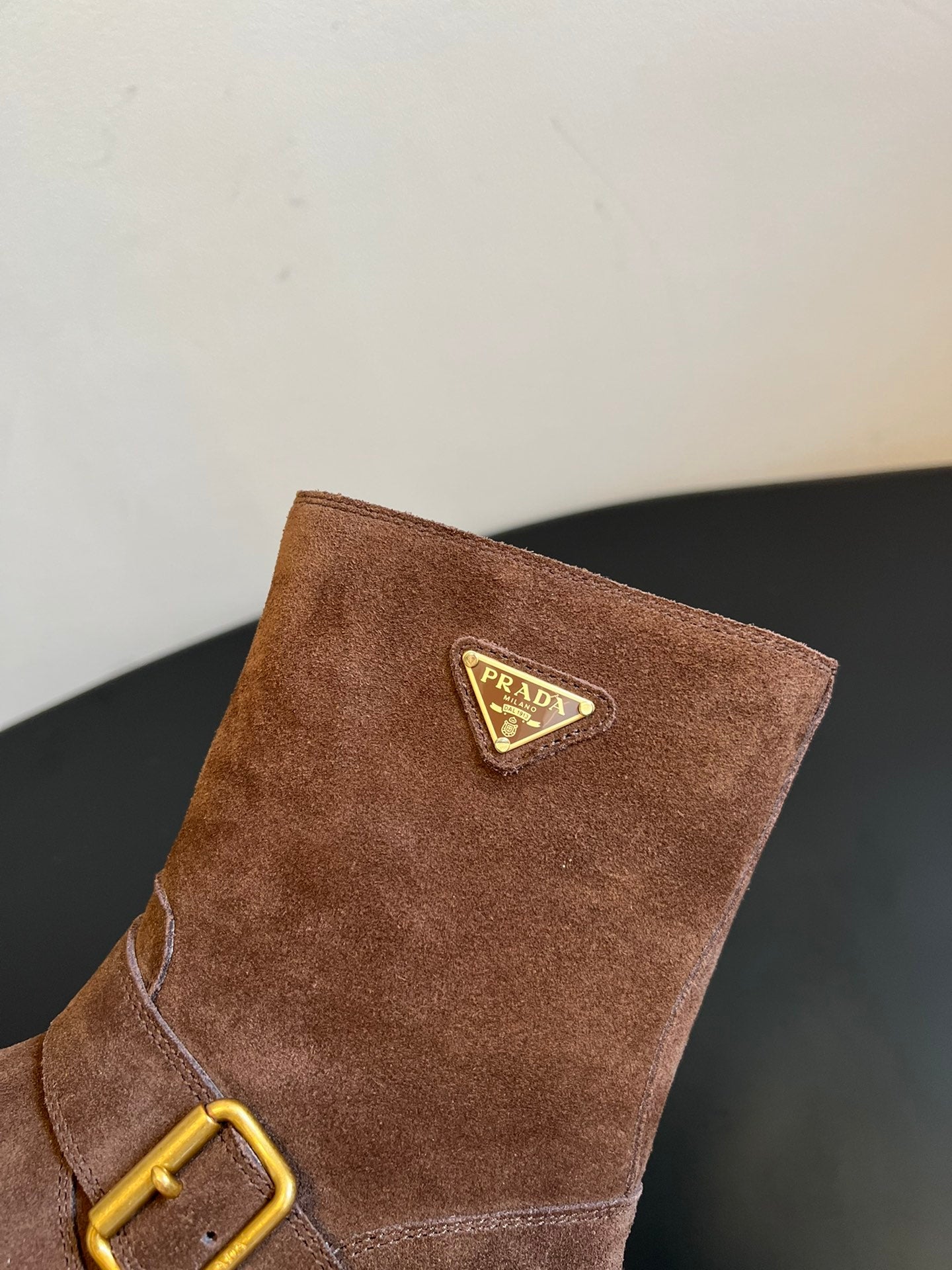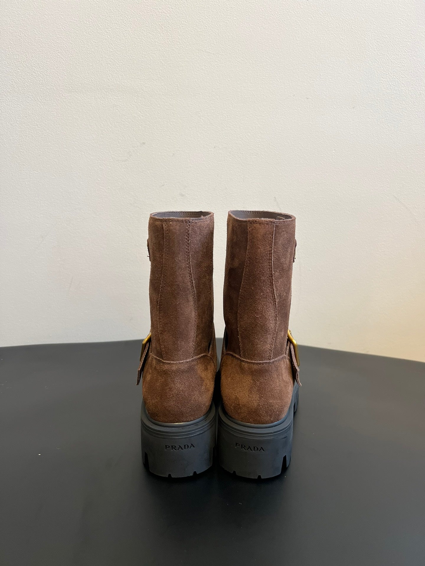 PRADA 25S PLATFORM ANKLE BOOTS IN BROWN SUEDE WITH GOLD HARDWARE