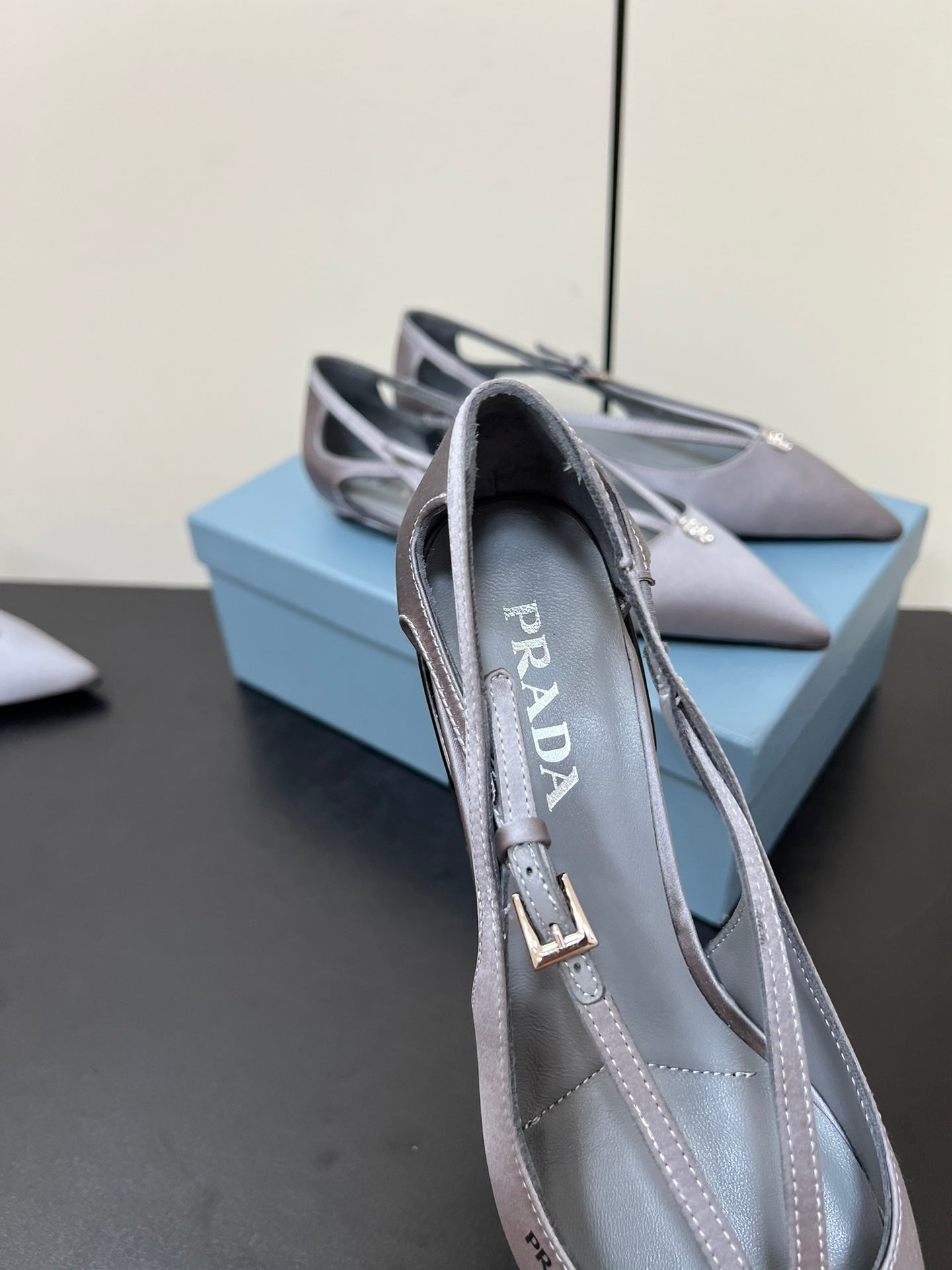 CUT-OUT BALLERINA FLAT IN WARM GRAY SATIN ATTACHED BEAD BUCKLE