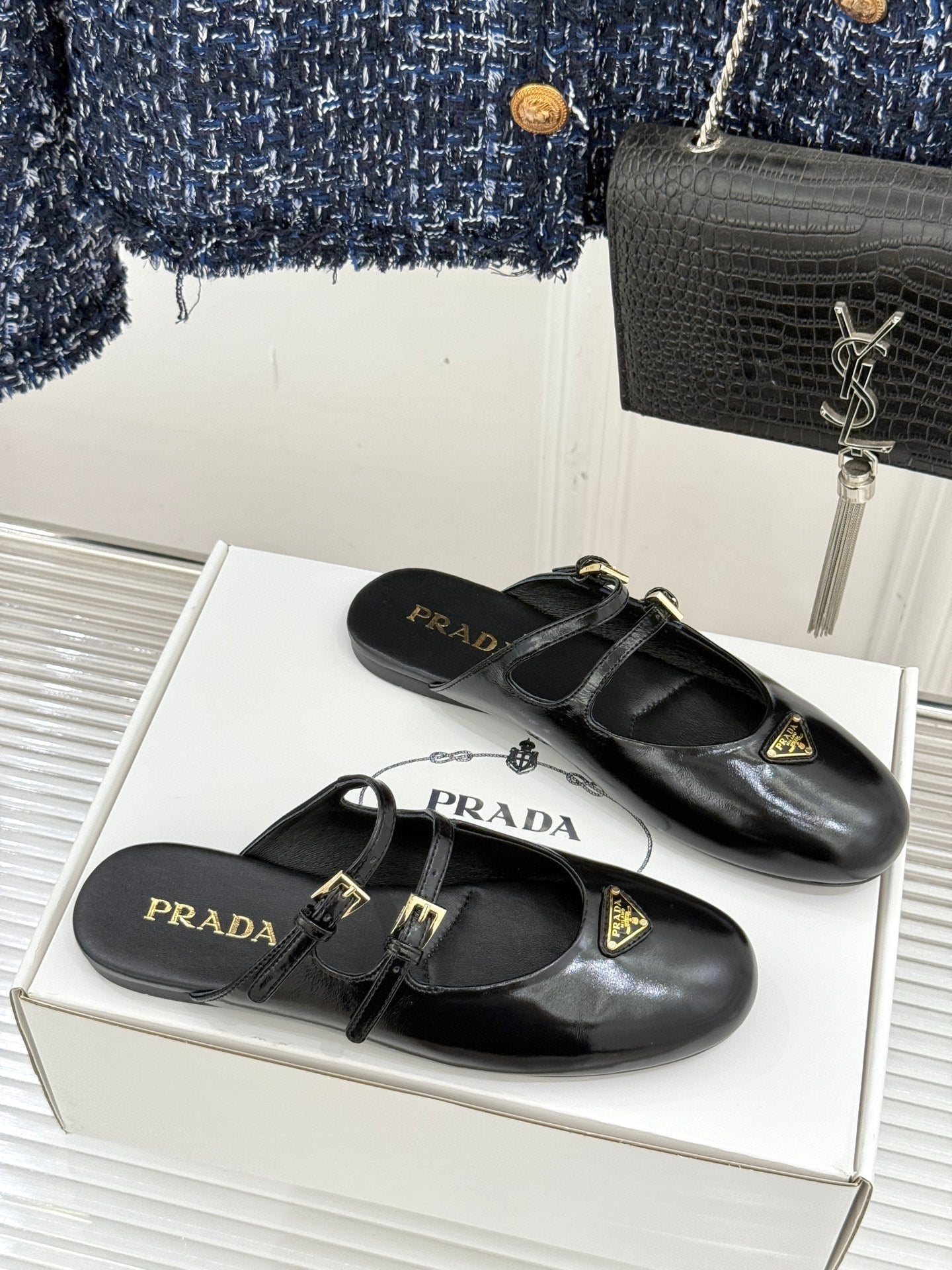 PRADA 25S DUAL MARY JANE BALLERINA MULES IN BLACK CALFSKIN