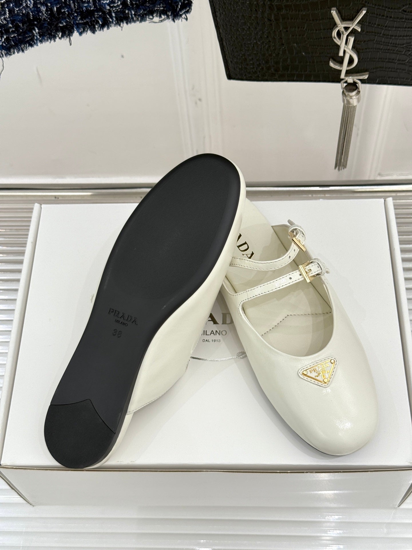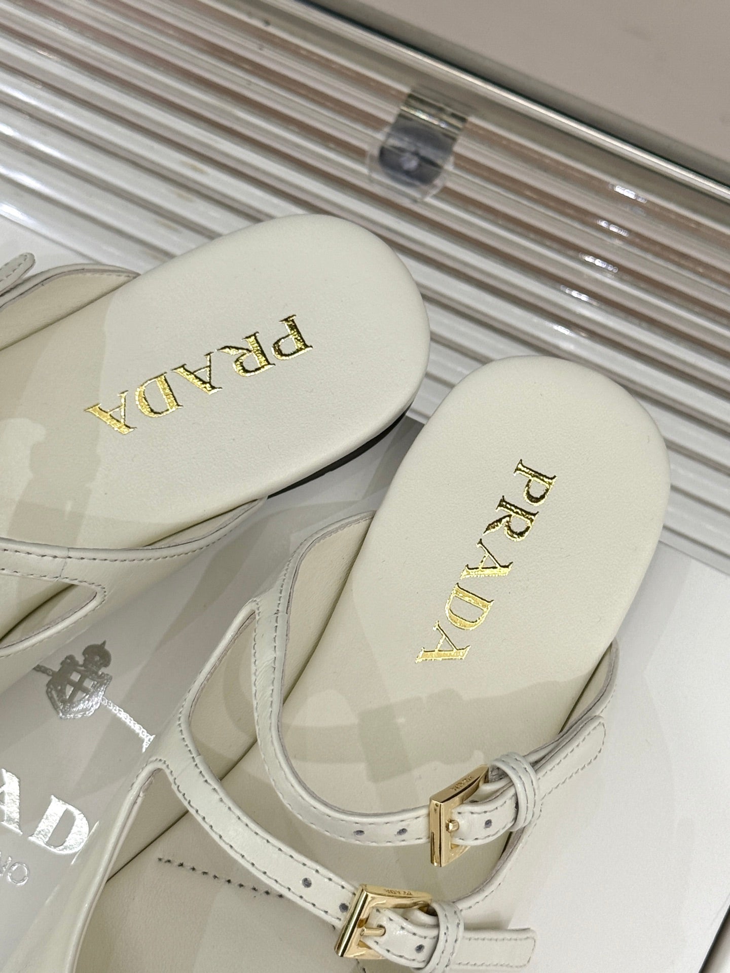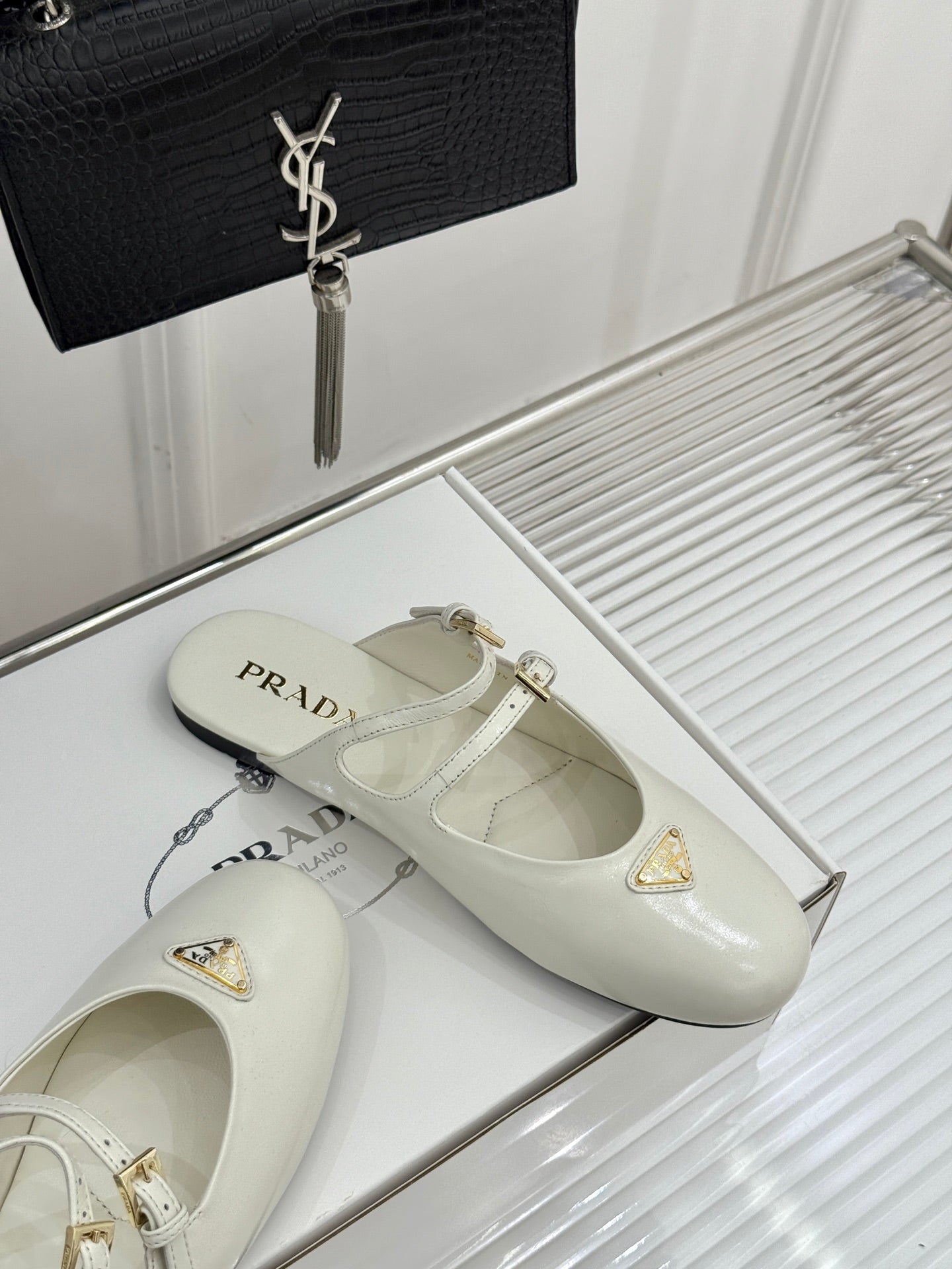 PRADA 25S DUAL MARY JANE BALLERINA MULES IN IVORY CALFSKIN
