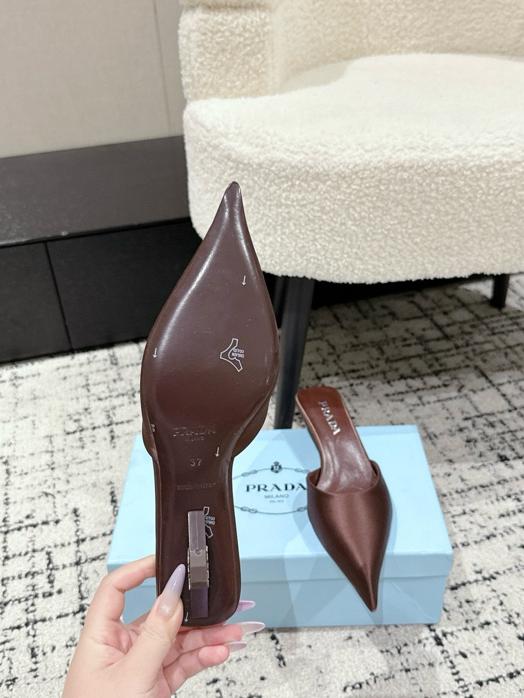 PRADA 25S POINTED-TOE MULES IN DARK BROWN SATIN