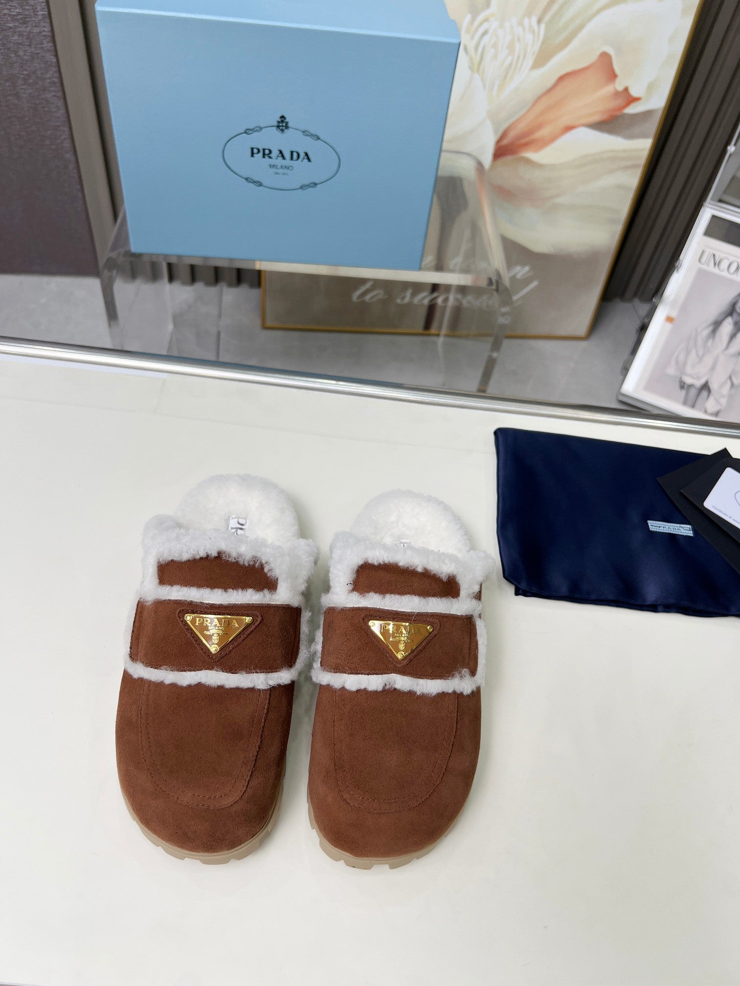 SUEDE AND SHEARLING MULES UMBER BROWN