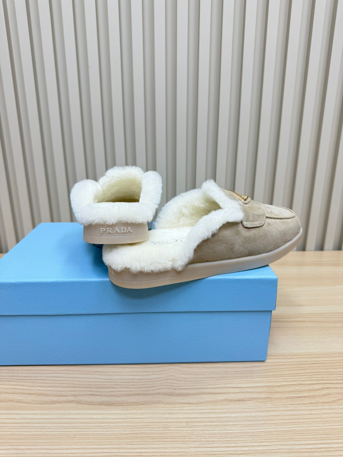 TRIANGLE LOGO FLATS IN KHAKI BEIGE SUEDE AND FUR LINING