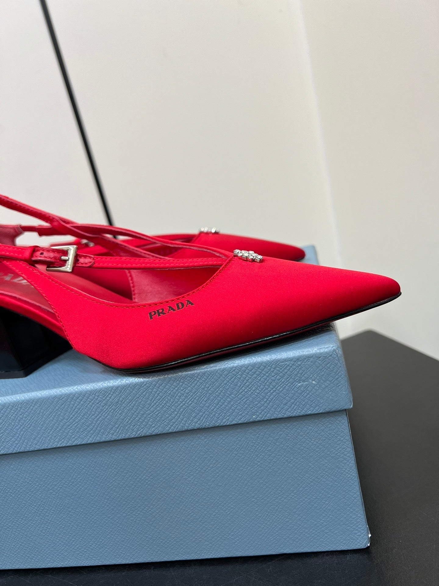 CUT-OUT PUMPS WITH BEAD BUCKLE IN CLASSIC RED SATIN