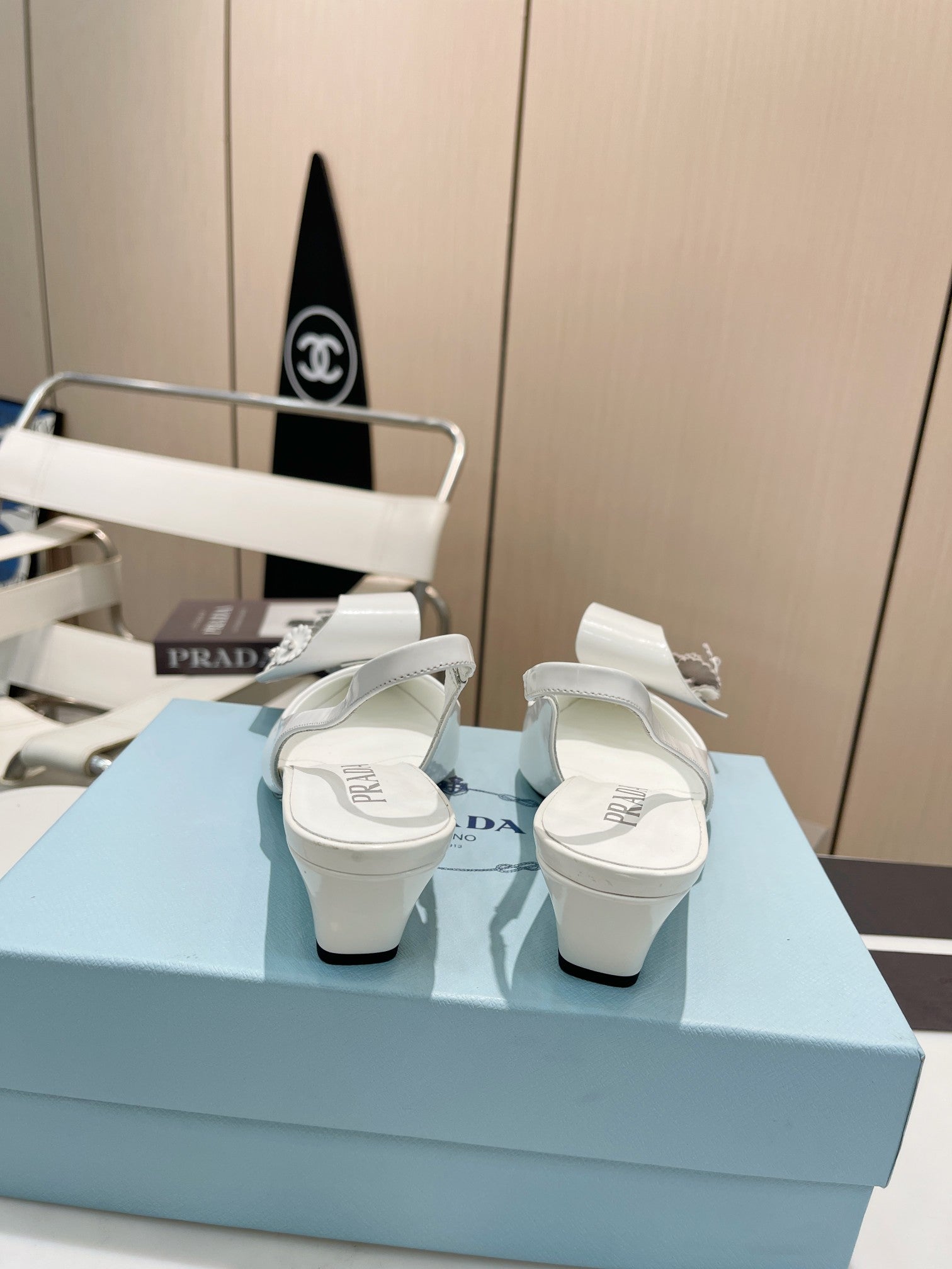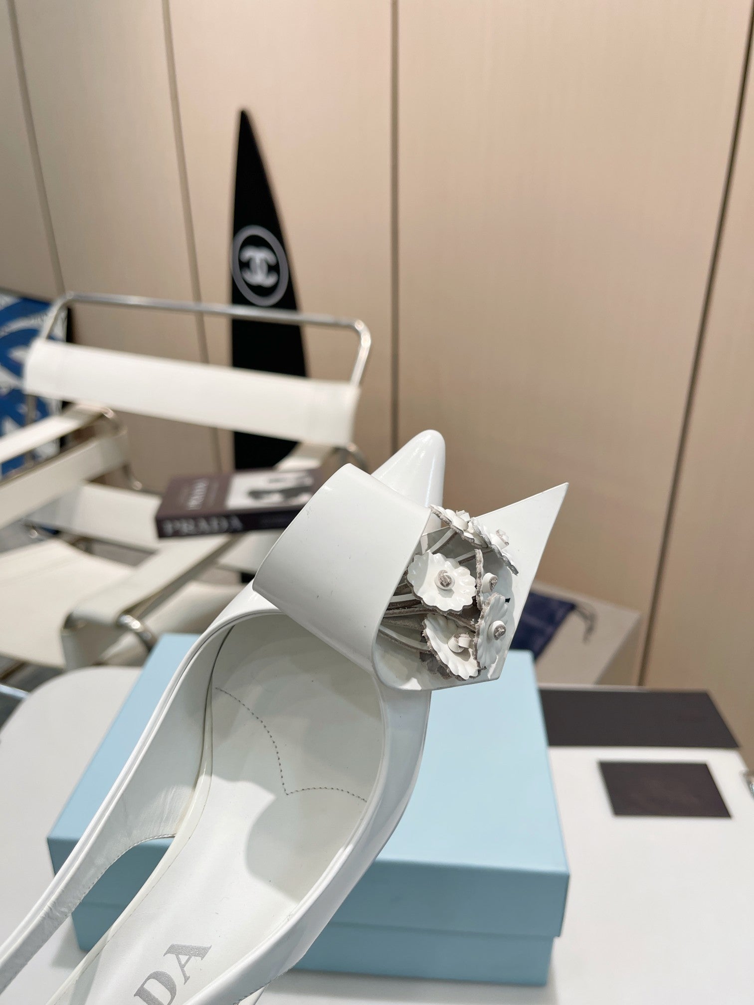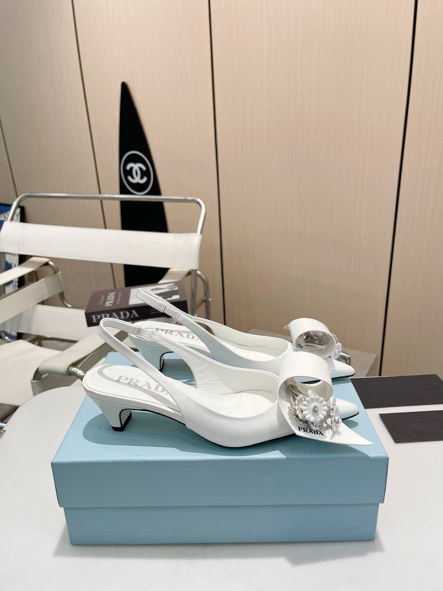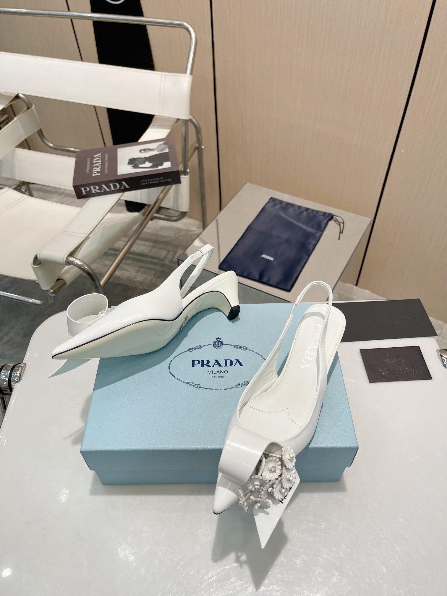 POINTED TOE SLINGBACK KITTEN HEEL WITH FLOWER BOW IN WHITE GLOSSY LAMBSKIN