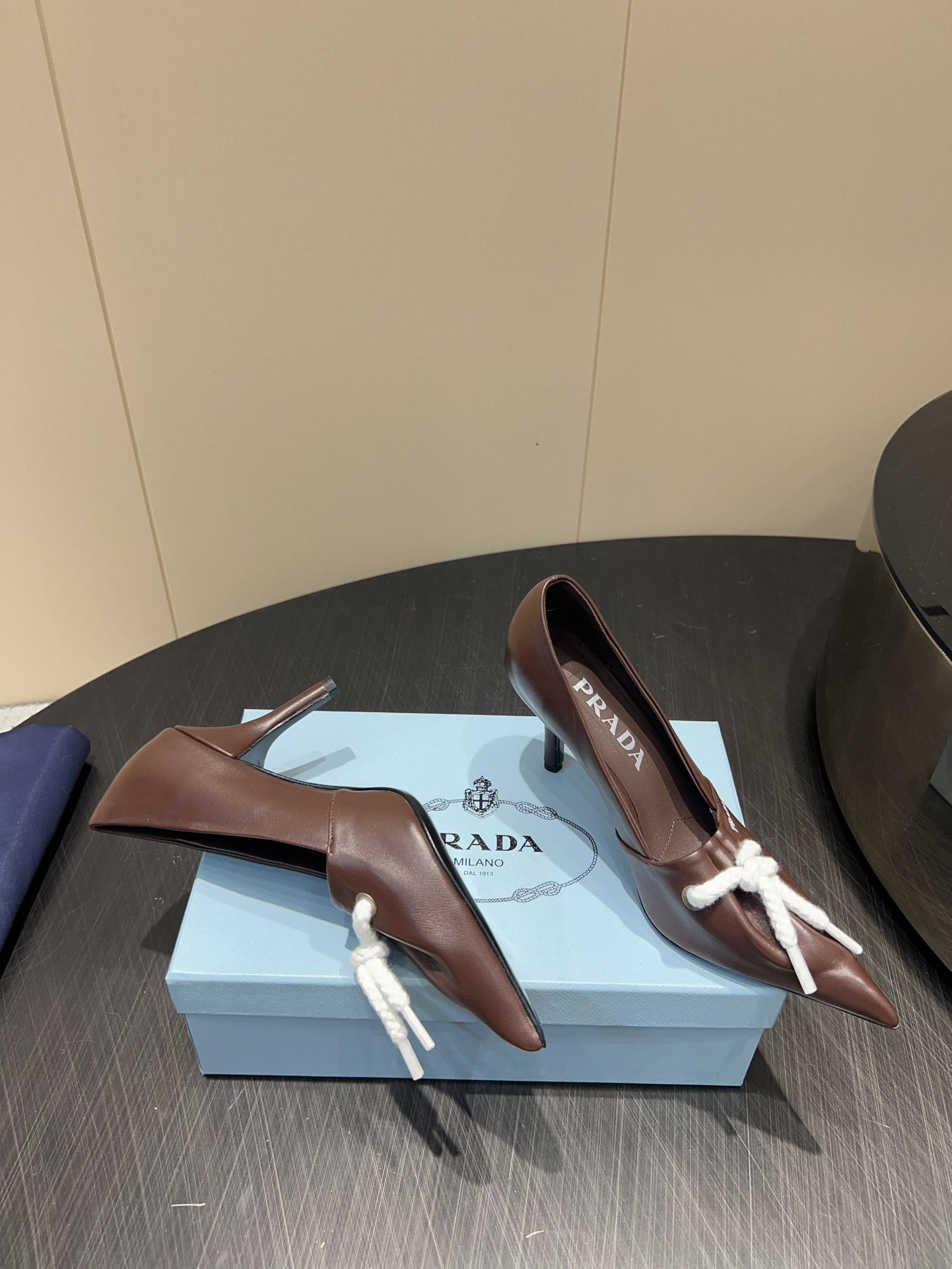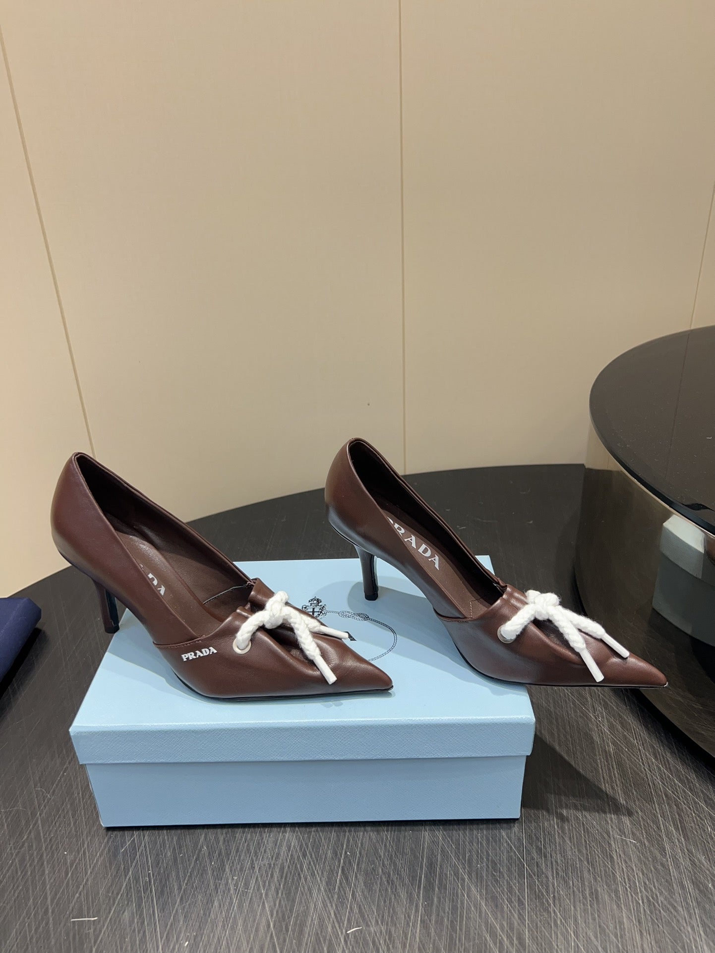 PRADA 25S POINTED TOE HIGH HEELS 85MM IN DARK BROWN LAMBSKIN WITH TIE UP DESIGN