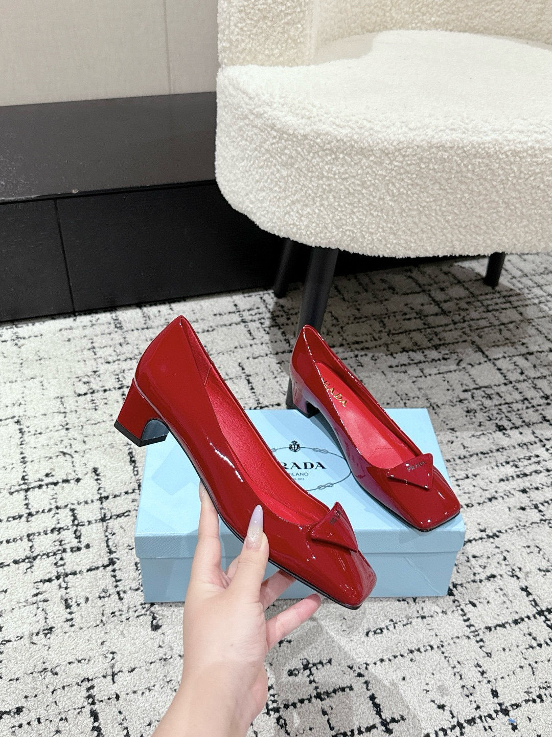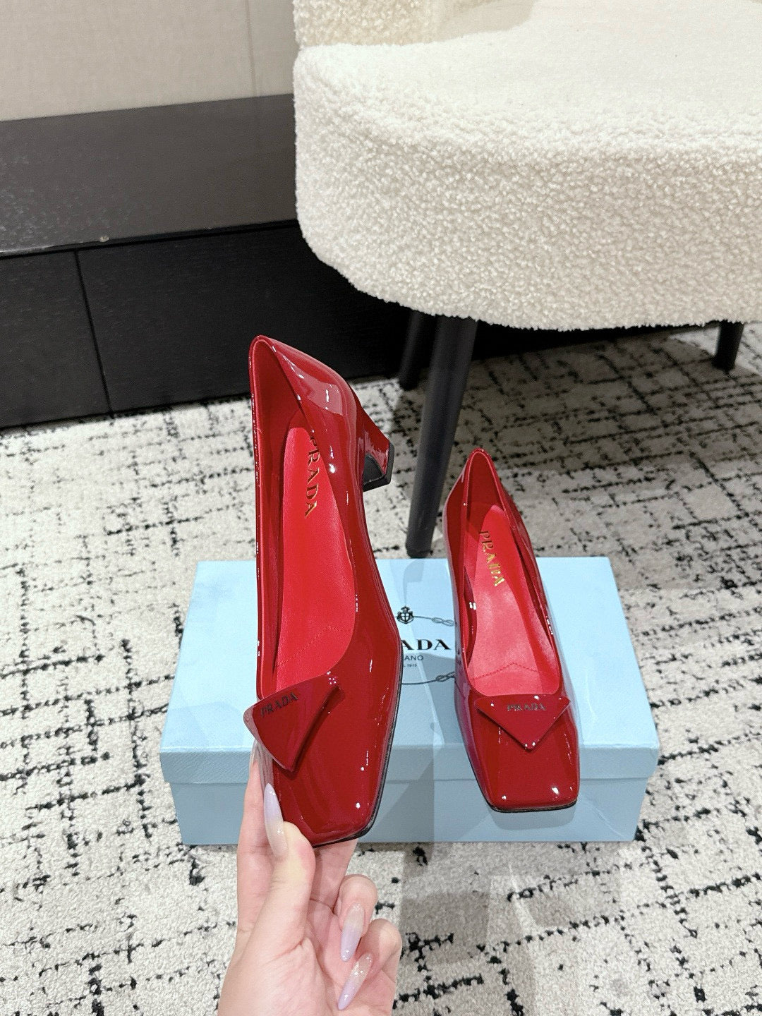 PRADA 25S SQUARE TOE HIGH HEELS IN DARK RED GLOSSY CALFSKIN