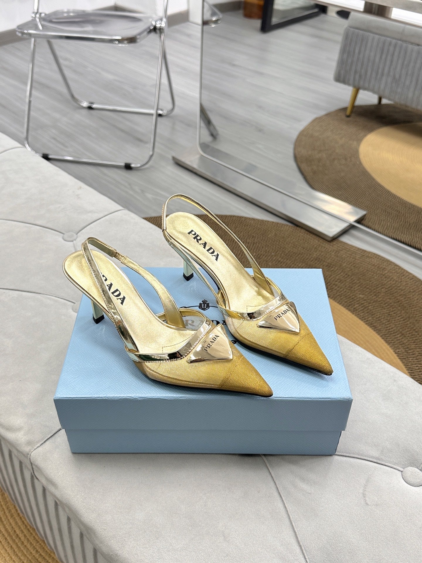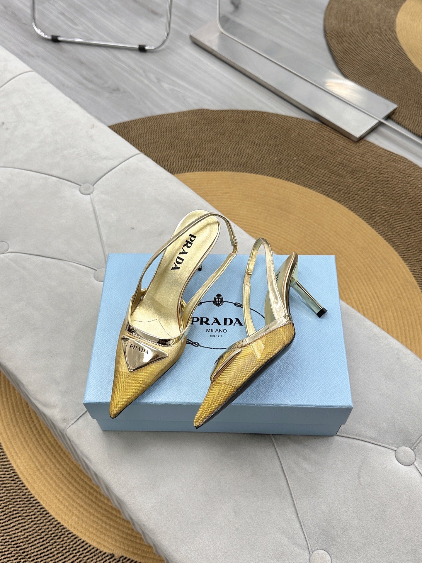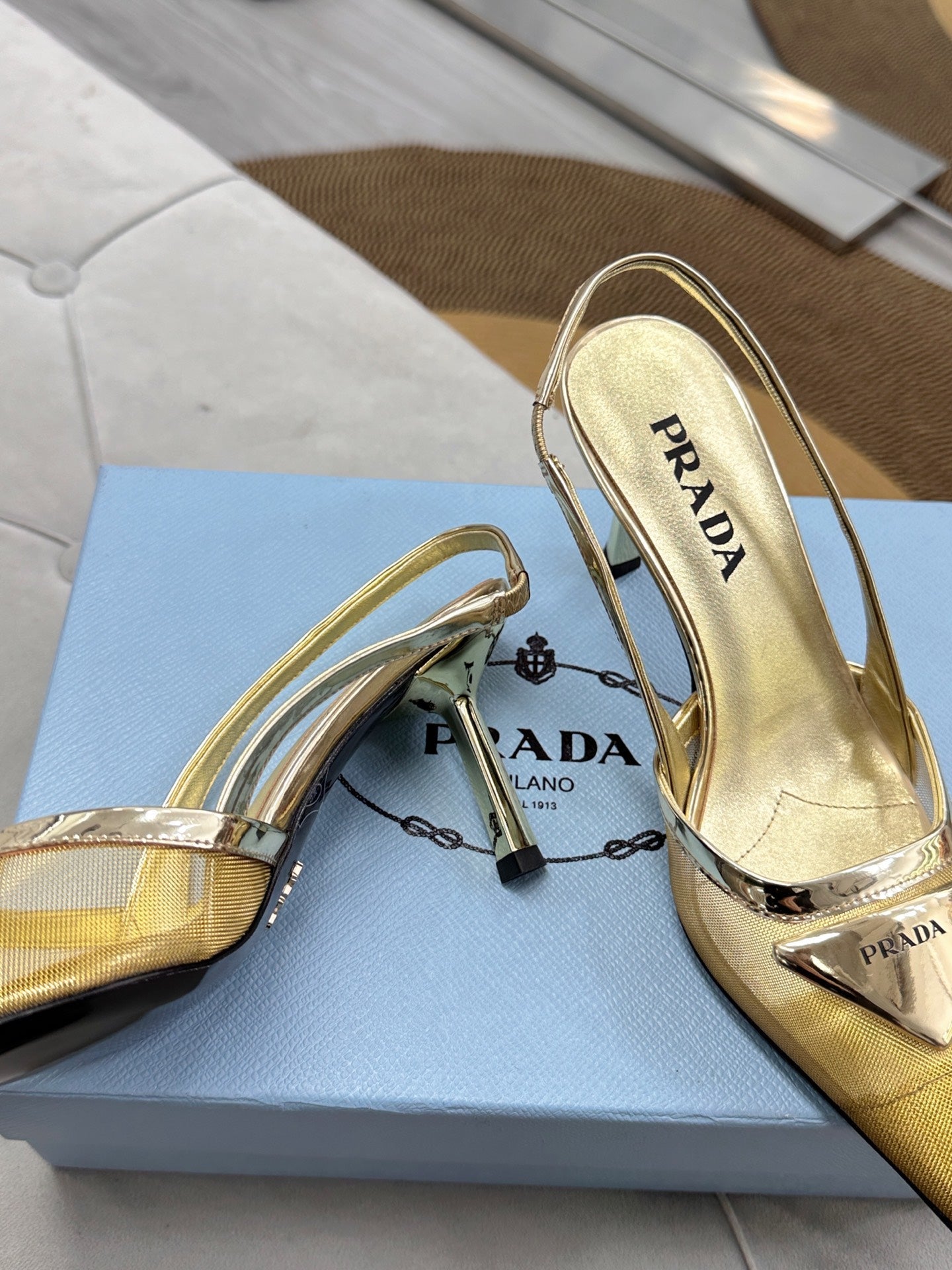 PRADA 25S TRIANGLE LOGO SLINGBACK PUMPS IN GOLD MESH FABRIC