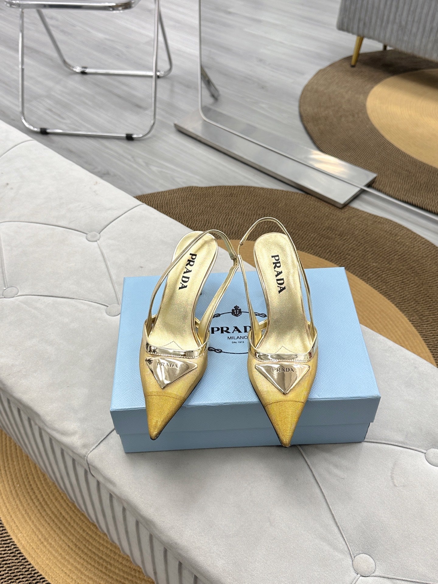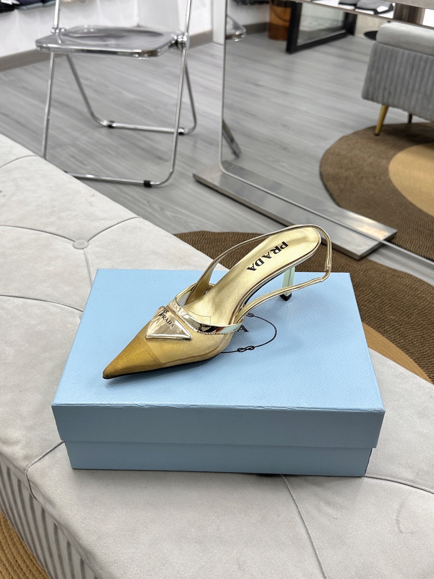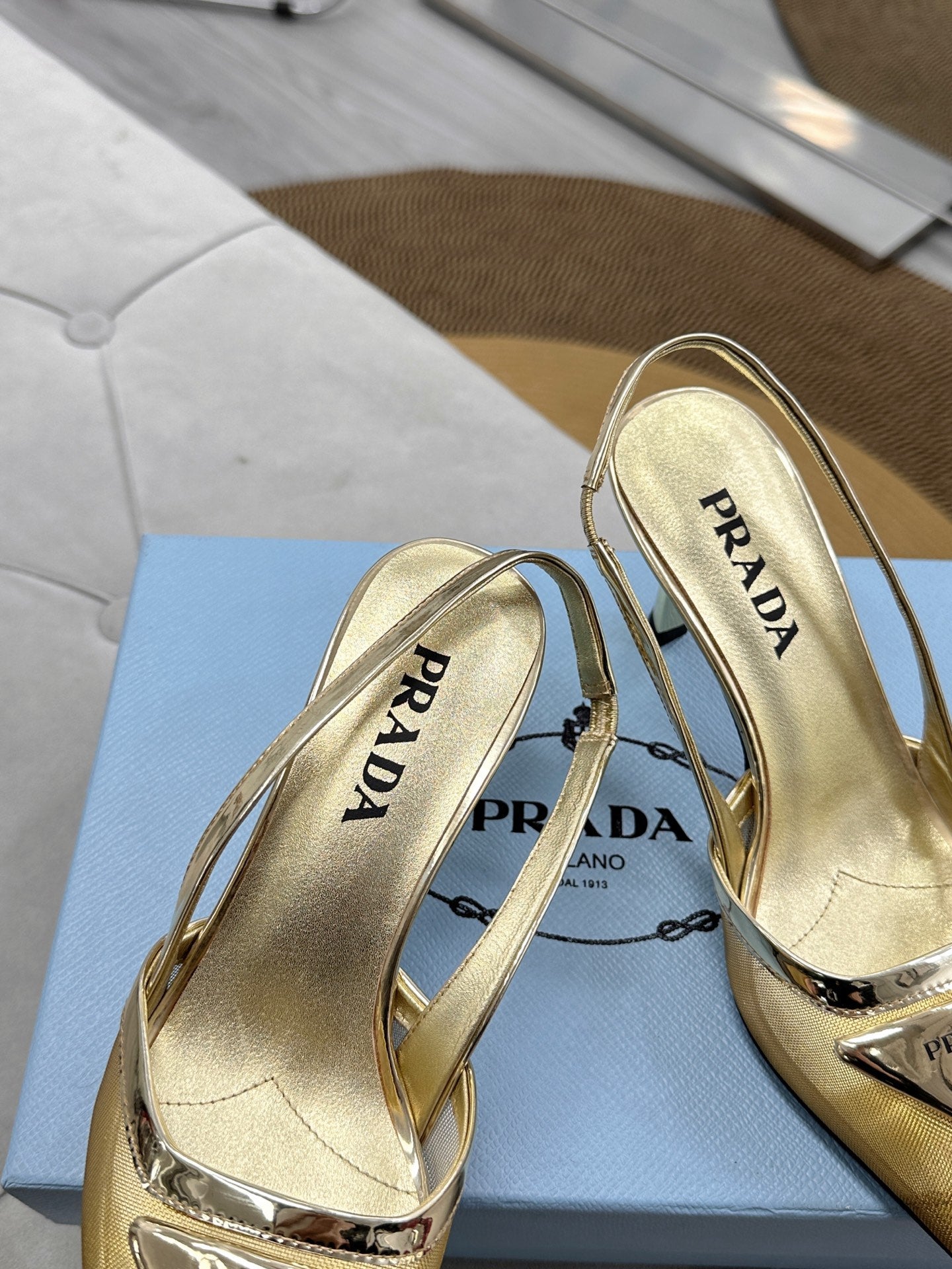 PRADA 25S TRIANGLE LOGO SLINGBACK PUMPS IN GOLD MESH FABRIC