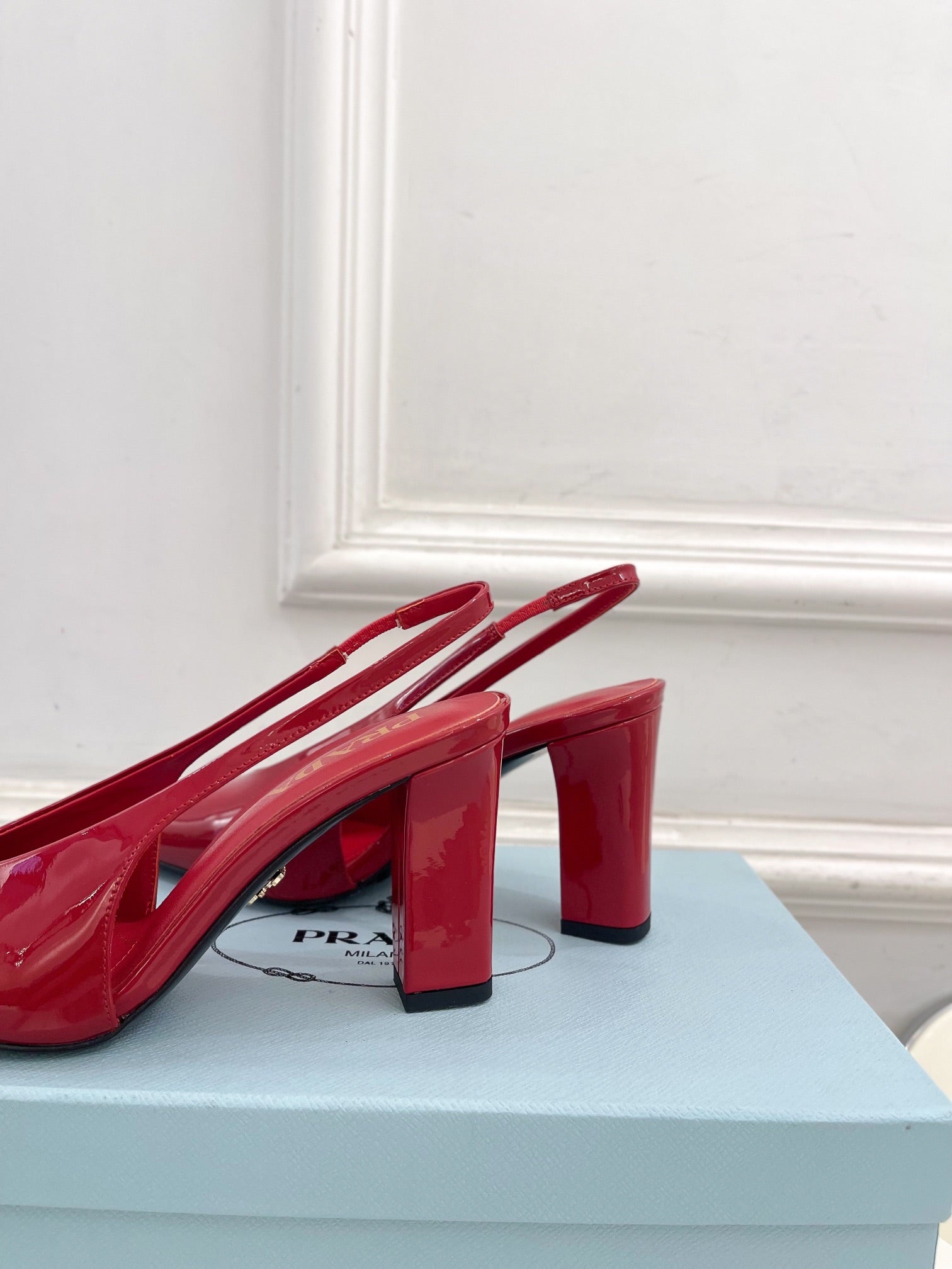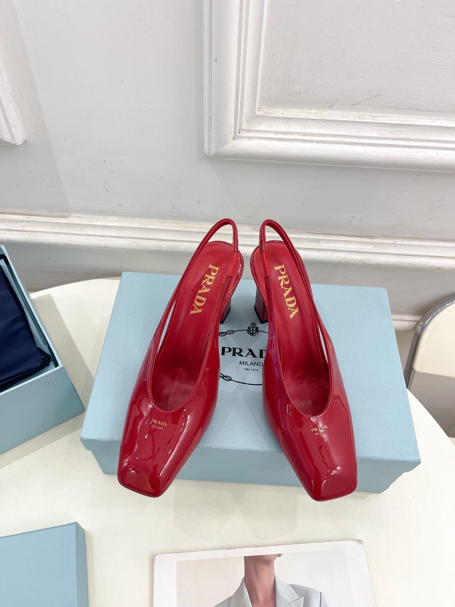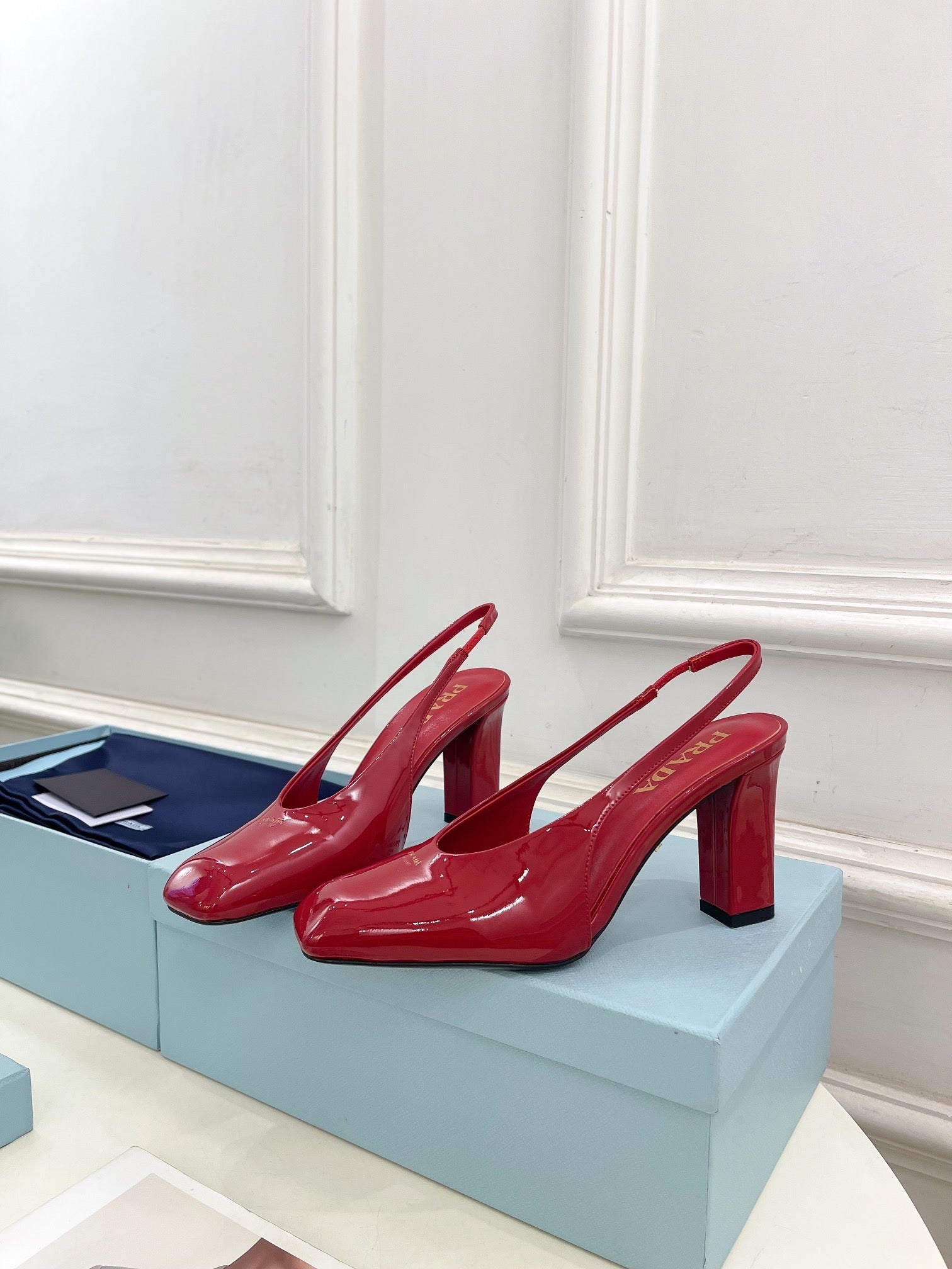 SQUARE TOE SLINGBACK PUMPS IN CRIMSON RED GLOSSY CALFSKIN