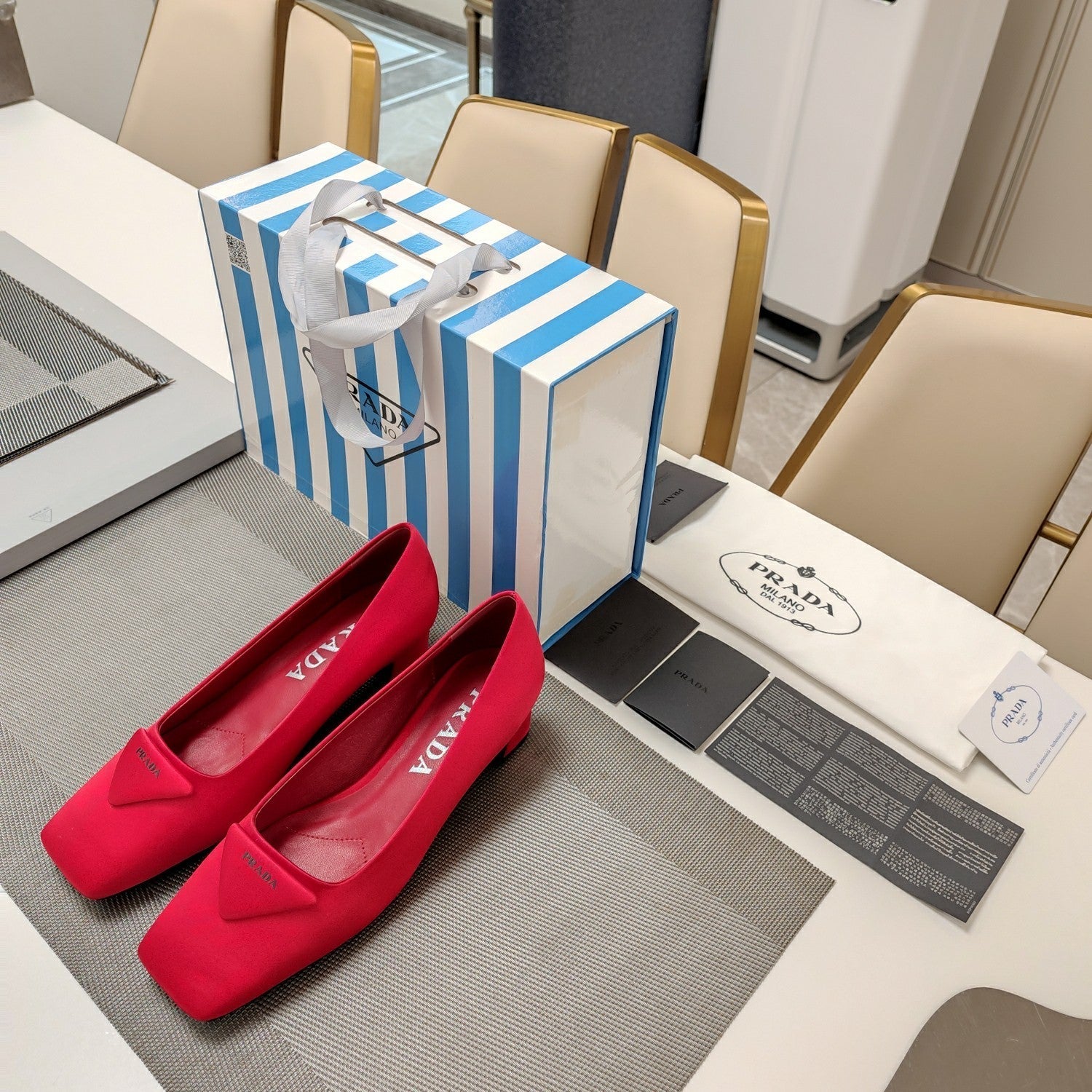 TRIANGLE LOGO PUMPS IN RED SATIN