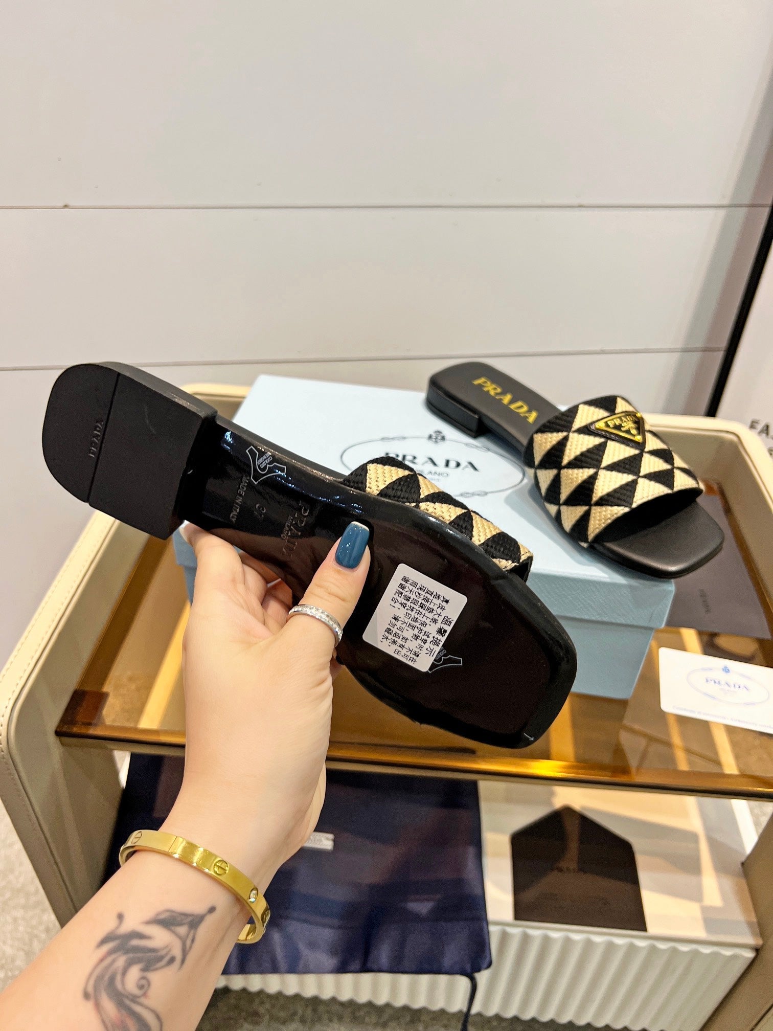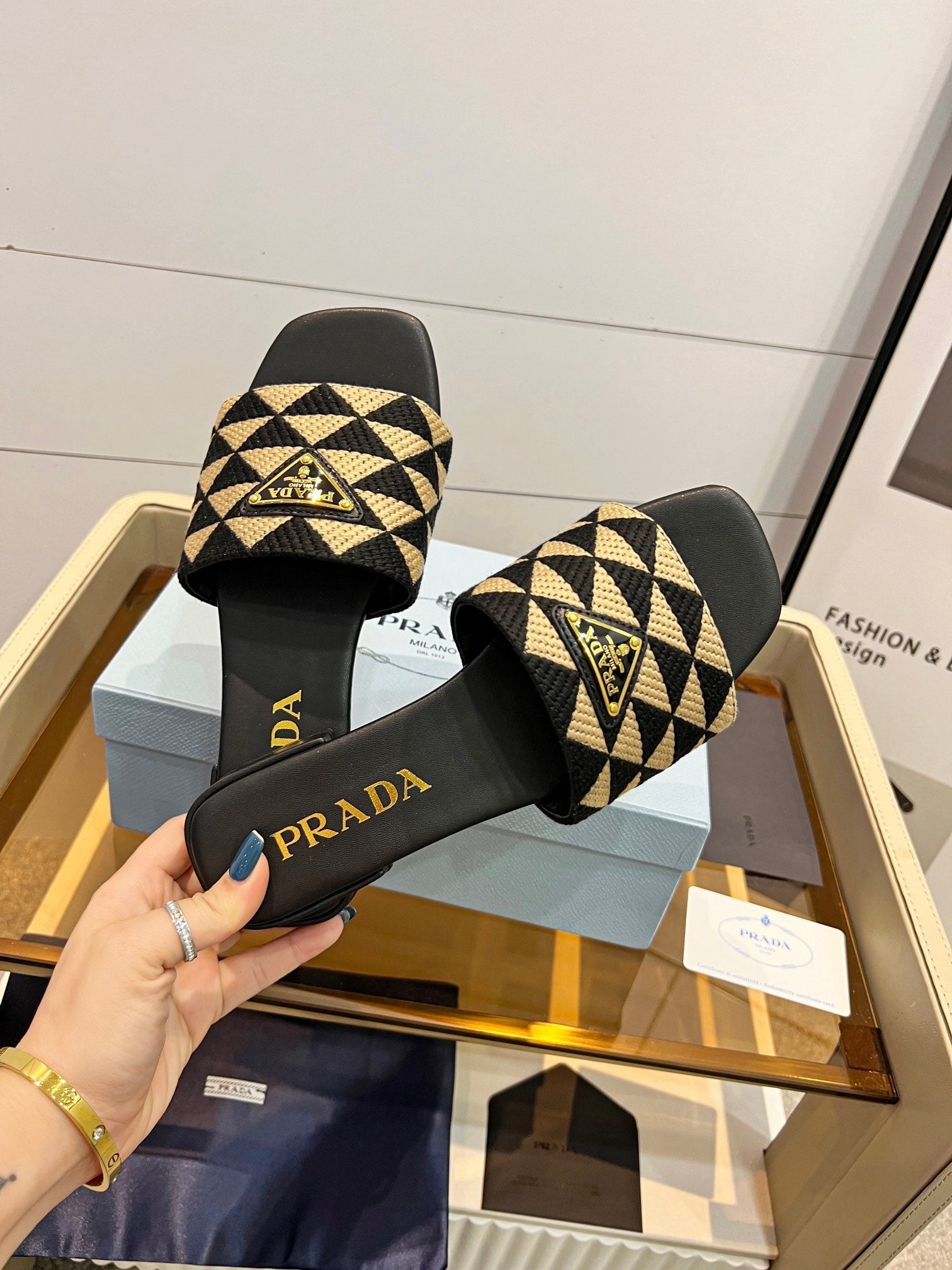 PRA EMBROIDERED SLIDES FLAT BLACK AND BEIGE FABRIC