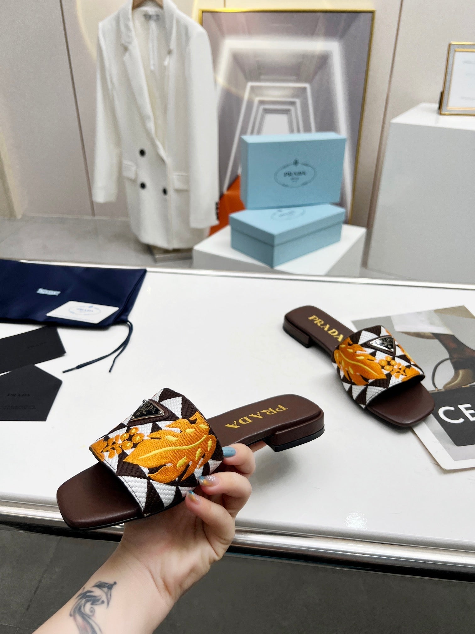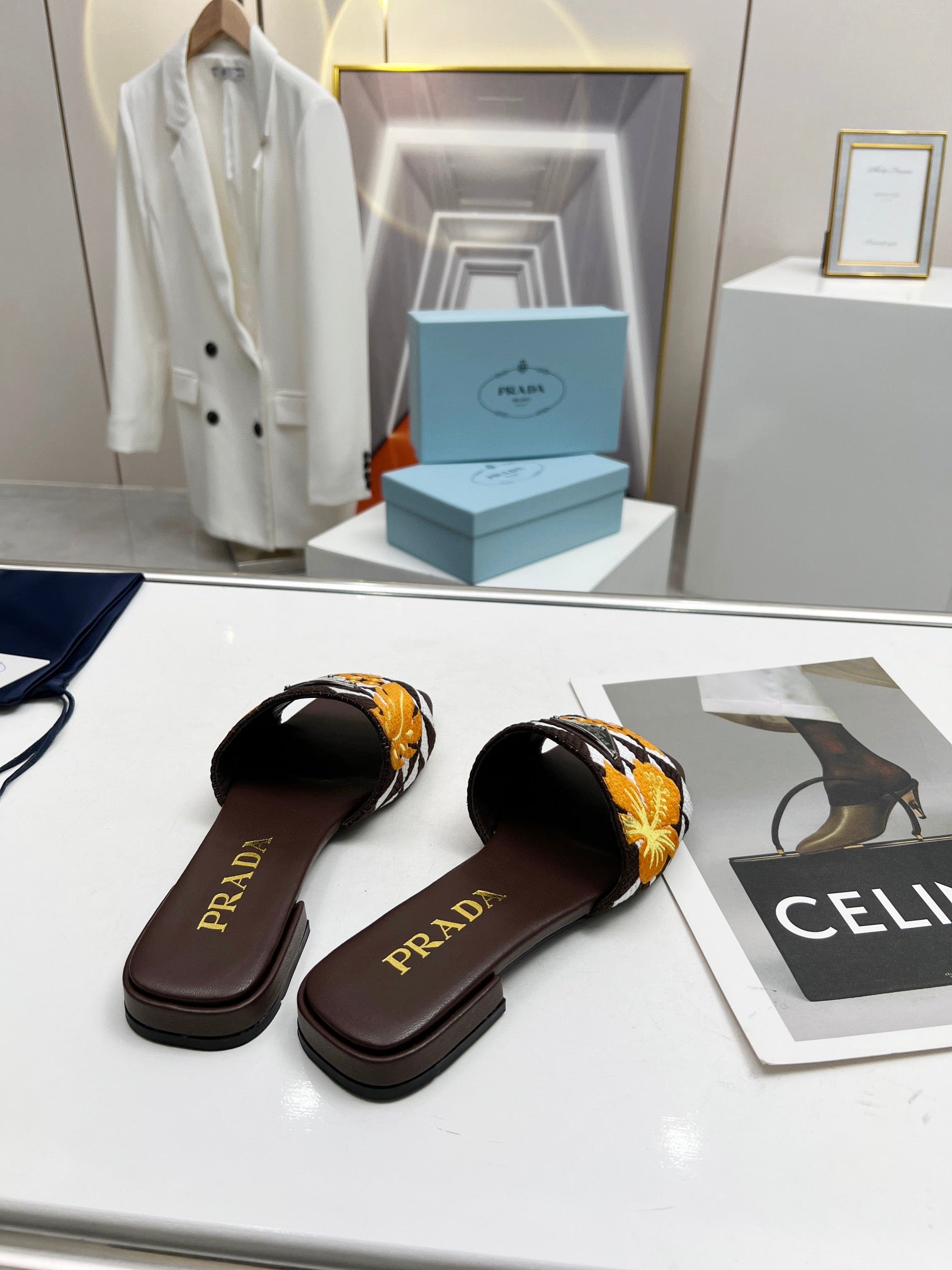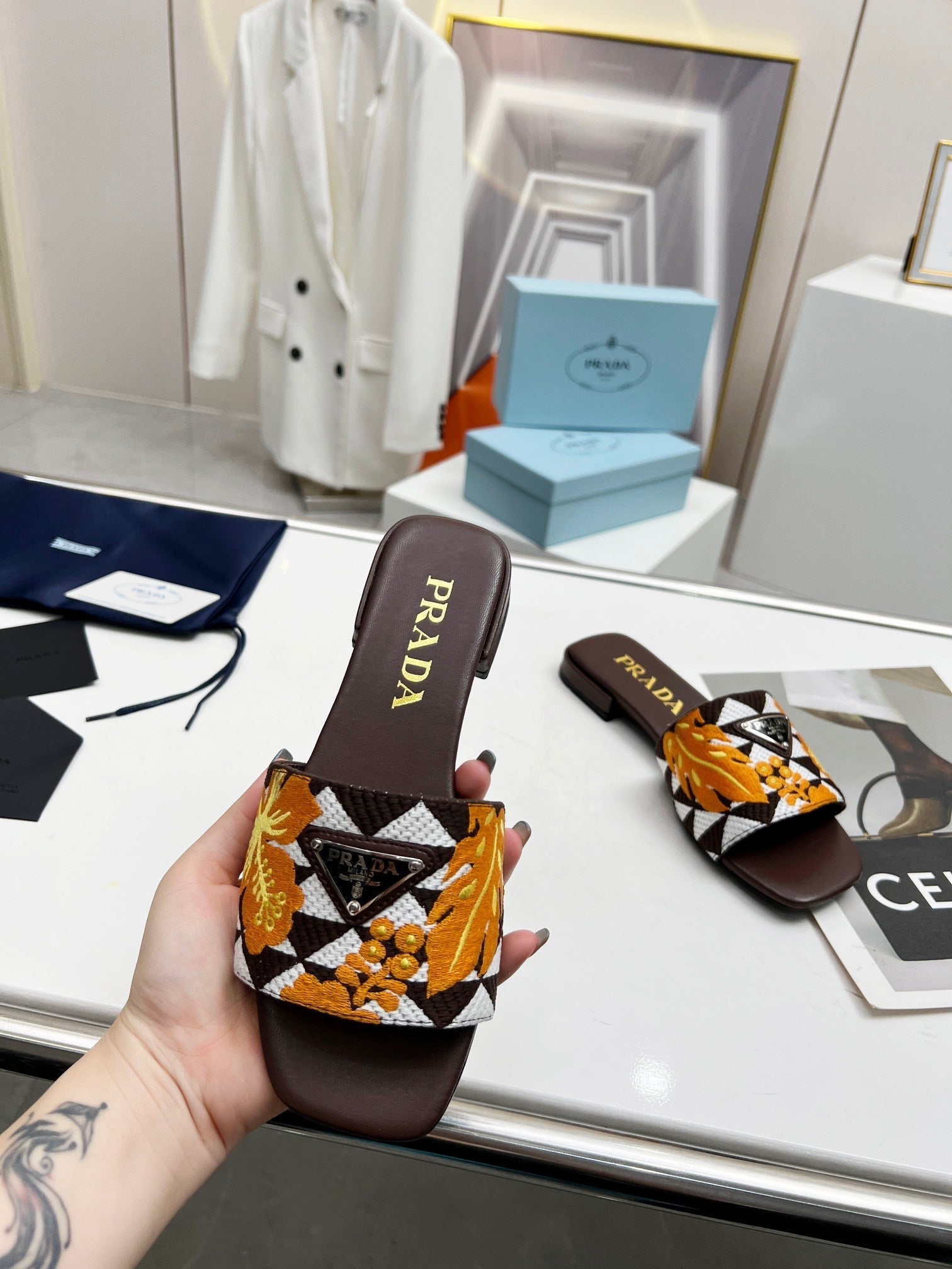 PRA EMBROIDERED SLIDES FLAT CHOCOLATE FABRIC