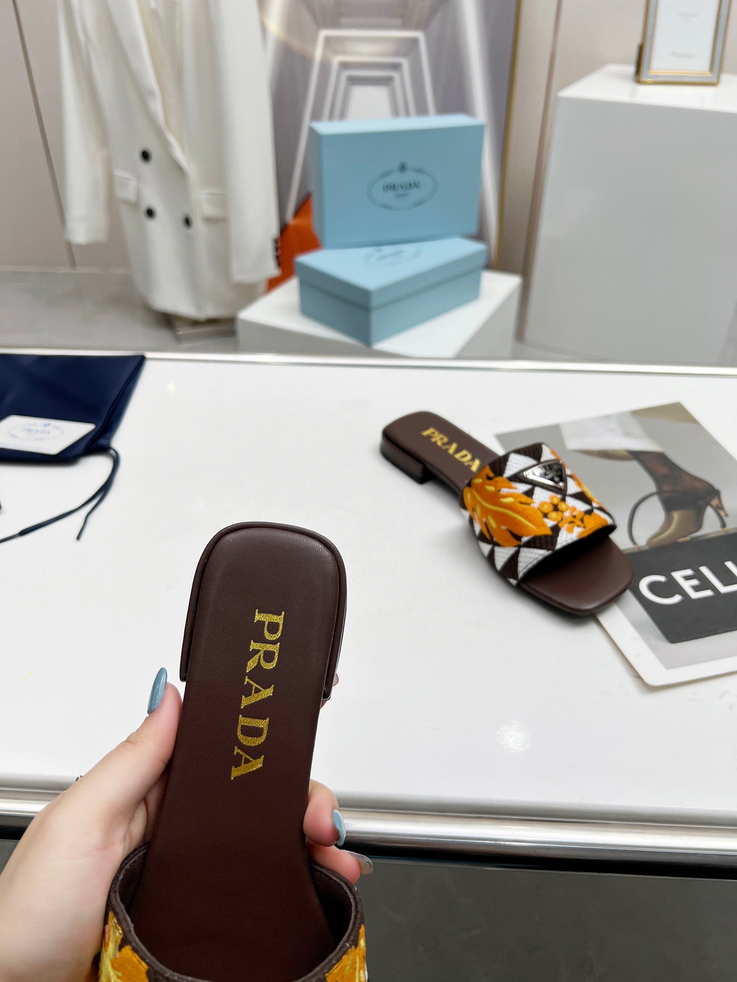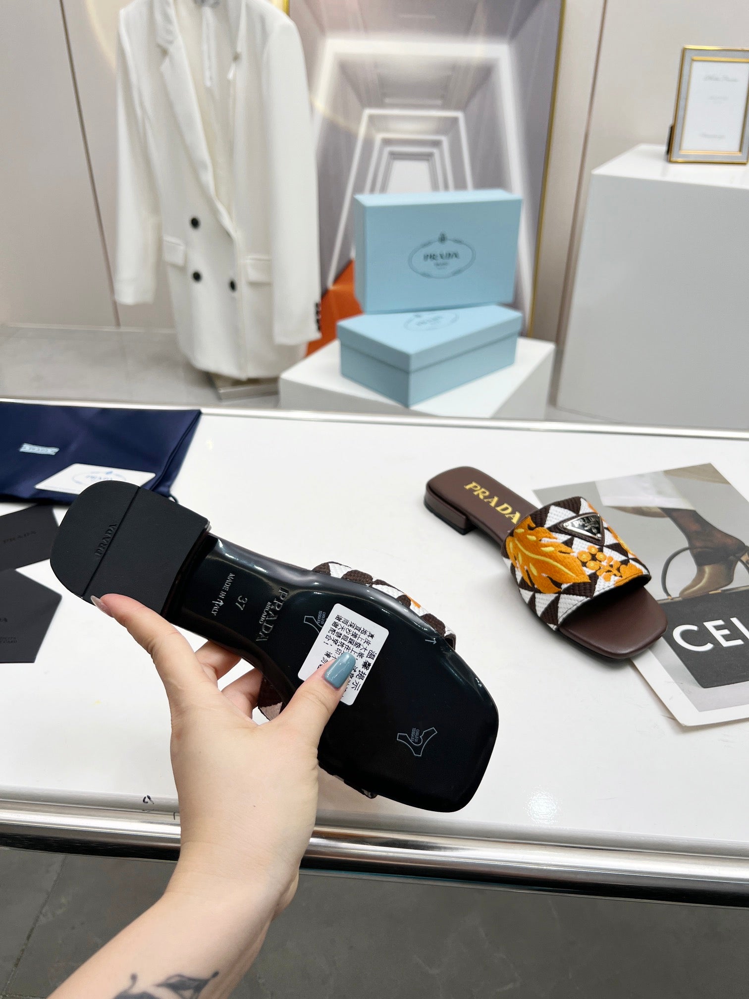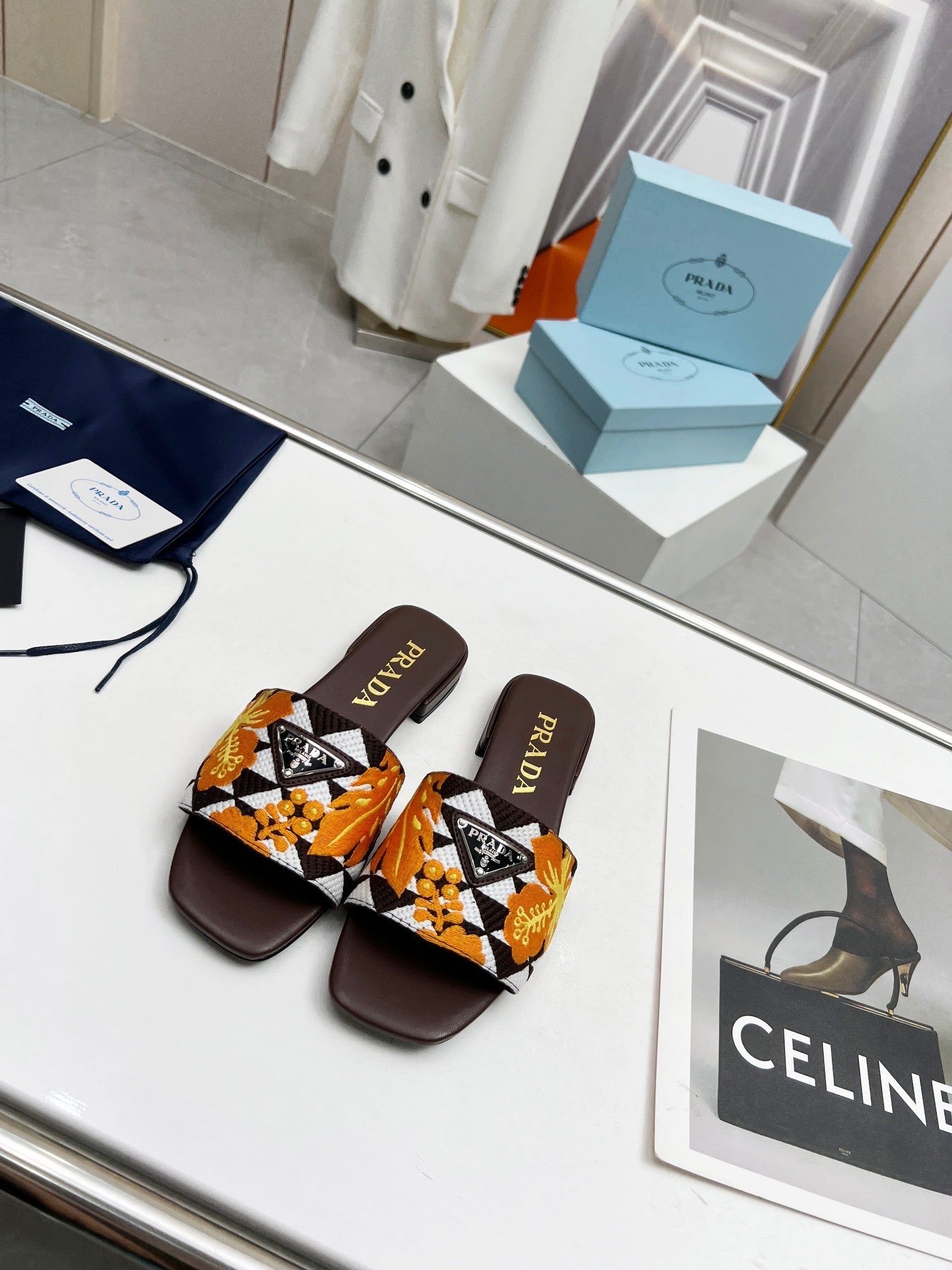 PRA EMBROIDERED SLIDES FLAT CHOCOLATE FABRIC
