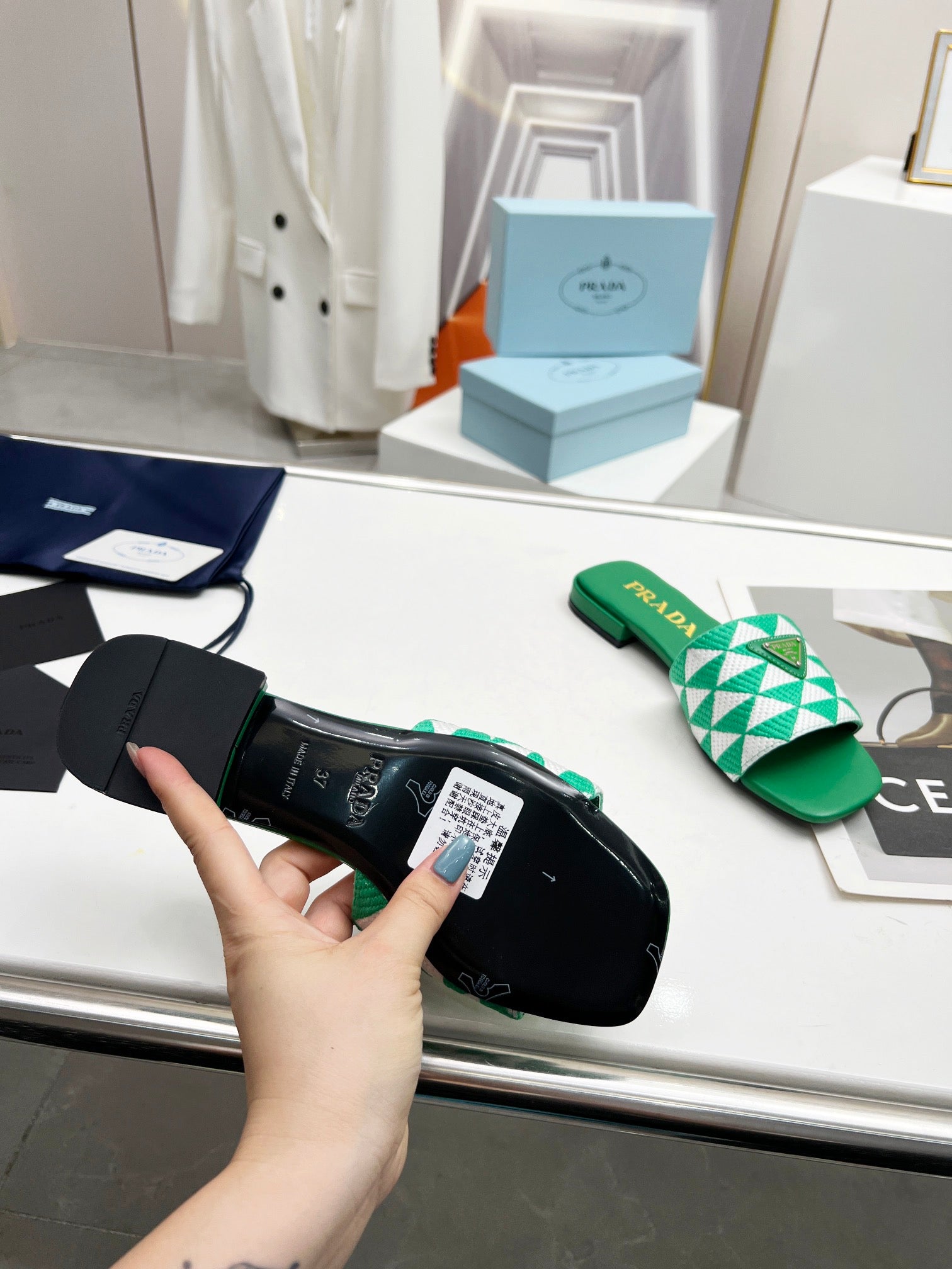 PRA EMBROIDERED SLIDES FLAT GREEN FABRIC