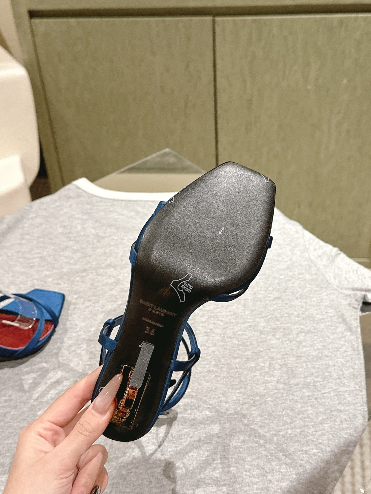 YSL 25S HIGH-HEEL SANDALS 100 MM IN DEEP NAVY BLUE SATIN WITH YSL LOGO HEEL DESIGN IN GOLD