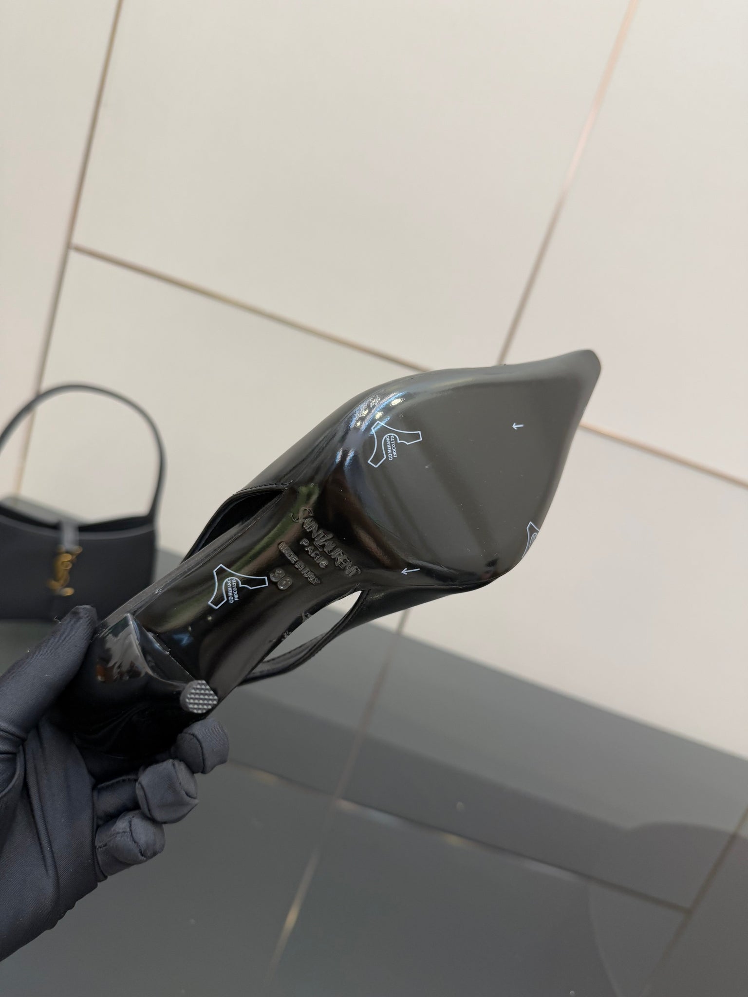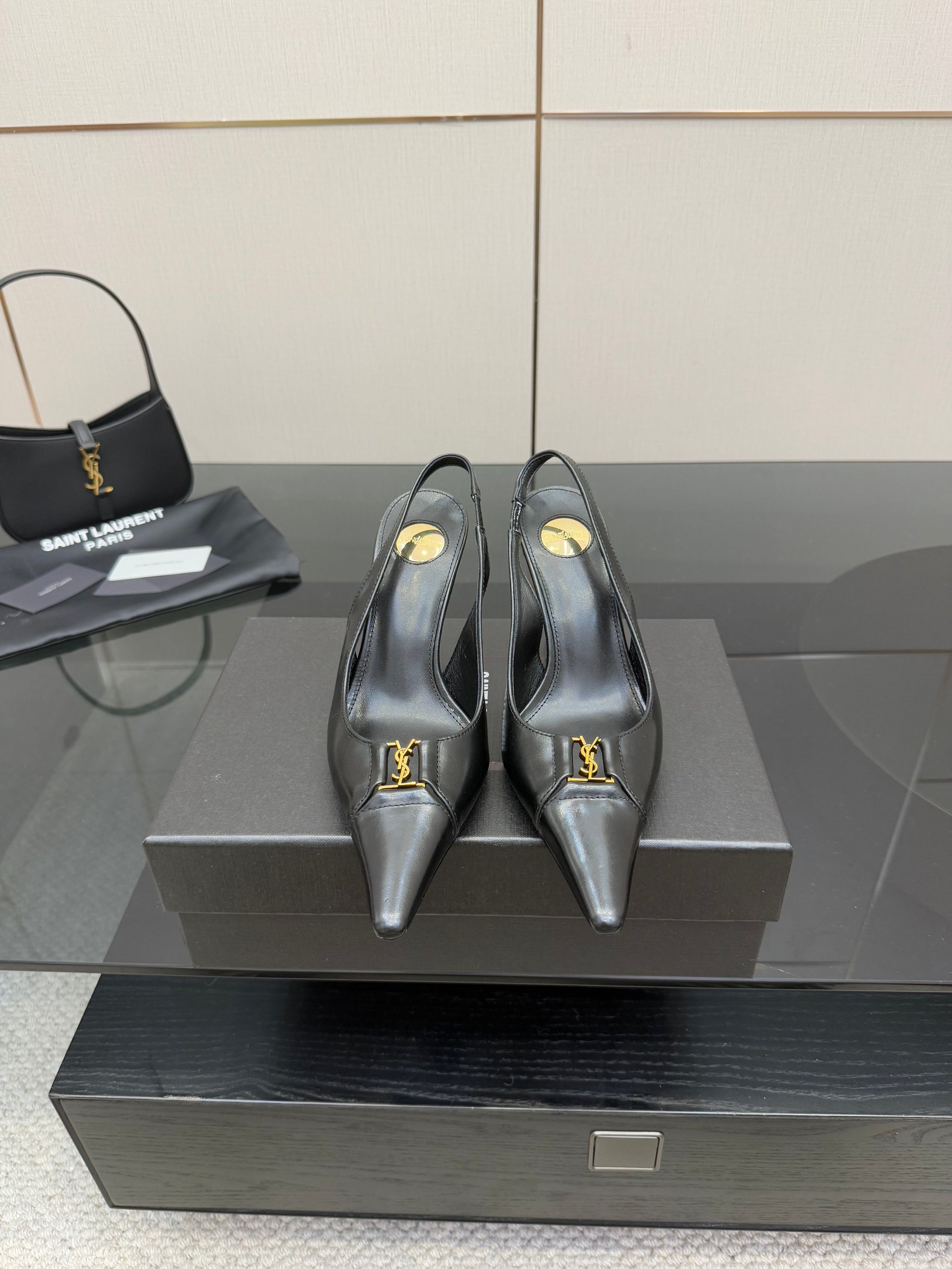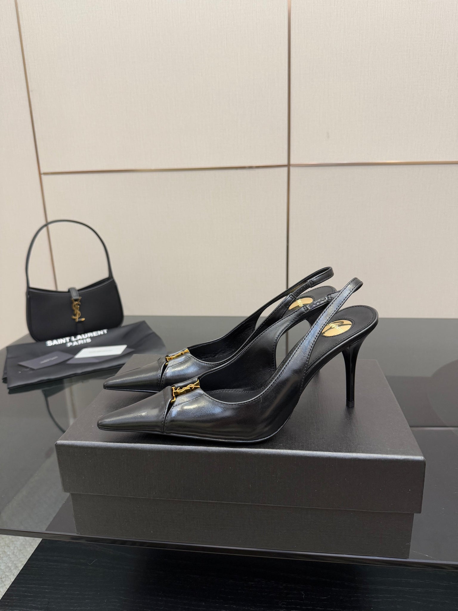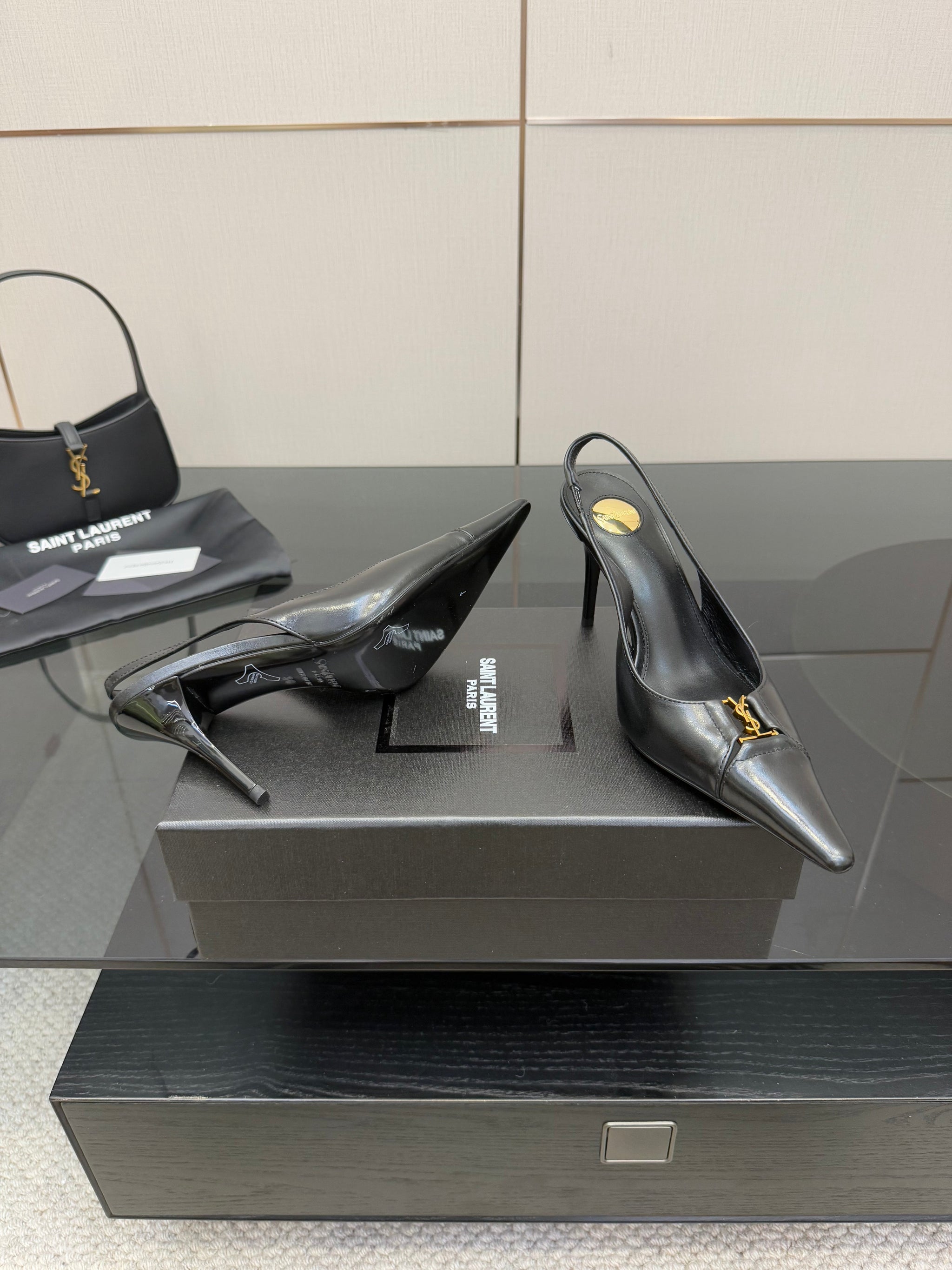 YSL 25S SLINGBACK HIGH HEELS 90 MM IN BLACK LAMBSKIN WITH GOLD HARDWARE STYLE 10