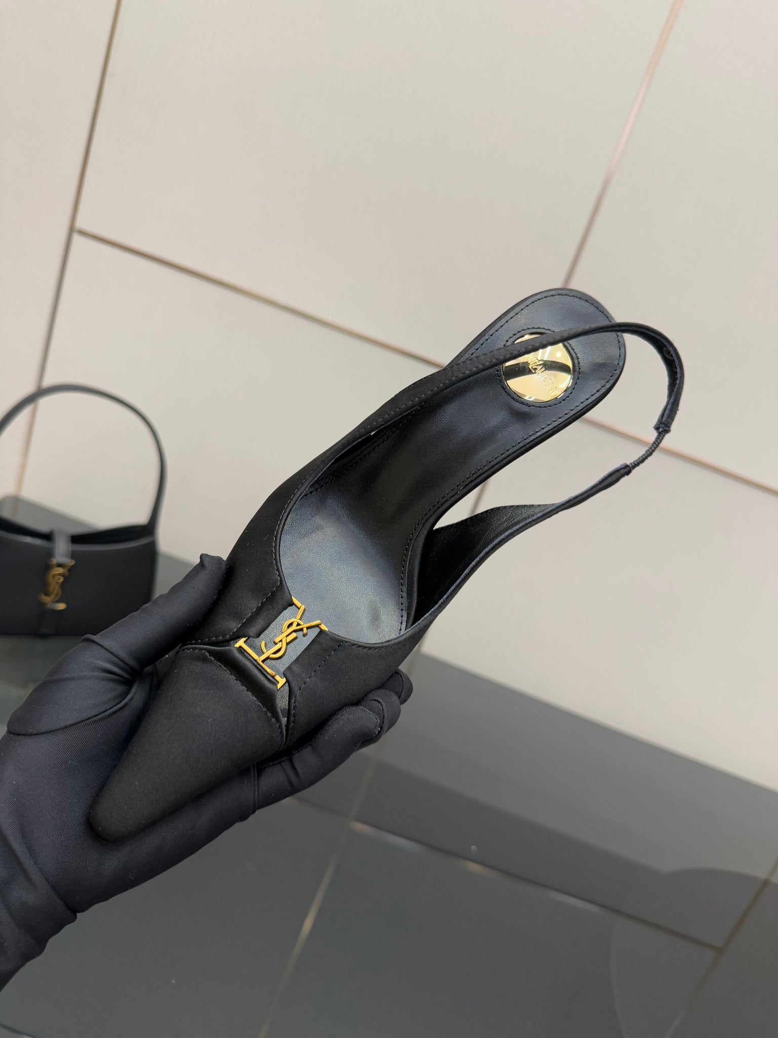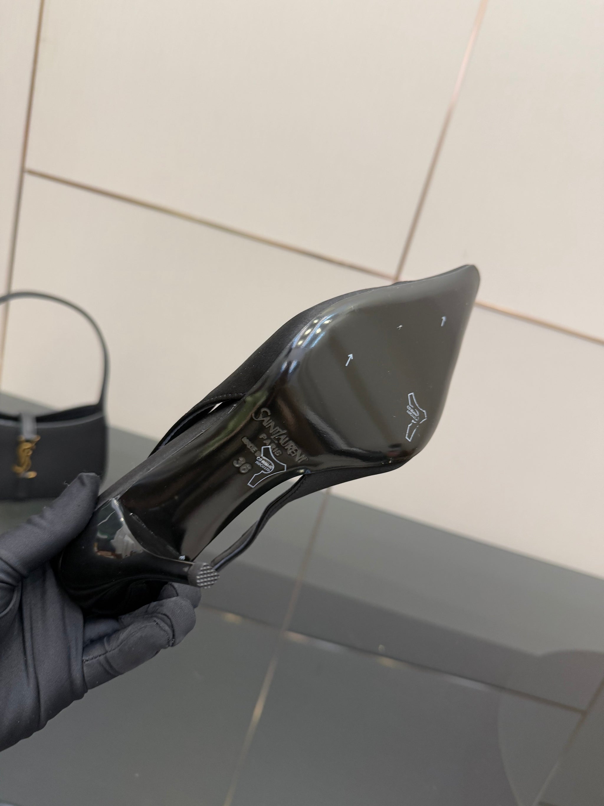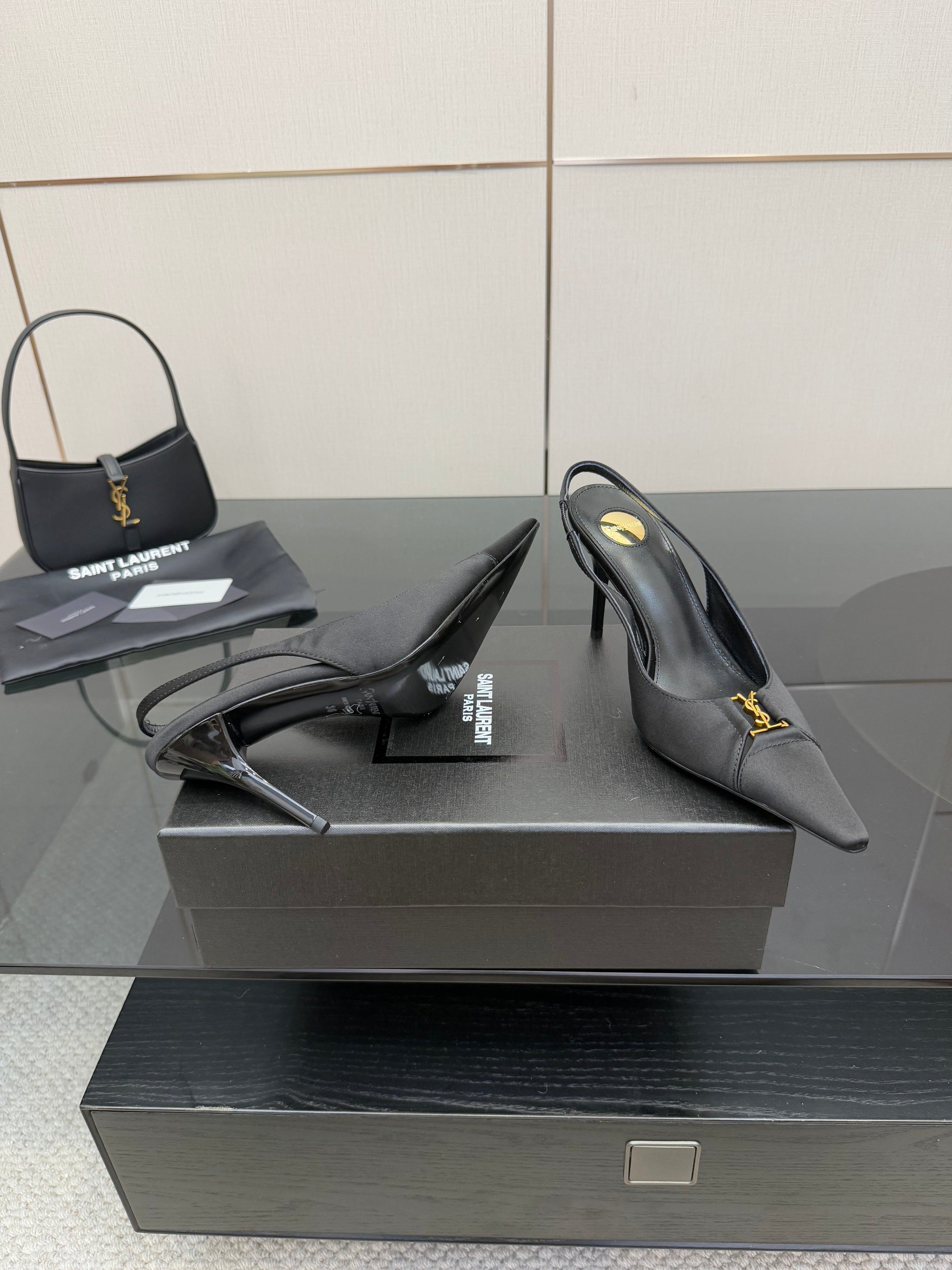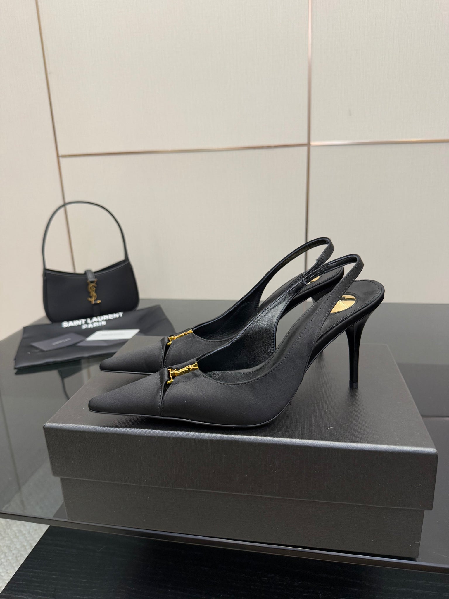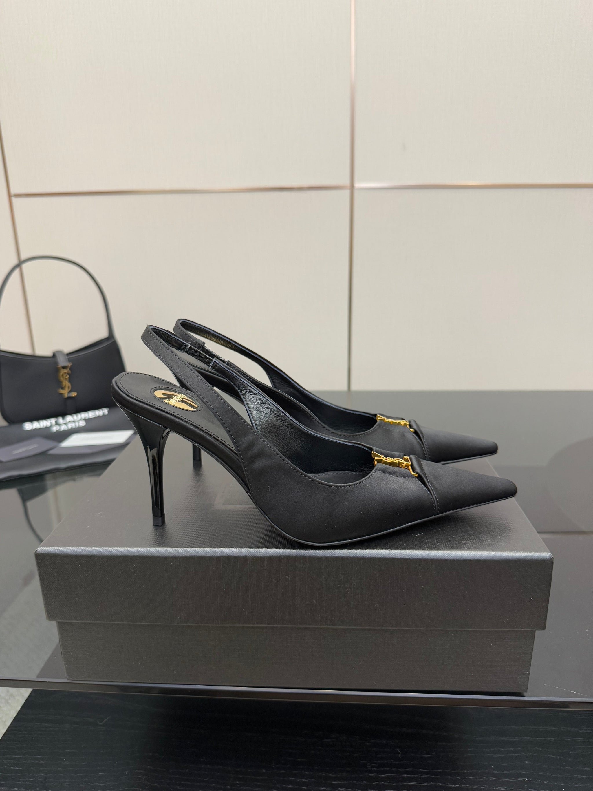 YSL 25S SLINGBACK HIGH HEELS 90 MM IN BLACK SATIN WITH GOLD HARDWARE STYLE 18